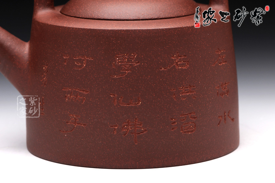 這款壺以傳統(tǒng)中的穩(wěn)重、樸拙為主要特色,將古色古韻演繹得淋漓盡致,可謂是大巧若拙的典范。從壺身來(lái)看,極似穩(wěn)重敦實(shí)的井欄造型,柱形壺身,上邊微 微收斂,簡(jiǎn)單明了。直流嘴幾乎是平斜而出,顯得孤單而清奇。嵌蓋微鼓,橋鈕壓蓋,如同秦權(quán)中壺蓋的造型,穩(wěn)重而又簡(jiǎn)單,同時(shí)很方便拿捏。整款壺穩(wěn)重而大氣,在氣韻上多一份則顯輕飄,少一分則覺(jué)沉重。在壺身上有曼生銘:“左供水,右供酒,學(xué)仙佛,付二手。”隸書的古雅大氣無(wú)形中增強(qiáng)了此壺的文化氣韻,使該壺底蘊(yùn)更深沉。