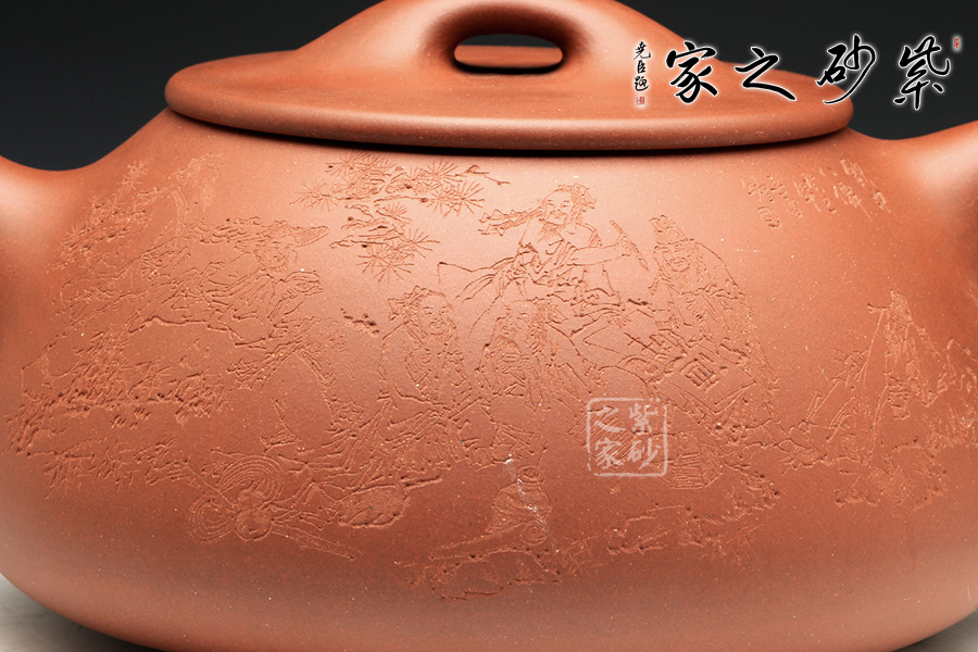 刻繪的唐朝時飲中八仙非常出名,人物形態(tài)更是傳神。背面的詩句“二月春風(fēng)洗紅塵,時光荏苒桃符新。舊日遺我黃山茶,如今把飲還醉人”獨有清思幽趣。