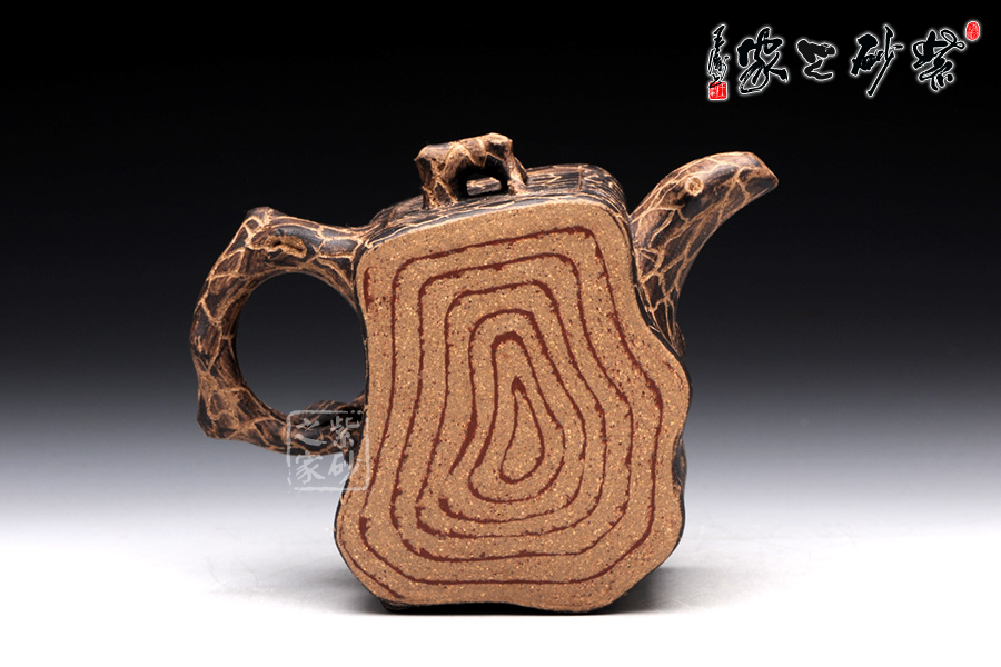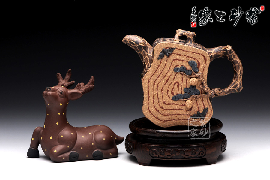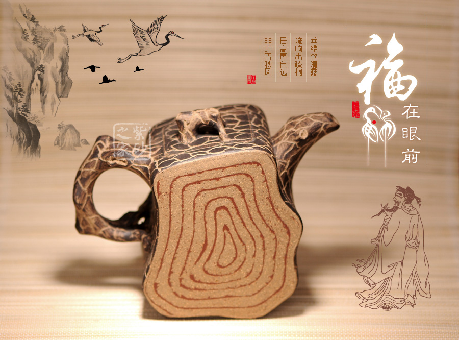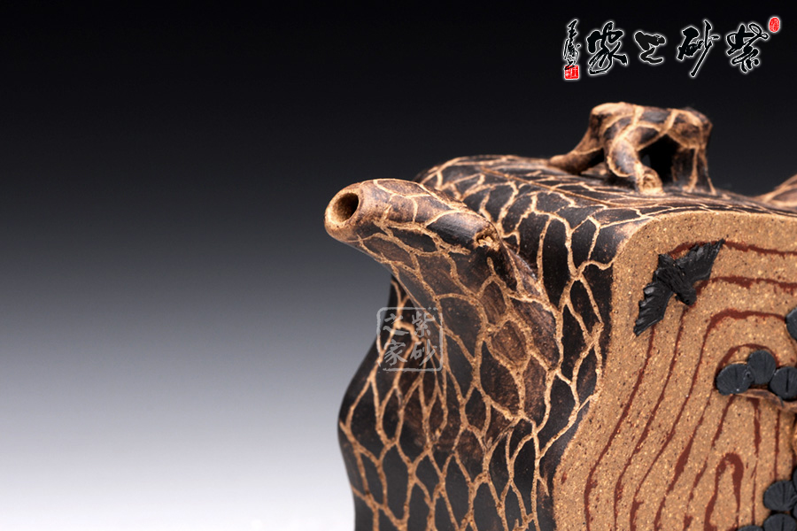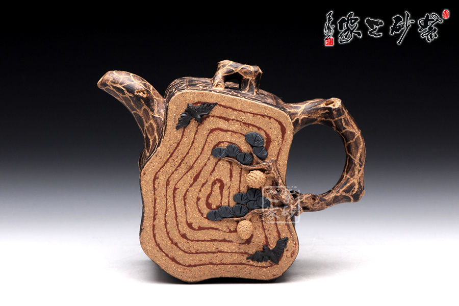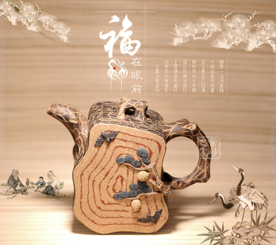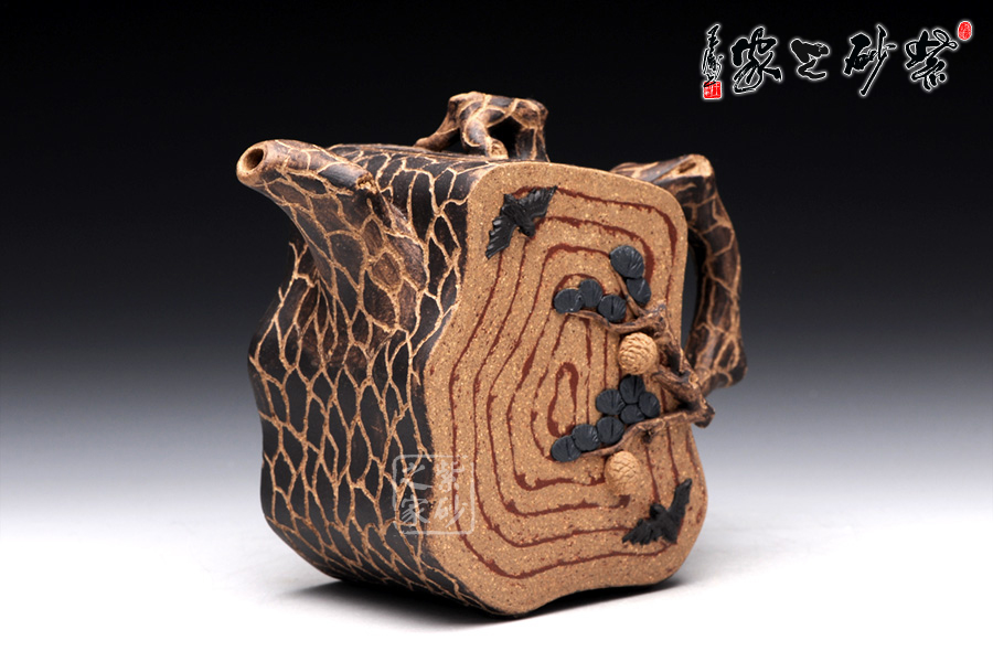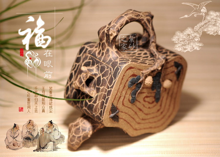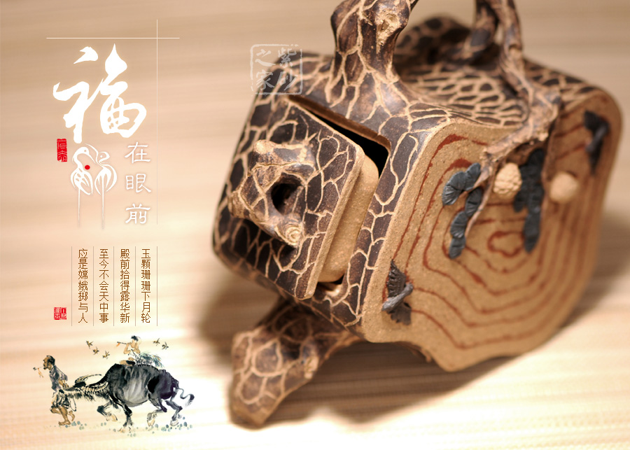 此壺名為福在眼前,名稱奇特,造型更可謂是別出心裁。該壺以松樹為原型,共用三種泥色精心制作而成。與其他以樹干為壺身的紫砂壺所不同的是,此款壺以松樹截面部分作為壺的正反兩面,創(chuàng)意極佳,同時(shí)效果更令人稱奇。松樹的年輪仿若優(yōu)美的花紋,裝飾著壺身,且此壺的造型猶若一個(gè)福字,祝福之意明顯。該壺的精妙之處還在于端把處胥出的松枝,松葉繁茂,松果豐滿,形象逼真。松樹的不老長青,同時(shí)也象征著人的長壽和健康,如此,此壺可謂是寄寓著福氣滿滿之意。該壺是壺中的藝術(shù)品,也是壺中的吉祥品,贈(zèng)送和把玩皆佳。