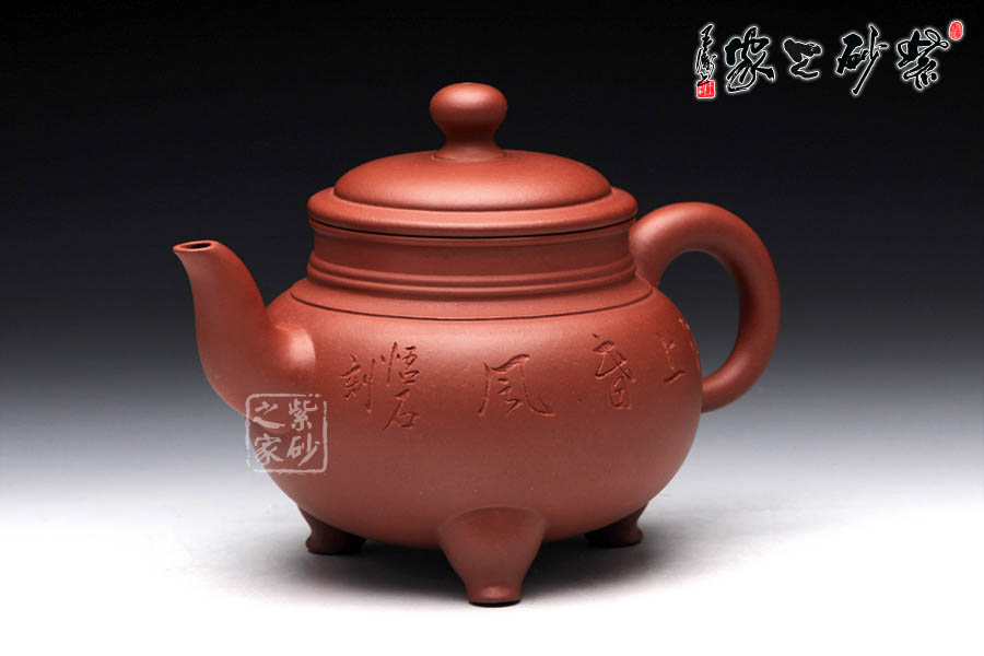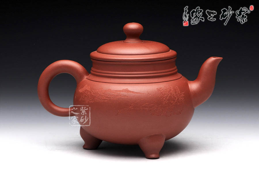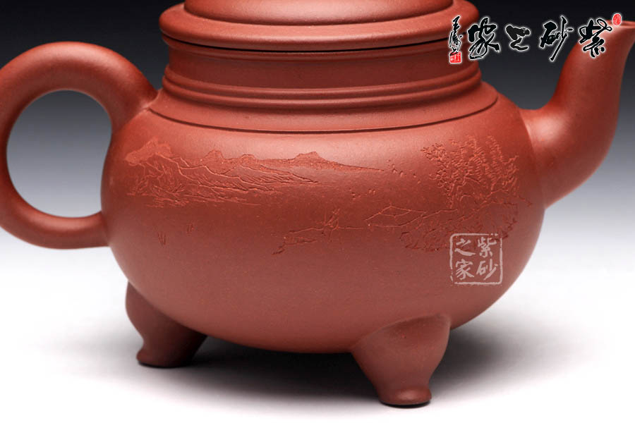 三足之勢,穩(wěn)重霸氣,雖靈巧卻不失大度;品啜芳茗,神情灑脫,三足鼎立千軍一發(fā)之際,渾然乾坤靈氣,一把盡收。壺口高聳,壺鈕更是雄踞頂峰,將鼎的氣勢襯托得淋漓盡致,壺嘴與壺把都是經(jīng)典的造型,韻味厚重而不乖張,給人極其自然的感受。 壺身的篆刻由陶刻大師悟石操刀,篆刻了四個大字“江上春風(fēng)”,仿若一陣柔和的春風(fēng)拂面。壺背面刻繪了一幅優(yōu)美的山水畫,山川秀麗,亭臺樓閣若隱若現(xiàn),煙波浩渺,濃濃春意隨波蕩漾。此壺意趣深遠,實用更便于把玩。