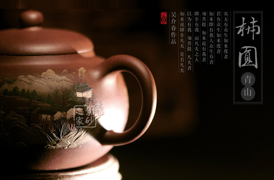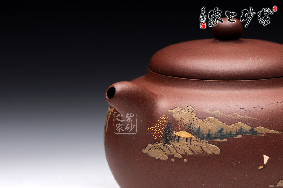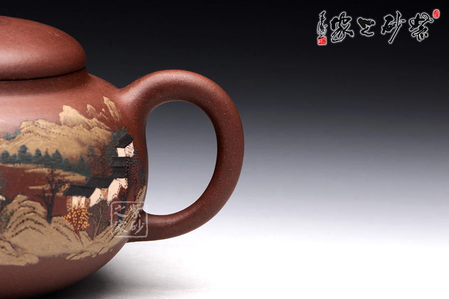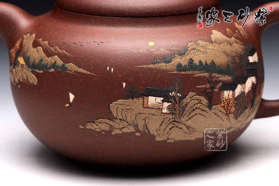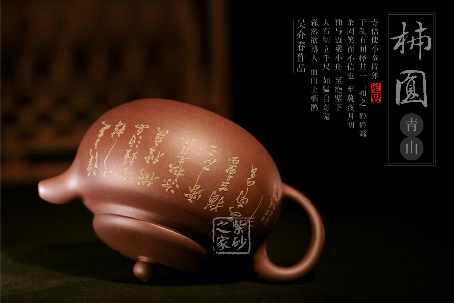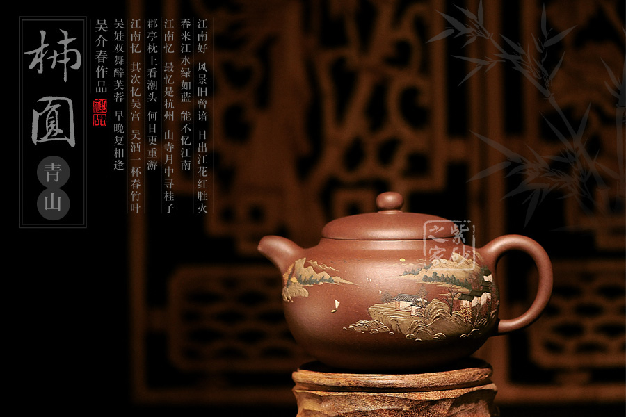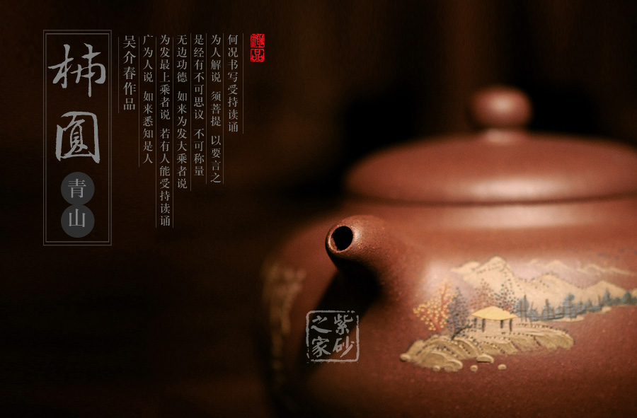 此壺名為泥繪柿圓,顧名思義,該壺是采用泥繪的裝飾工藝制作的一款柿圓壺。柿圓壺是紫砂壺中的經(jīng)典款型之一,寓意事緩則圓,且具有豐收和吉祥的意思。此壺出自吳介之手,精選原礦紫泥制成,細膩柔和,色澤厚重。吳介春國家級高級工藝美術(shù)師,師從徐秀棠大師和高級工藝美術(shù)師尹祥明。該壺正面泥繪了屋舍,松林,山川,河流和帆船,近景清晰,遠景悠悠渺渺,形象生動,一派祥和寧靜的鄉(xiāng)村景象。壺反面泥繪了一首詩:“溪上遙聞精舍鐘,泊舟微徑度沈松,青山霽后云猶在,畫出西南四五峰”。此壺不論是造型色彩還是壺所寄寓情趣和理念,皆值得玩味,該壺值得珍藏。
