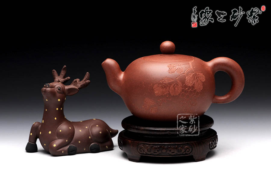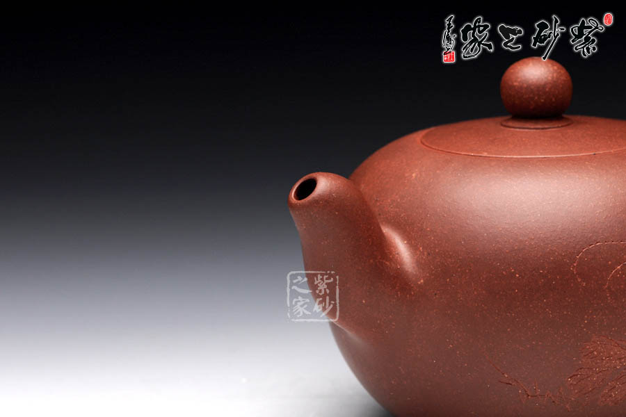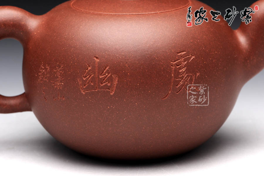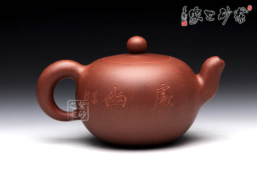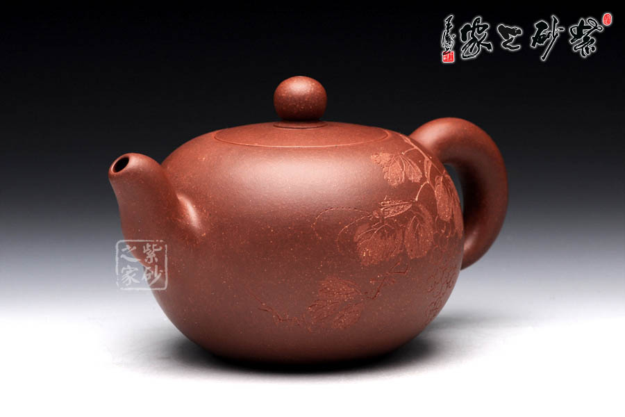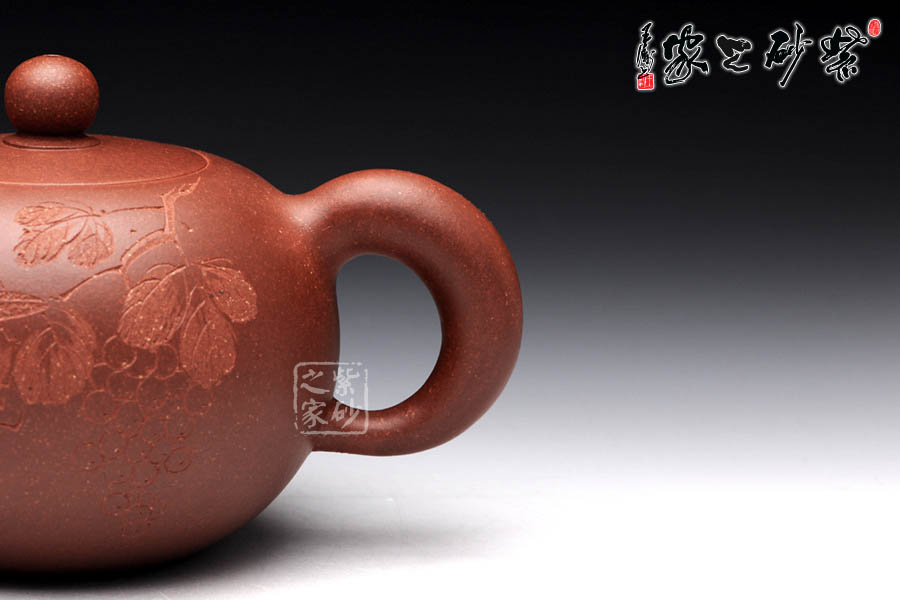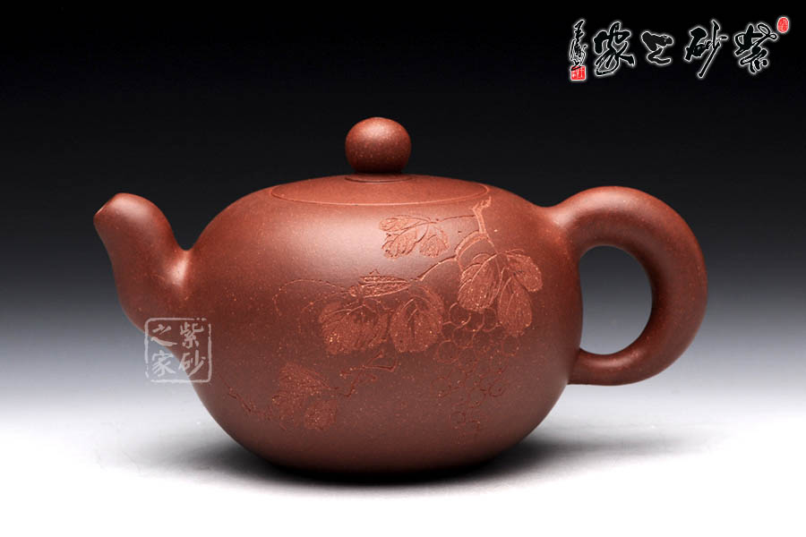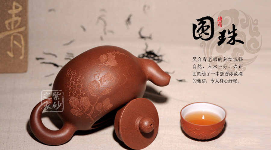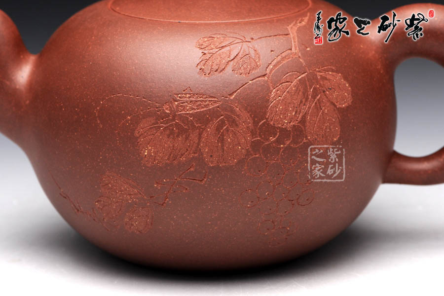 圓珠壺精選原礦底槽清泥料制成,泥質(zhì)醇厚,色澤古穆。此壺造型同一粒珠,如同一顆飽滿而晶瑩的珠子,圓珠造型端莊,古韻盎然,莊重又不乏新意,典雅大氣又不失陽剛之氣,飽滿的圓珠著實(shí)惹人喜愛,欣賞此作品感覺可以使人清心安靜,來洗滌塵間煩躁的心情。吳介春老師的刻繪流暢自然,入木三分。壺正面刻繪了一串想香濃欲滴的葡萄,令人身心舒暢,壺反面刻繪了“處幽”二字,此壺所傳遞生活情趣顯而易見。