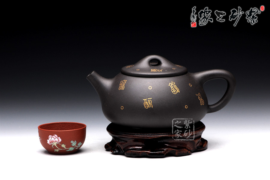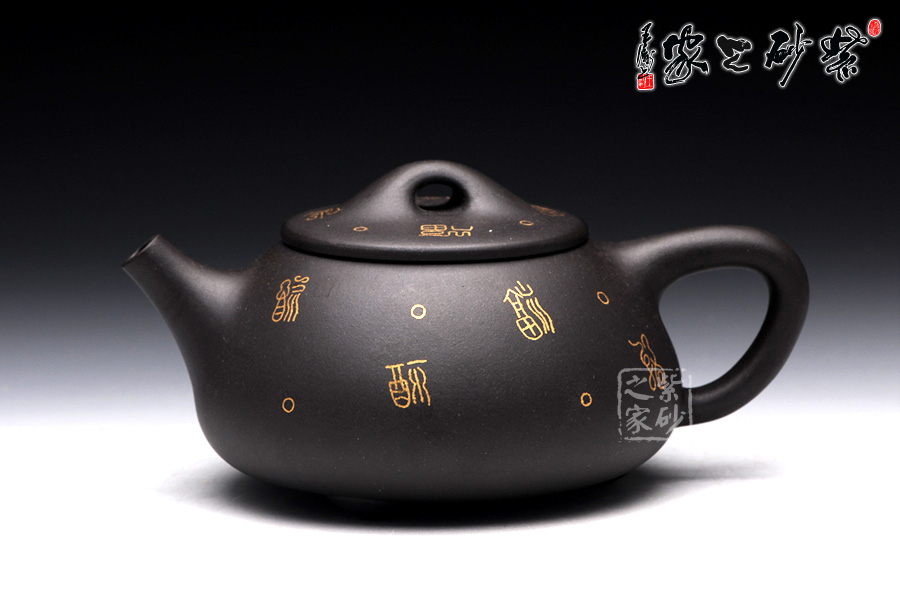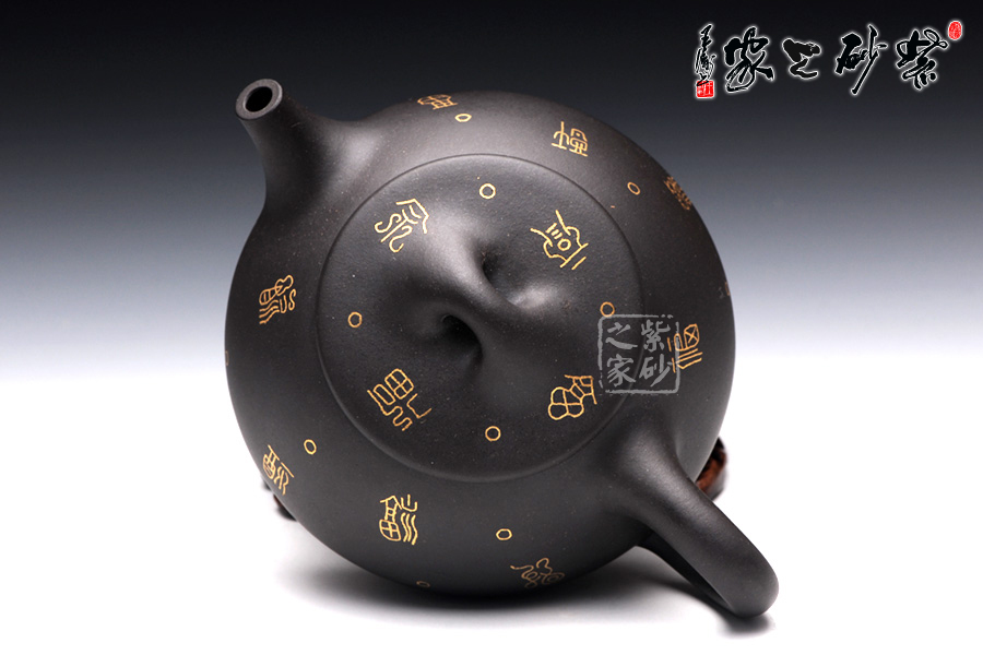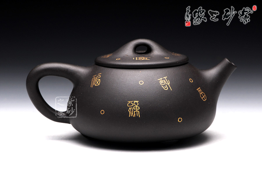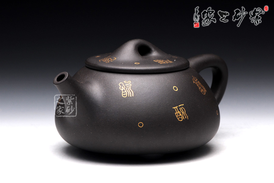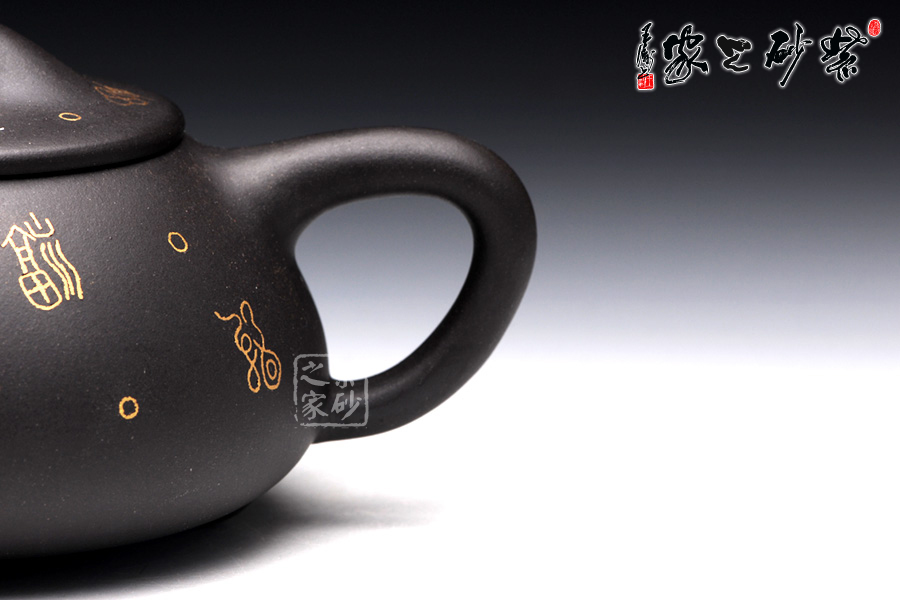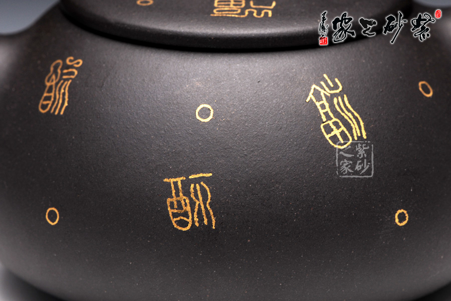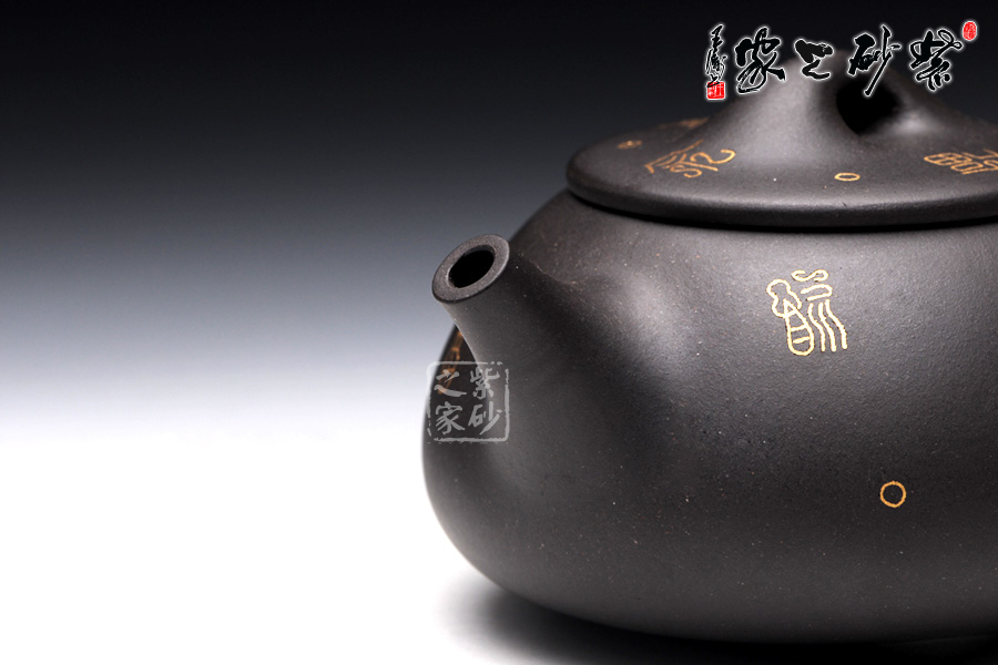 黑泥,其色如墨,似黑夜浩瀚天際,深不可測,配以點點金砂,直如天星閃爍,高掛暗夜長空;神秘靜寂、引人神往,故歷來深受世人鐘愛。作為一款傳統(tǒng)且經(jīng)典的紫砂器型,丁小明老師此款黑泥石瓢與以往的石瓢有著不同的風(fēng)格,老師在泥料選擇與搭配上顯得特別講究,黑泥的沉穩(wěn)與另一種明朗活潑的泥料相應(yīng)和,顯得整款壺氣韻高雅,與眾不同。壺體采用鑲金的裝飾手法寫滿“福”字,表示福氣滿滿,更增添了幾分大吉大利之意!此壺橋形壺鈕,中間略顯平整,整款壺更加穩(wěn)重。壺身較矮,飽滿的壺身,從整體來看,此壺的的流把均顯細(xì)膩,直流嘴挺峭而出,與壺把的三角形相應(yīng)和,壺柄外圓內(nèi)方,不僅預(yù)示著方圓之道,與壺鈕的形態(tài)形成對應(yīng)。該壺值得珍藏和把玩。