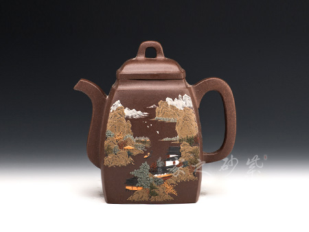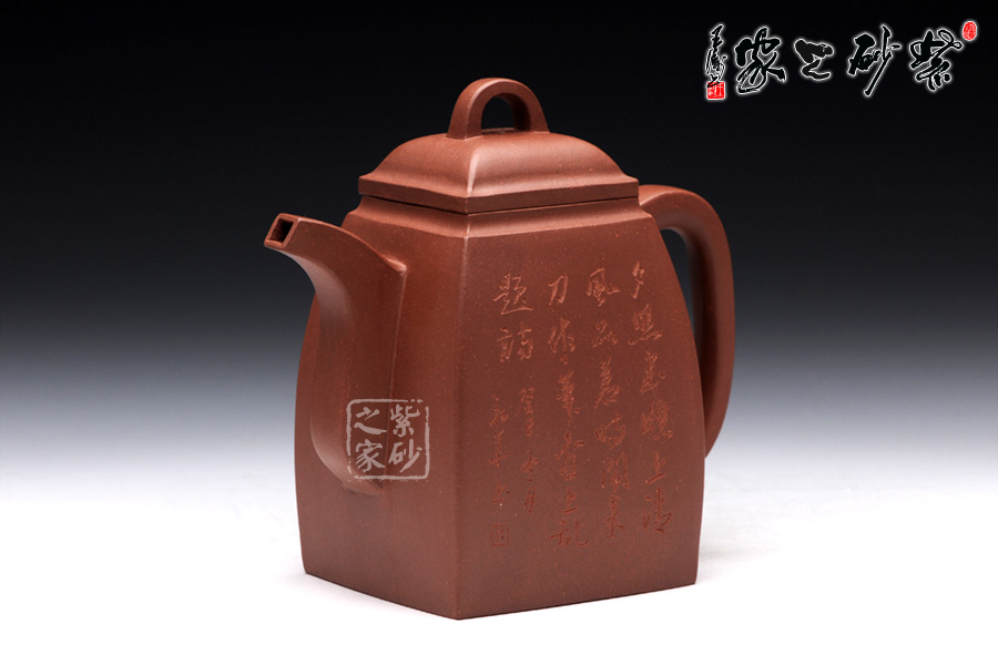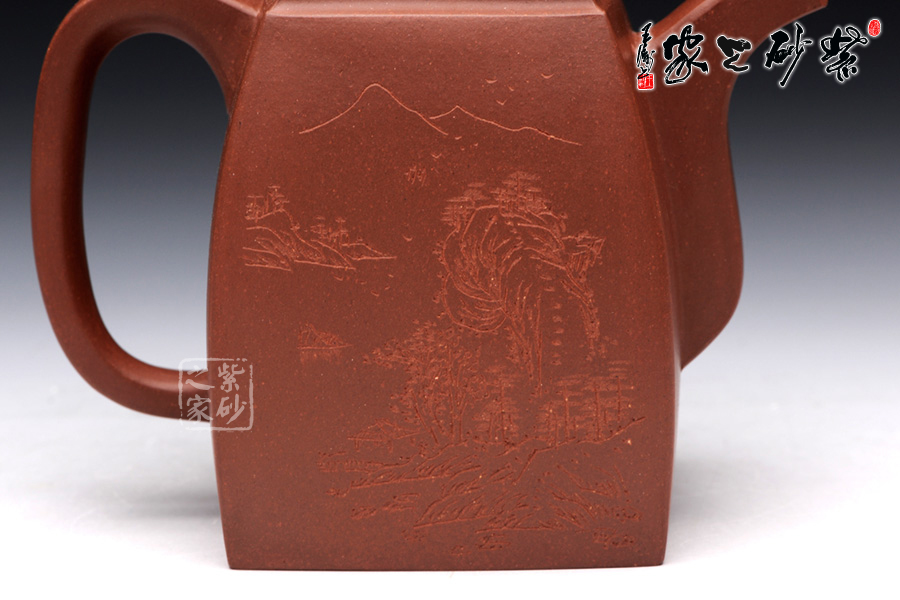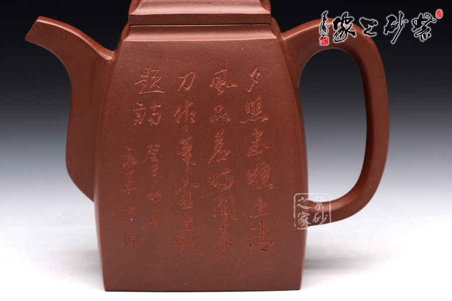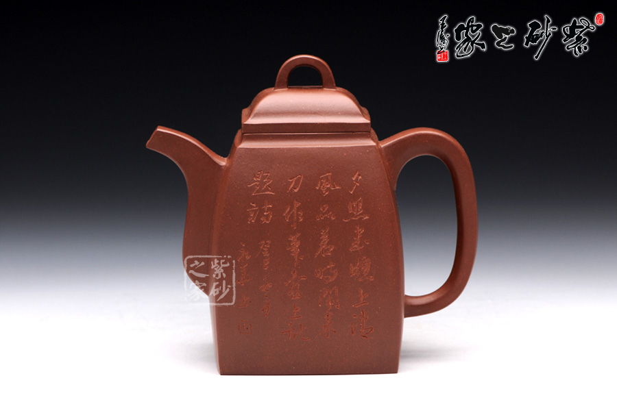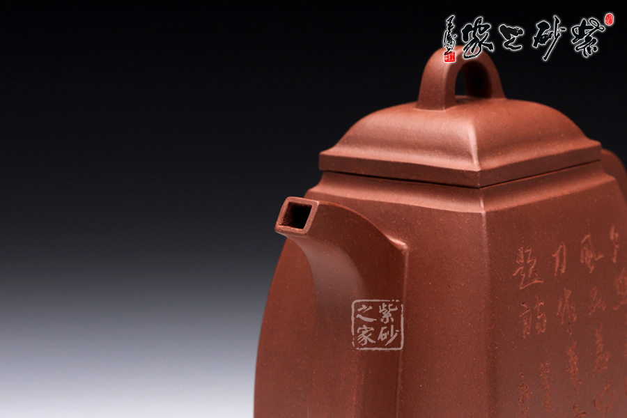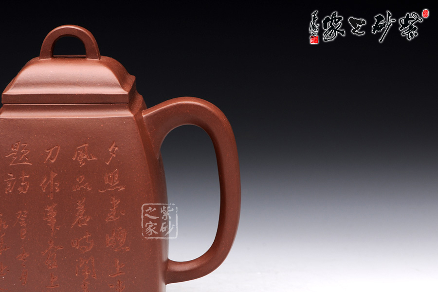 精選原礦底槽清泥料制成的此漢方,泥質(zhì)醇厚,色澤古穆。容量?jī)H為290cc,故名為小漢方。漢方壺是方器中經(jīng)典器型之一,穩(wěn)重大方而不失雅致是對(duì)漢方的描述,這款純手工制作的漢方棱角分明,非常惹眼,器型大氣飽滿,線條流暢豐美,氣勢(shì)非凡, 令人賞心悅目,原礦底槽清精制而成,精雅而不失古樸風(fēng)味,加之曲線與直線的完美結(jié)合,作品方中見圓,圓中有方。該壺采用刻繪裝飾工藝,壺正面刻繪的是“夕 照書窗上,清風(fēng)品茗時(shí),閑來刀作筆,壺上亂題詩(shī)”,壺背面刻繪的是一幅山水畫,形象逼真,遠(yuǎn)景悠然,近景清晰。此壺所傳遞生活情趣不言而喻。