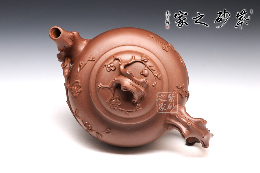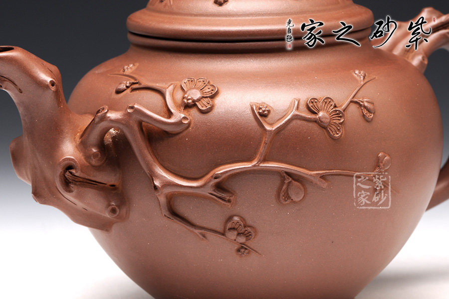 報春壺是花塑器中的傳統(tǒng)壺型, 本壺造型以“心型”為身,梅花枝梗為流、把、鈕。枝和節(jié)分布置合理,構(gòu)圖巧妙,伸展自然,視壺如聞梅花之暗香浮動。梅花雕刻傳神寫意,梅花或含苞,或怒放,把梅花的衰而不老,一樹獨先天下春的頑強精神,刻劃得淋漓盡致,妙不可言。