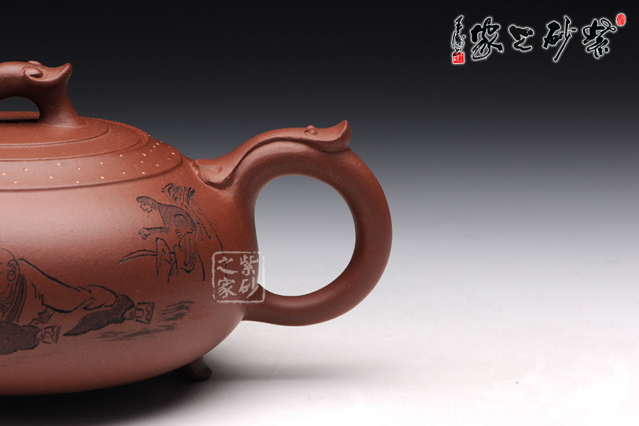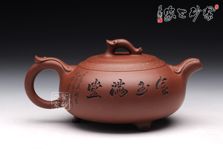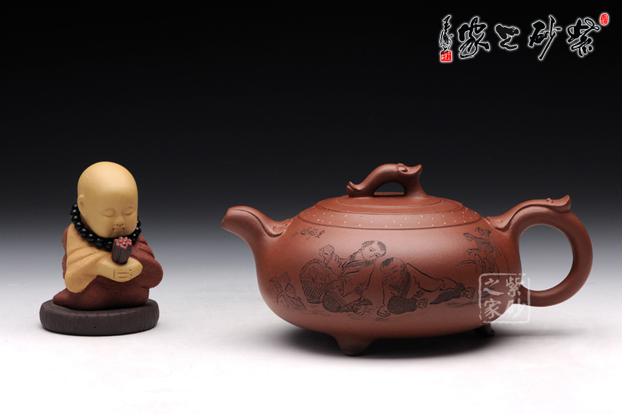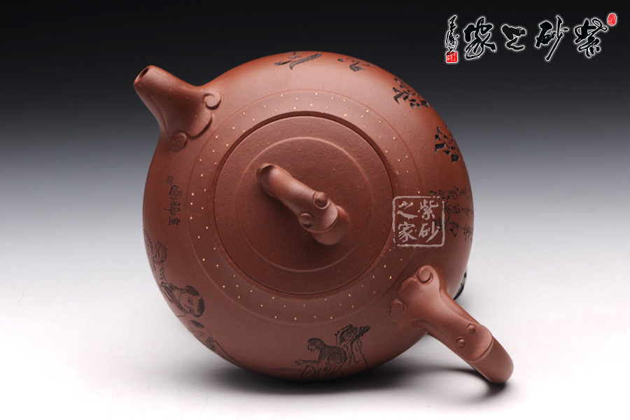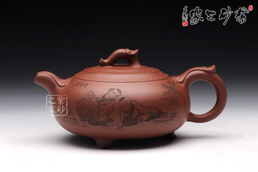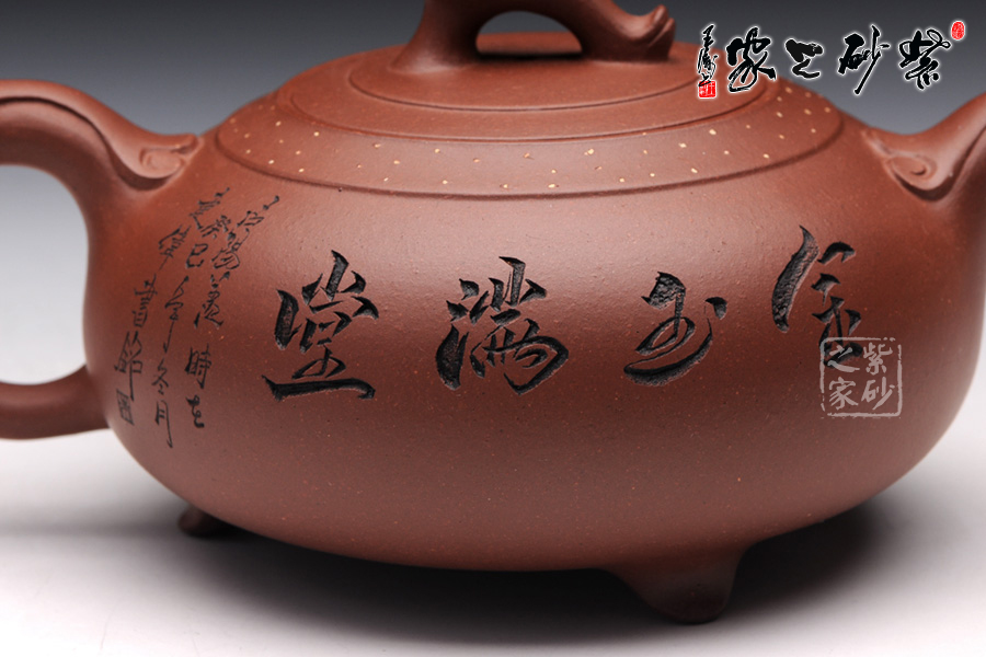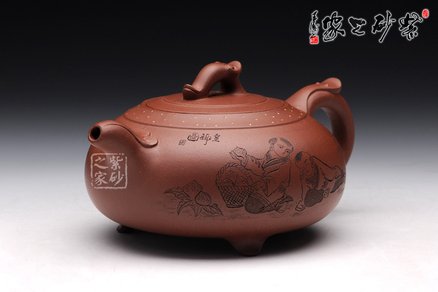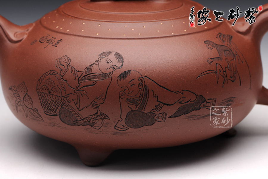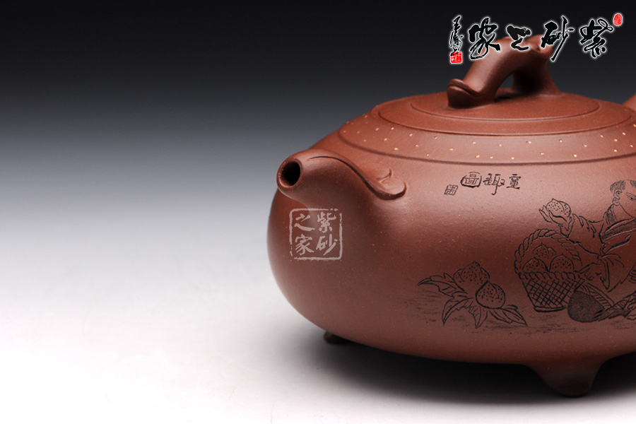 朱萍萍的此款金玉滿堂,造型新穎美觀,壺嘴、壺把和壺鈕處皆有如意紋裝飾,儒雅精致,細(xì)細(xì)觀之,猶若蛟龍飛游其上,意趣橫生。壺口處采用鋪砂制壺工藝,由乳黃色的小點(diǎn)做裝飾,雅趣十足。該壺的刻繪皆由其父朱建偉完成。壺正面刻繪了一幅孩童摘桃的畫面:一猴蹲于桃樹上,眉眼傳神。仙桃既大又圓,鮮嫩適口,一童把桃入筐,一童從旁玩耍嬉戲,兩人神情愉悅,場面歡快不已。壺背面刻繪的是“金玉滿堂”,字體古雅大氣,藝術(shù)氣息濃厚,濃濃的生活樂趣漾然于壺上,令人回味無窮。此壺值得把玩和珍藏。