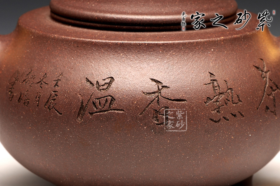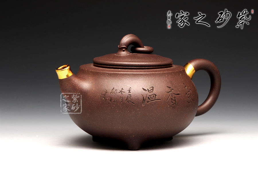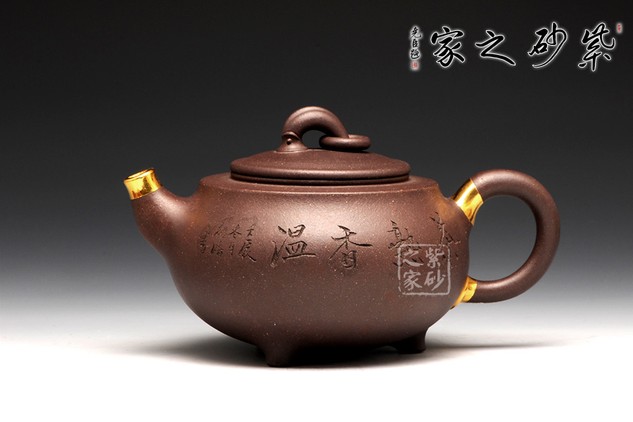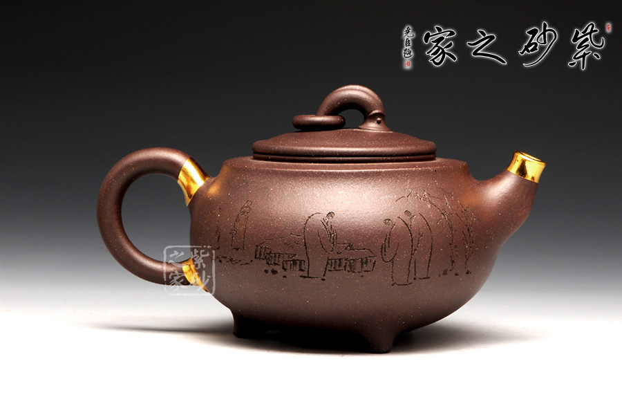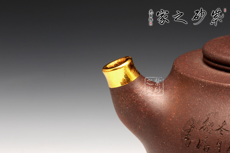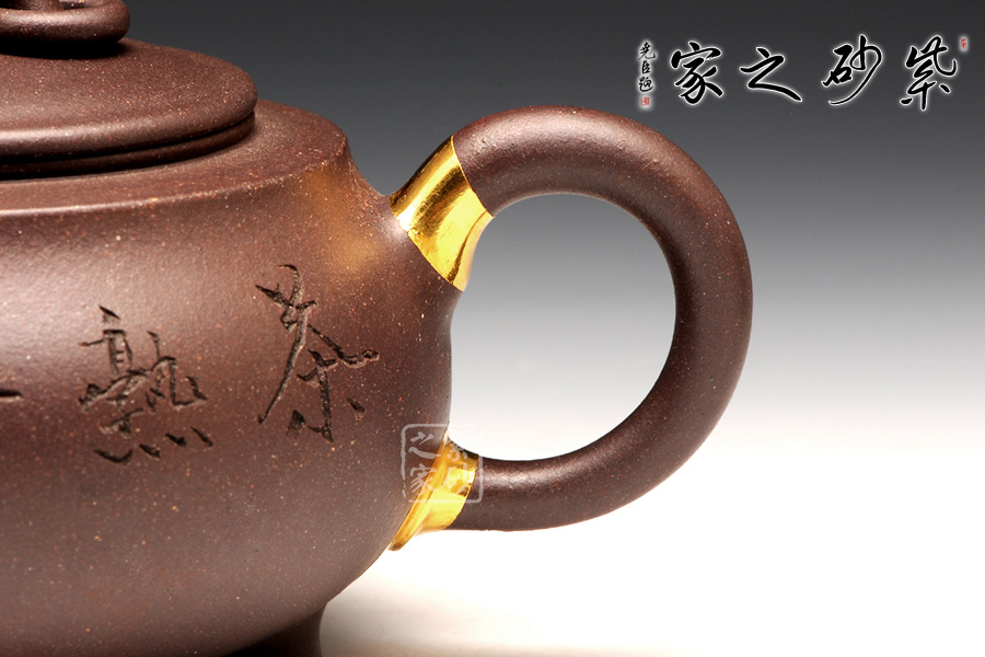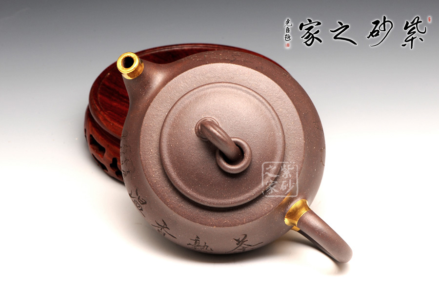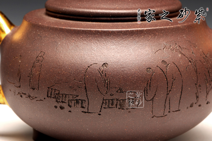 精選原礦紫泥制成的此壺,泥細(xì)膩柔和,色澤厚重,底蘊(yùn)深沉。壺嘴和壺把皆采用包金裝飾工藝,于古雅中滲透著吉祥和喜慶之味。壺身線條優(yōu)美,朝天直流嘴,粗細(xì)變化明確;壺鈕的處理極富新意,以變形橋鈕彎曲有度,與壺蓋銜接處兩紫砂泥制圓環(huán),穿環(huán)而入,好似傳統(tǒng)壺式中提梁,彎曲自然,傳遞吉祥之美好夙愿。壺身銘文“茶熟香溫”,為制壺者顧婷之父中國(guó)工藝美術(shù)大師顧紹培親題;壺身反面所刻的是烹茶待客圖,畫面抽象而富有深意,畫風(fēng)中禪意悠悠,令人心生敬畏之情。
