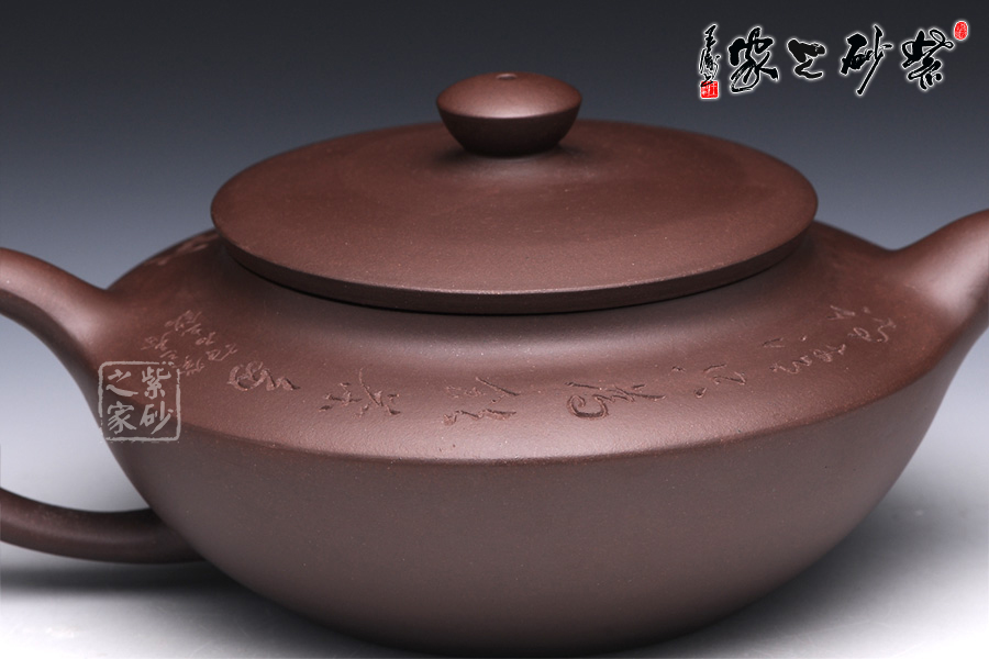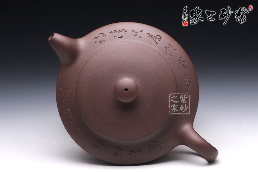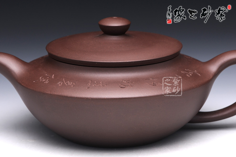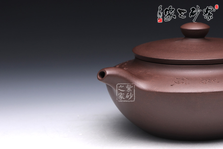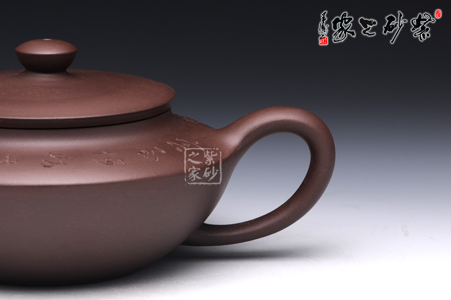 漢扁壺乃是經(jīng)典壺型,此壺是上下兩半對(duì)接而成,線面挺括,平蓋壓口,氣勢(shì)強(qiáng)悍,柱形壺鈕,簡(jiǎn)潔爽快;一彎流壺嘴俊俏自然,出水爽利,和耳形端把相應(yīng) 成趣。該壺采刻繪裝飾工藝,于壺的上半身刻繪了“客至何妨煮茗候,詩清只為飲茶多”,既是寫此壺所泡之茶,也是在訴說一種人生哲理,意味深遠(yuǎn)。
