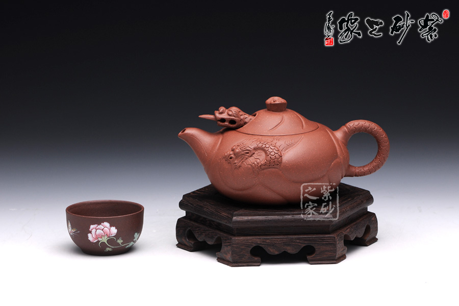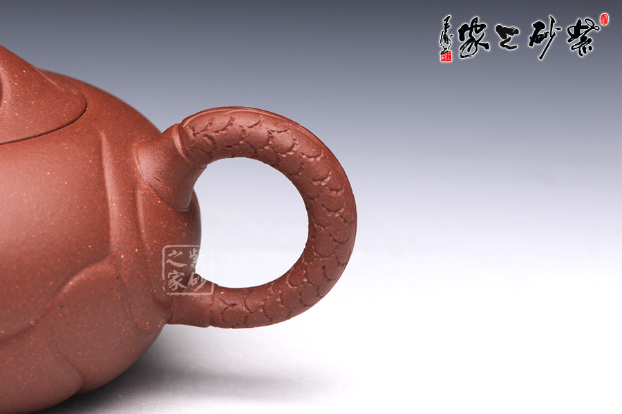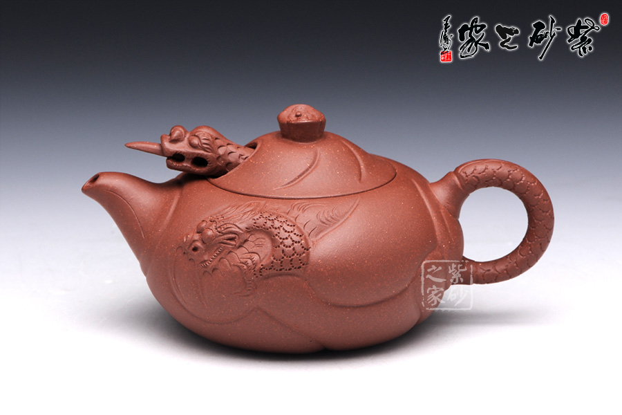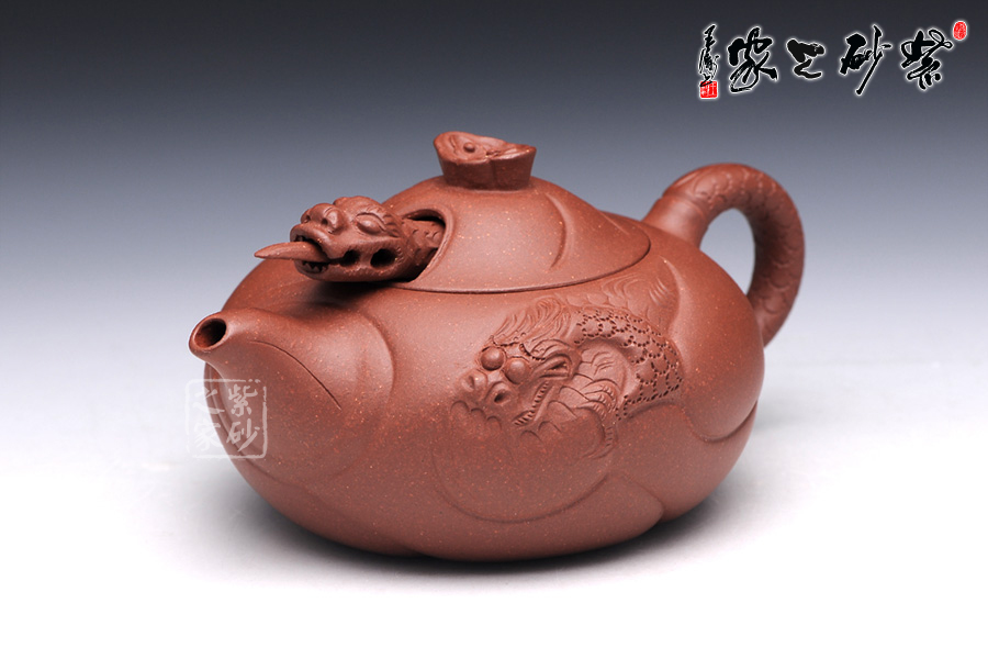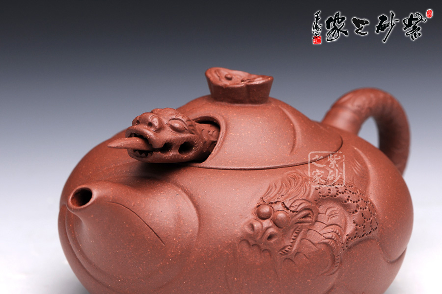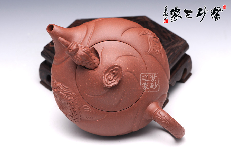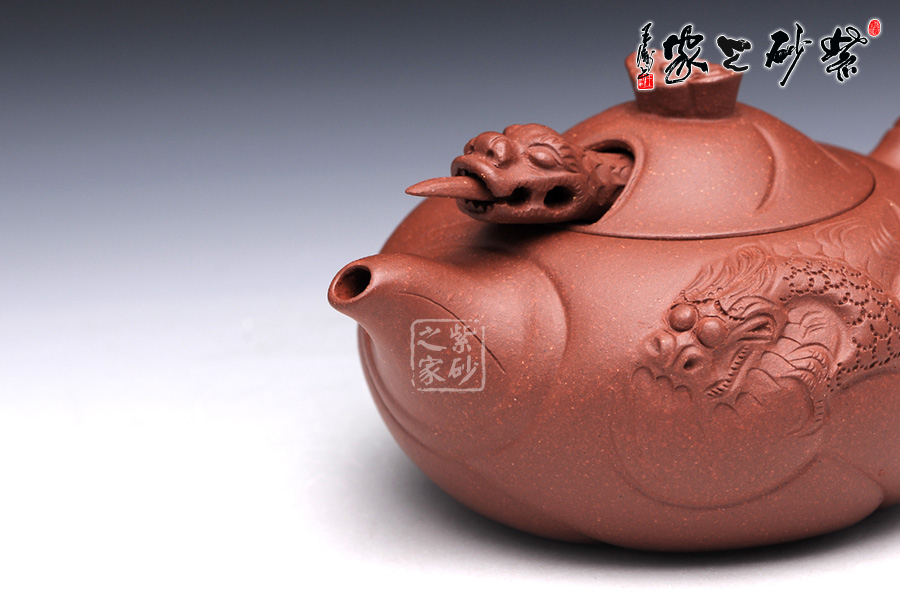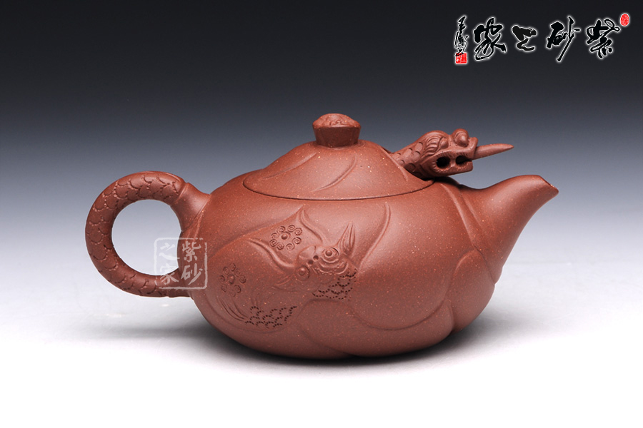 精選原礦底槽清泥料制成的魚化龍,泥質(zhì)醇厚,色澤古穆。魚化龍以神話故事為題材創(chuàng)作而來,作品構(gòu)思巧妙,將魚、龍以及云的裝飾與壺渾然一體。此款作品經(jīng)過老師的精心制作,刻繪精細(xì),出神入畫,就感覺真有一條龍?jiān)谄渖媳P旋。壺蓋上的龍頭可動,十分的奇巧俏麗,整款作品制作渾厚有力,精致而不繁瑣。
