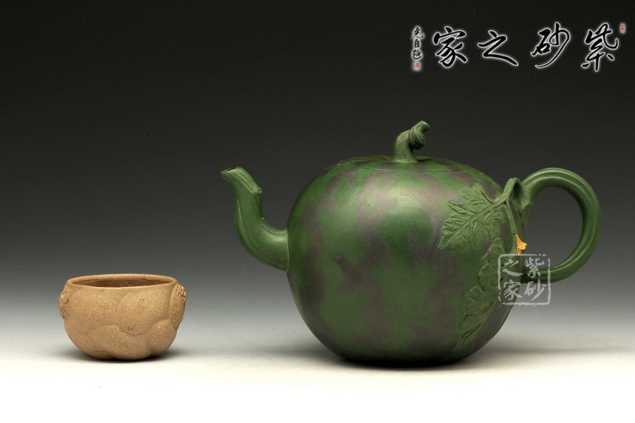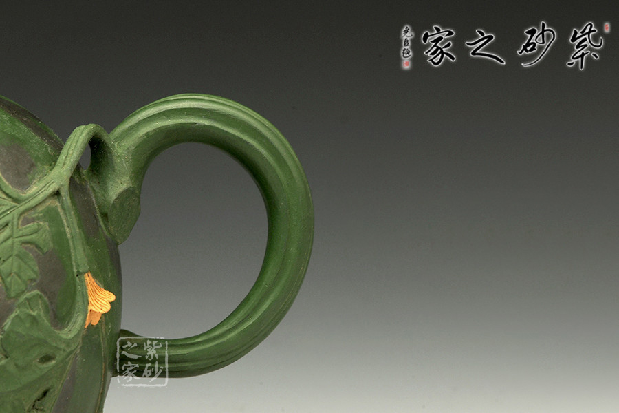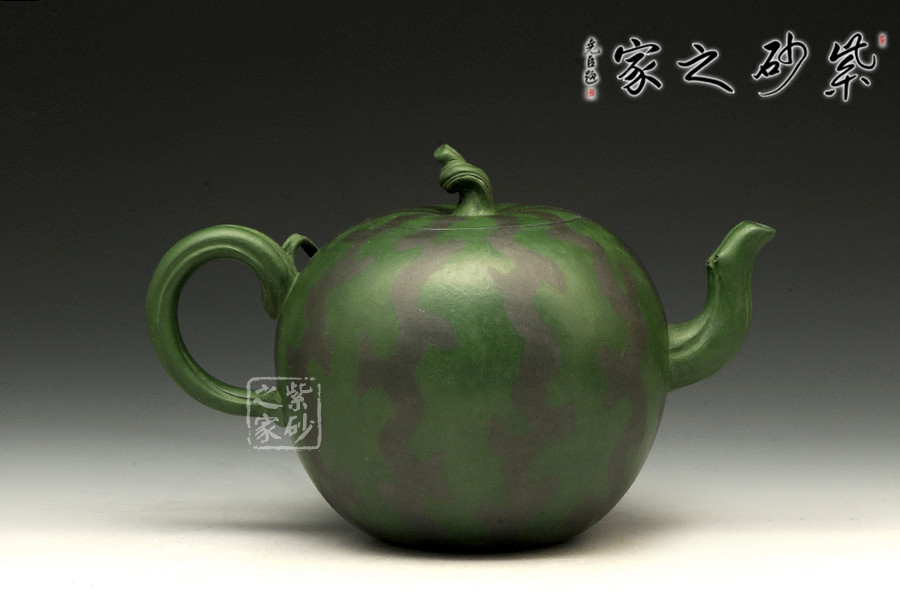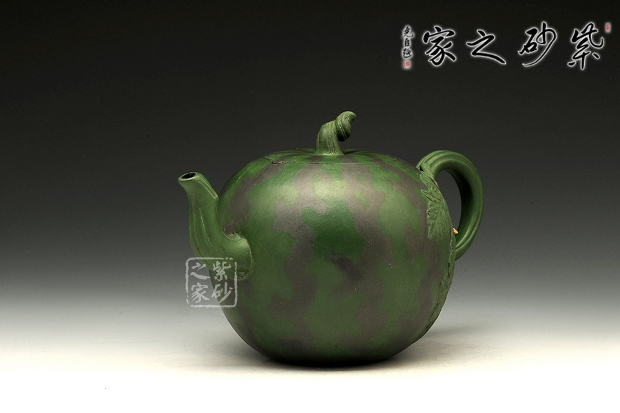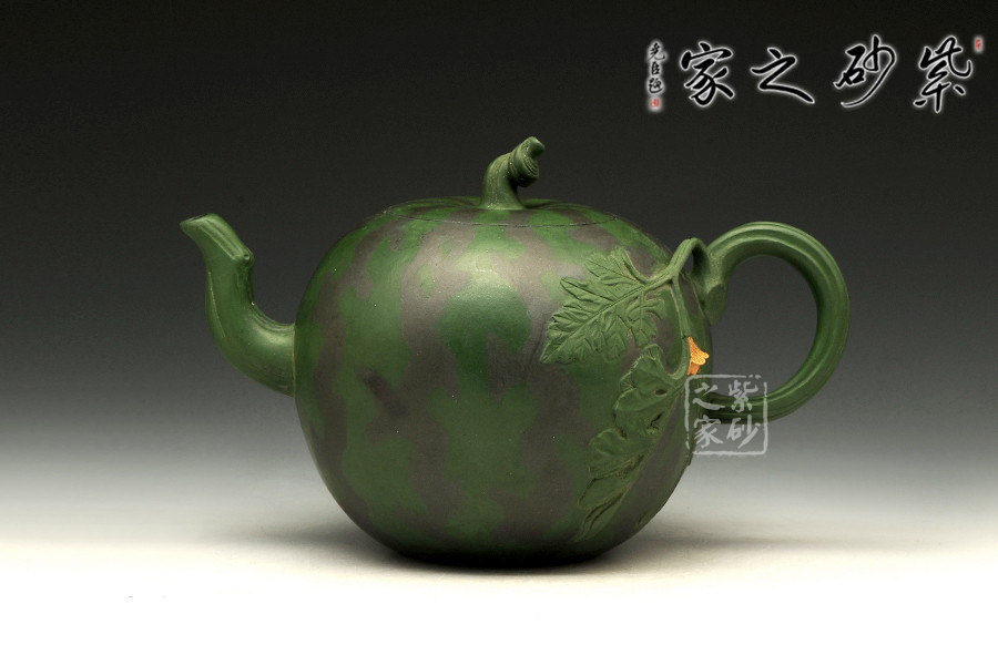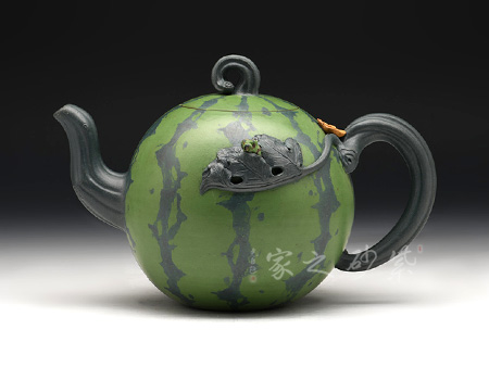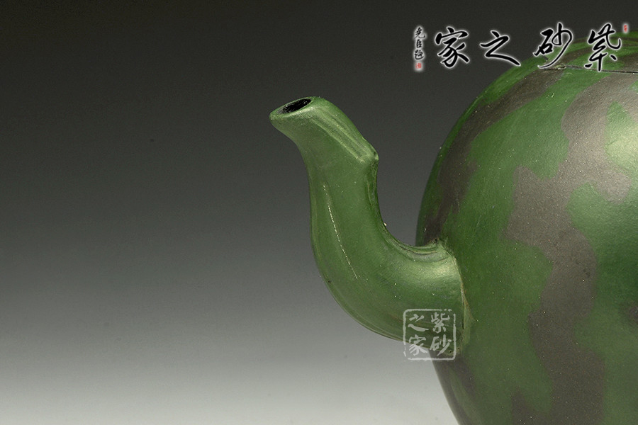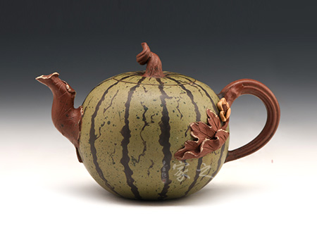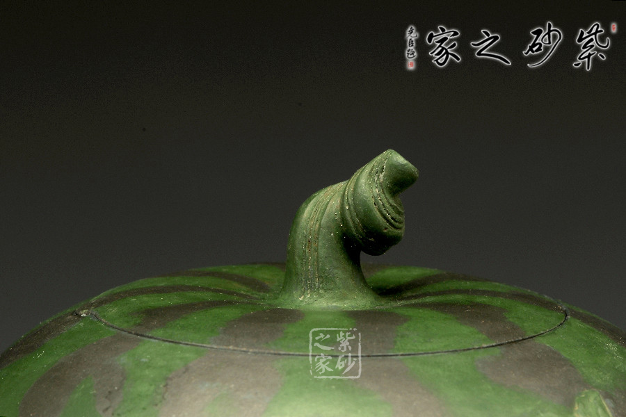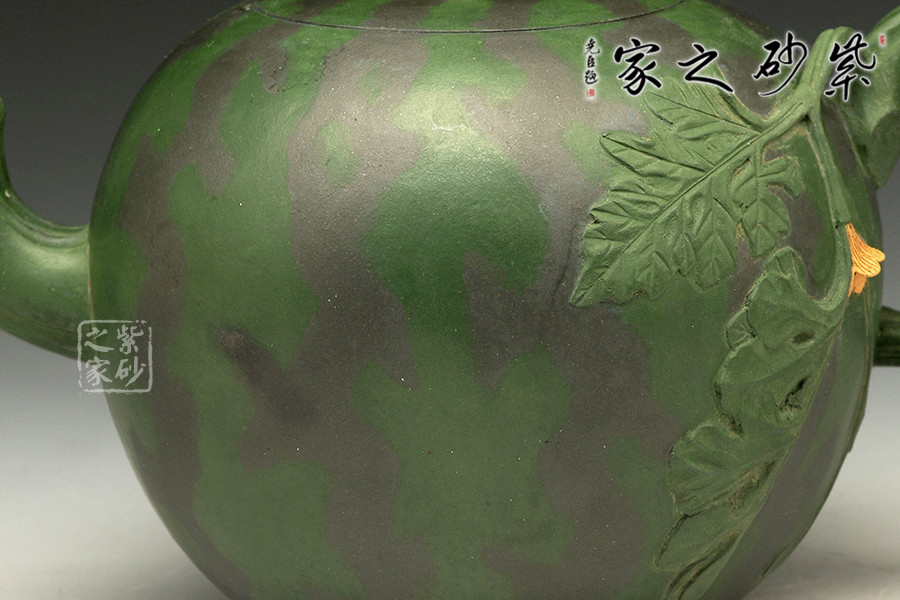 作品西瓜壺是高建芳老師于九十年代時制作,三色泥料的搭配恰到好處,將西瓜的紋理形態(tài)表現(xiàn)得自然逼真,青青蔓藤小黃花,碩圓珍果惹人愛,婉若一個飽滿成熟的西瓜置于眼前,令人垂涎欲滴,欣賞此壺有如在跟大自然的零距離接觸,心情自然十分愜意!