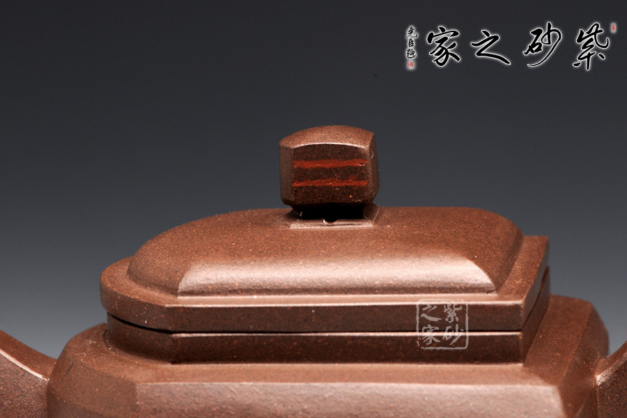 四方是束鳳英老師于上世紀(jì)八十年代初時采用傳統(tǒng)工藝手工制作而成,此器型方中帶圓,厚重而又靈動,活力十足!壺身前方線條刻畫清晰奪目,與整器形成視覺反差,壺身與壺鈕又相映成趣,整器工藝精湛,從作品造型便能感覺老師功底之深!