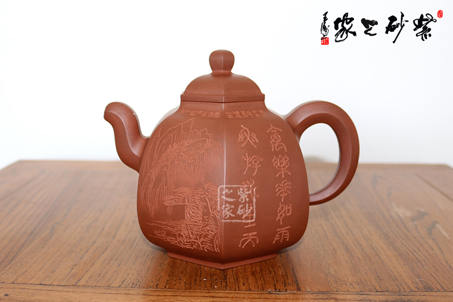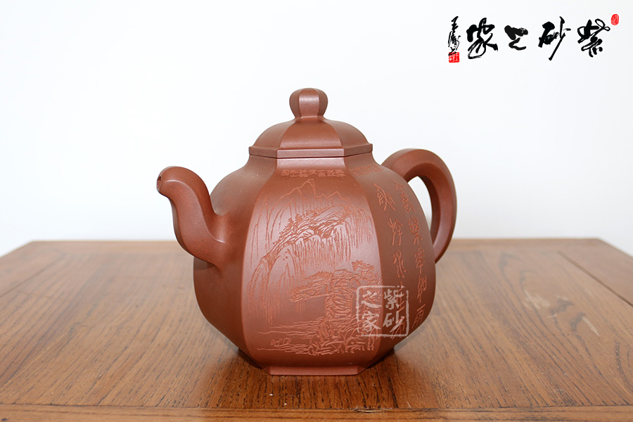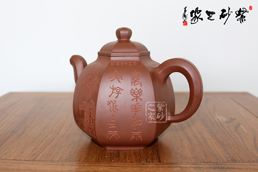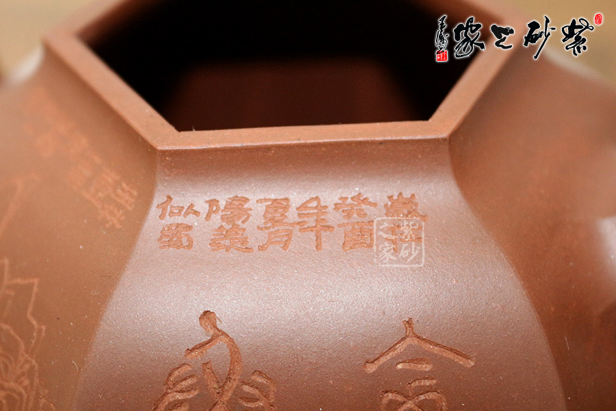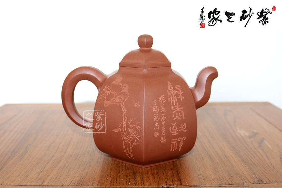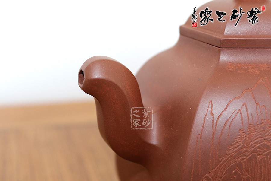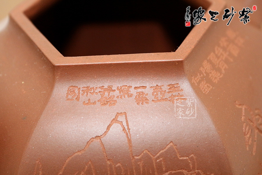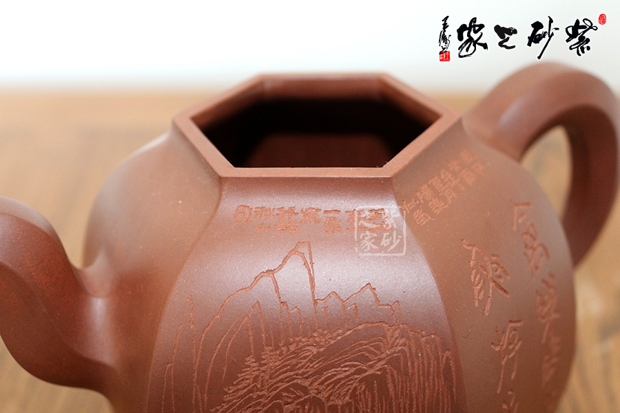 研究員級高級工藝美術(shù)師莊玉林的此款壺,高挺俊拔。壺身上斂下豐,呈六方形,輪廓清晰,線條流暢。壺蓋鼓起,和壺身造型一致,相互應(yīng)和。壺鈕更是精致可愛,如袖珍形的壺身。三彎流壺嘴和耳形壺把皆呈六邊形,與主題相呼應(yīng),此壺足見制壺者的高超技藝。壺身刻繪出自毛國強(qiáng)之手,所刻字體具有濃厚的歷史氣息和文化意蘊(yùn),所刻的山水叢林和鳥兒皆形象逼真。此壺是不可多得的藝術(shù)品,值得珍藏。