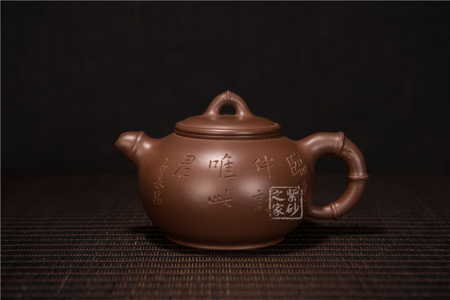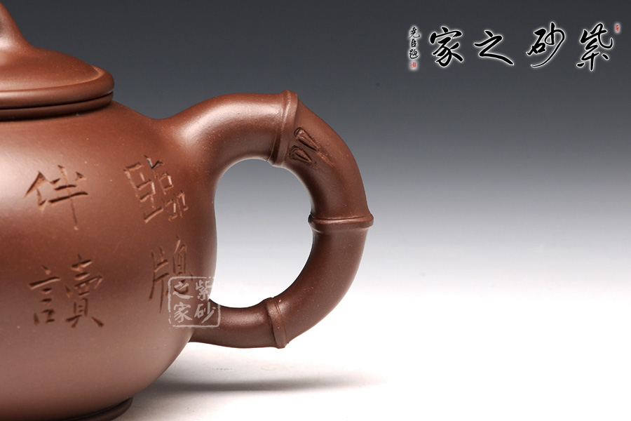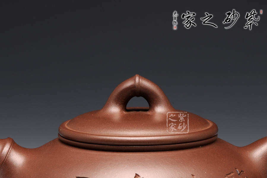 所謂“竹福”,諧音“祝福”,有祝愿、祈福之意,這款壺的壺型十分簡約經(jīng)典,制作于九十年代初,厚重豐盈的壺身充斥著福氣,壺鈕、壺把與壺嘴的竹節(jié)造型別致精巧,做工形象逼真,將竹的生氣都表現(xiàn)得完美,壺鈕呈圓弧狀,似有祝福圓滿之意;壺身裝飾由中國工藝美術(shù)大師譚泉海操刀篆刻。