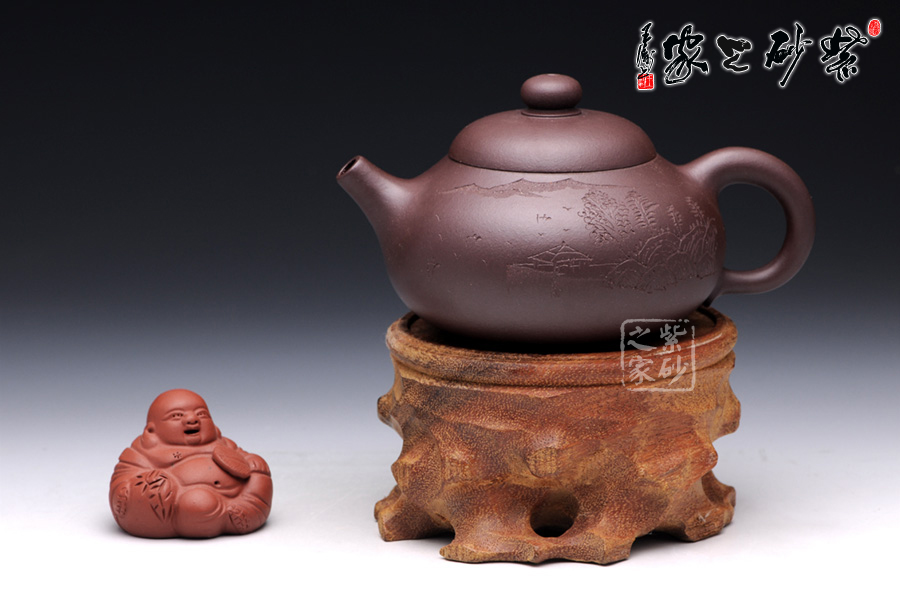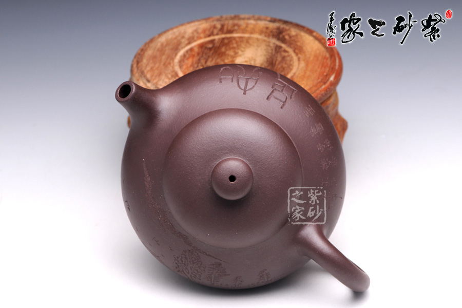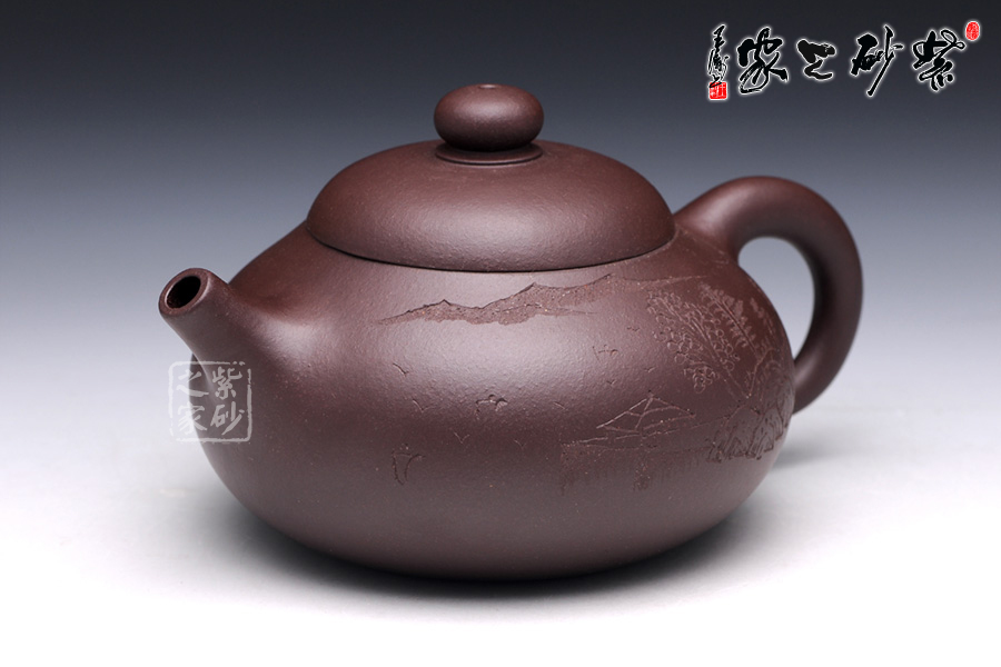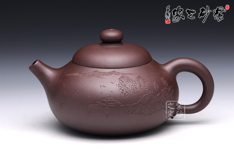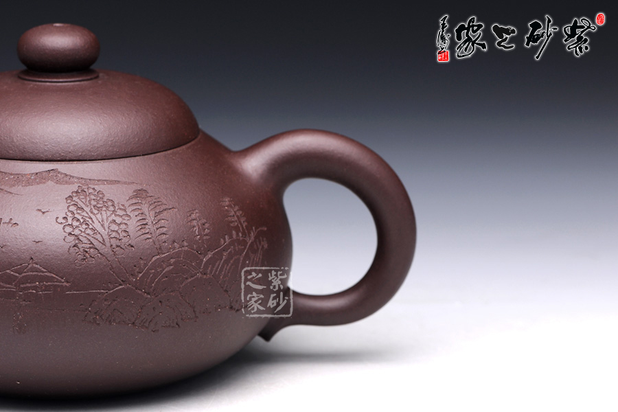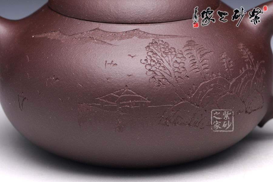 精選原礦紫泥制成的此壺,細(xì)膩柔和,色澤厚重,底蘊(yùn)深沉。該壺名為容天,具有大肚能容天下之意,氣勢(shì)恢宏。壺身偏扁,古樸典雅。該壺采用刻繪裝飾工藝,正面刻繪了一幅優(yōu)美的山水畫(huà),遠(yuǎn)山如黛,水波浩渺,燕鷗翩翩。壺反面刻繪了“知足”兩個(gè)大字,字體古樸,另有一行小字刻繪道“一壺春雪手伴茶香”。
