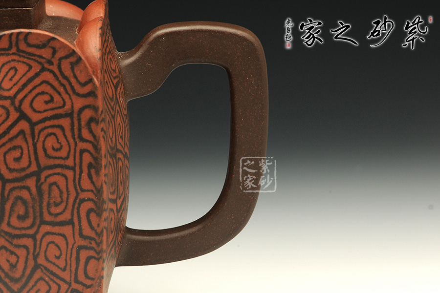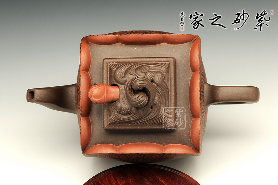 延年益壽壺構(gòu)思新穎,方中寓圓,方中求變,動(dòng)中取靜,飽滿穩(wěn)重,氣度非凡。一只生機(jī)勃勃的長(zhǎng)壽龜在迎風(fēng)破浪,奮勇前進(jìn),寓意十分含蓄?;{(diào)是方器,但壺體四周、壺底以及壺的肩部做成曲線的圓弧狀,線條流暢自然。龜背略高于壺肩,每一片龜背做成三棱形,極具真實(shí)感。作品的精妙之處是對(duì)壺蓋的構(gòu)思與制作的精巧入微,運(yùn)用熟練的花貨微雕技藝,將壽龜頭部做得概括抽象,出露在洶涌的波濤之中,還能靈活伸縮,用奔騰四濺旋轉(zhuǎn)的浪花做蓋的,使全壺增加生機(jī)勃勃的動(dòng)感魅力,具有極強(qiáng)的藝術(shù)感染力。