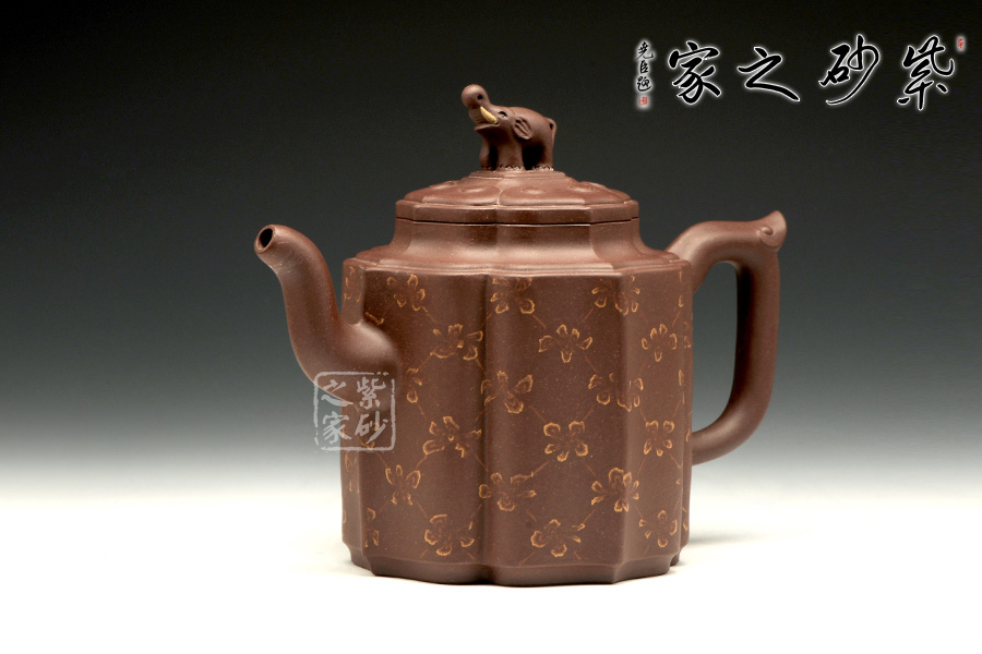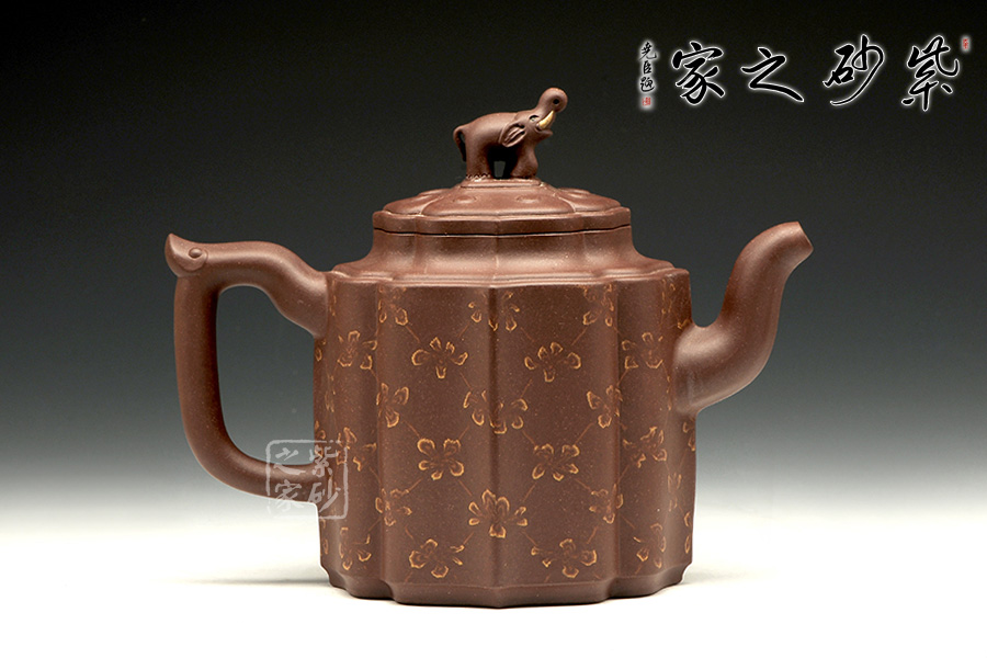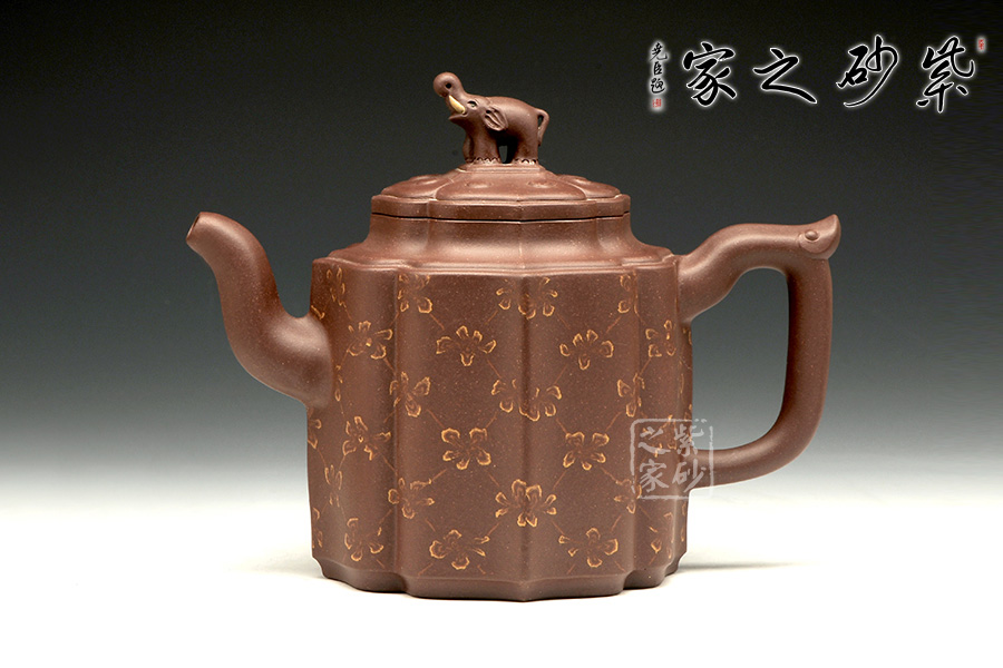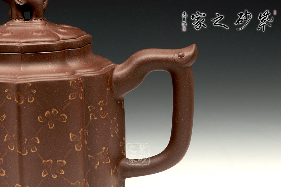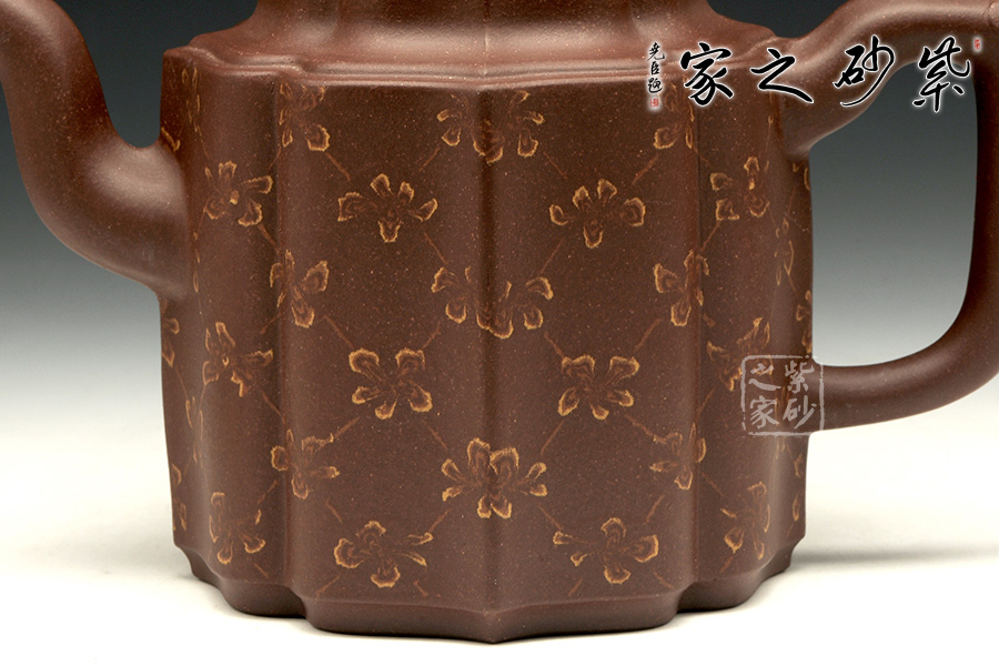 此壺采用獨(dú)特的絞泥裝飾工藝手法,將器身幻化出各種姿態(tài)各異,形態(tài)優(yōu)美的花朵,極大的增加了紫砂壺的視覺美感。