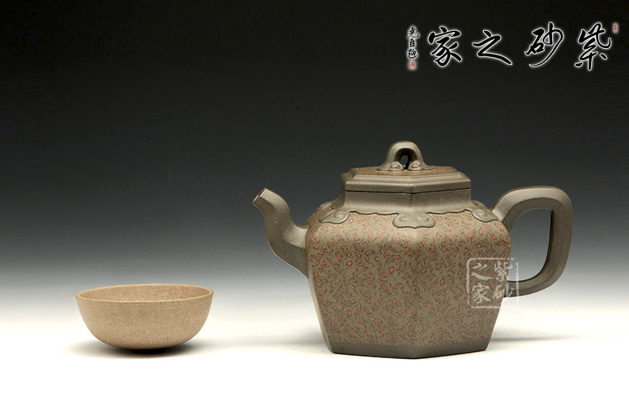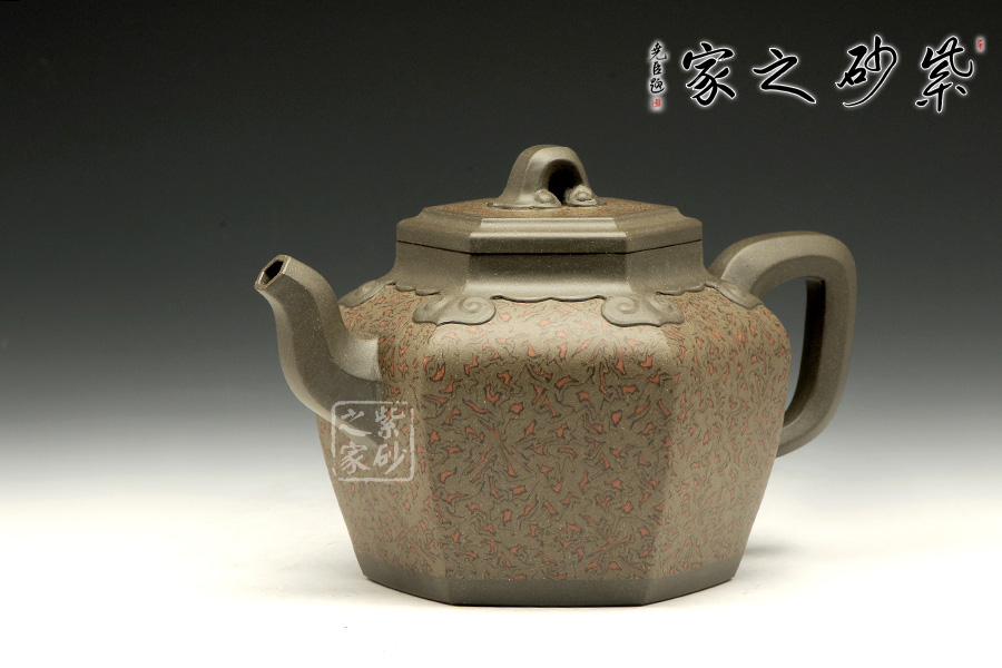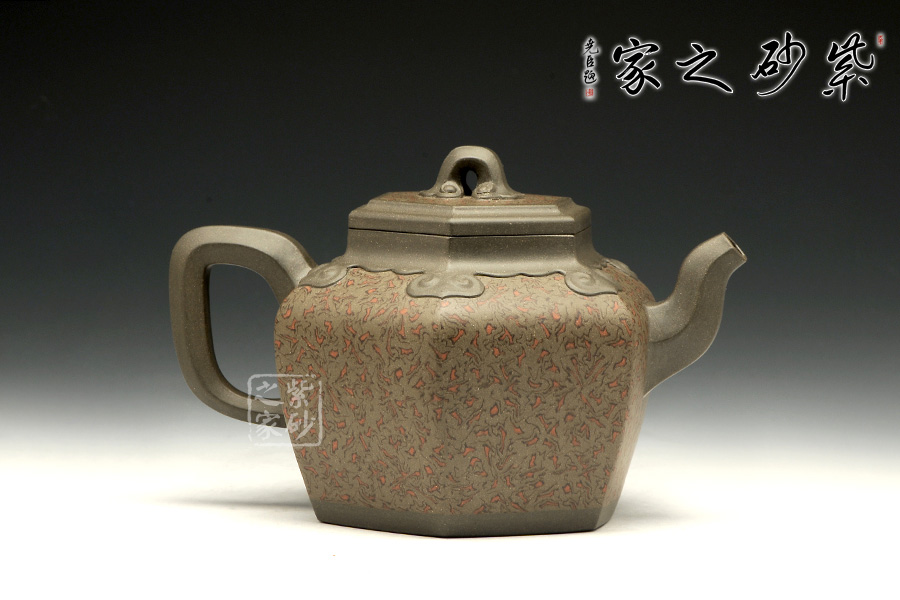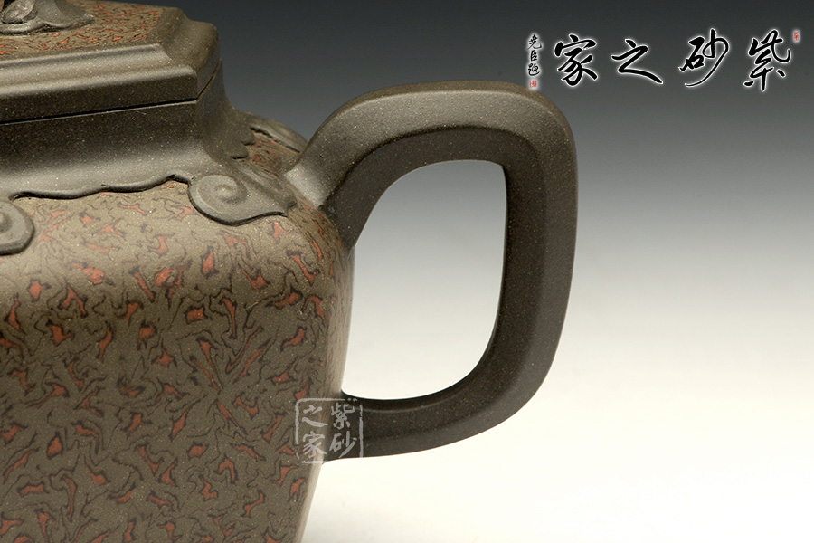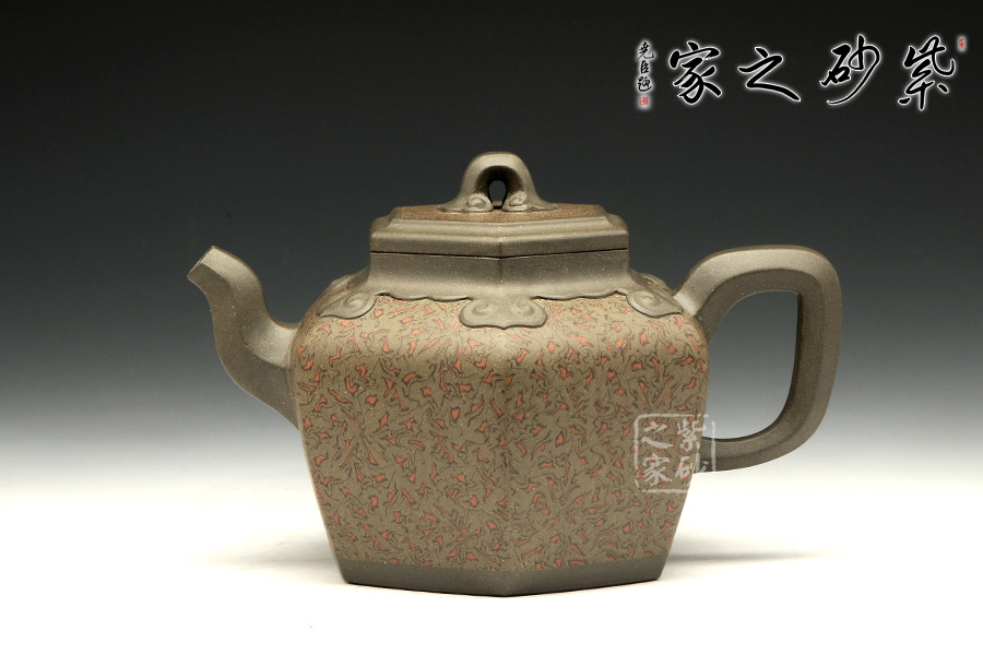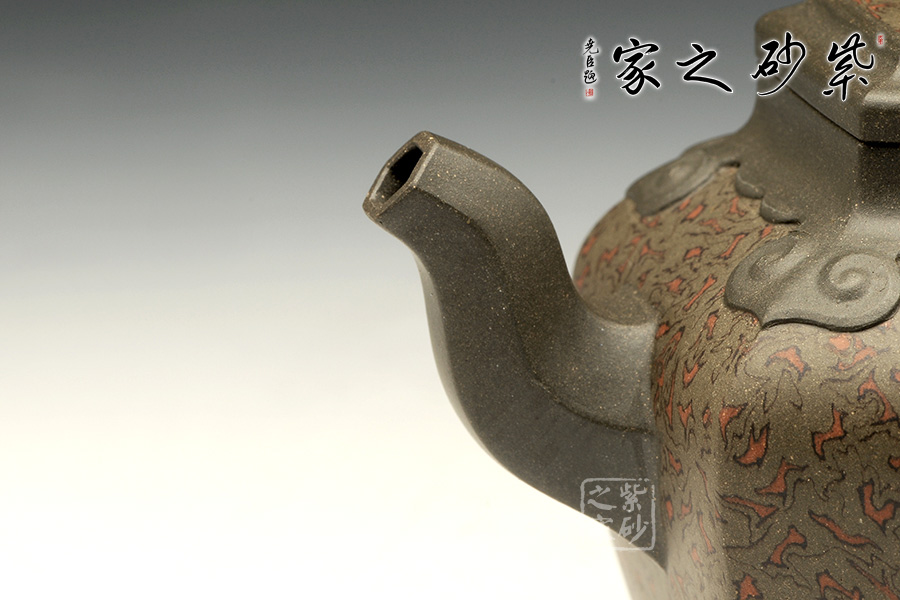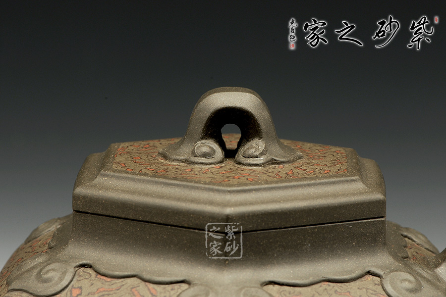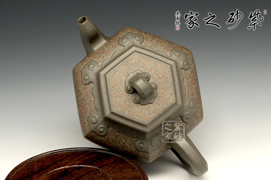 孔春華手工制作的此款六方如意選用絞泥的工藝手法飾之,其手法嫻熟,令人稱道,此款器型線面挺括,輪廓分明,莊重大氣,不失為雅俗共賞之物。壺身被挺括的線條分成幾等分,壺把與壺嘴均為六方造型,制作彎曲有度,造型多變,壺肩與壺鈕以如意裝飾,吉祥之意韻橫生!