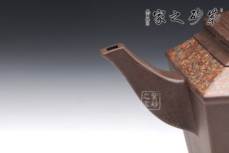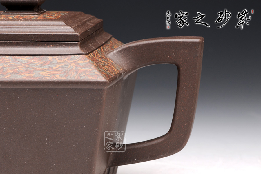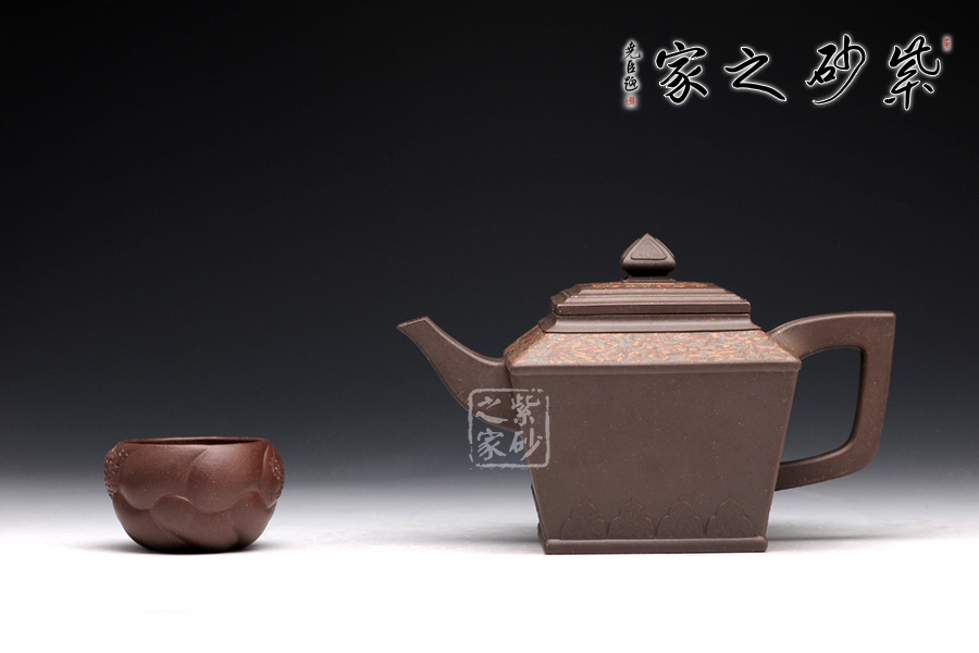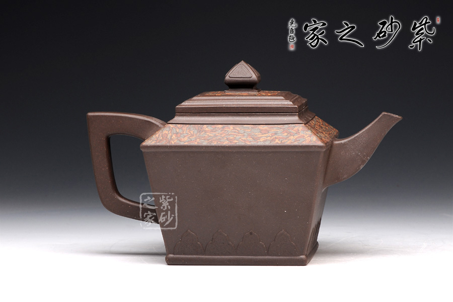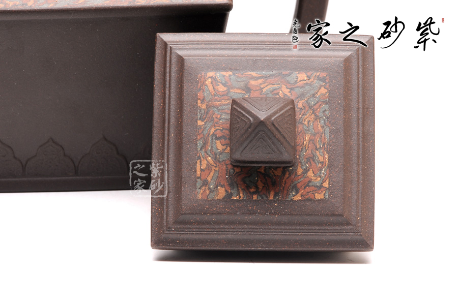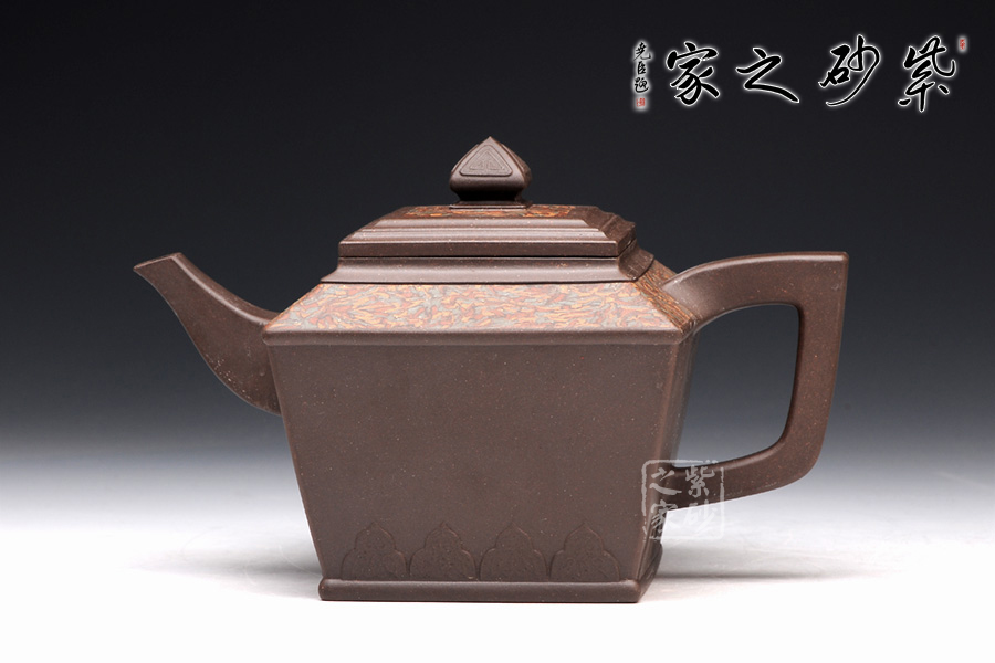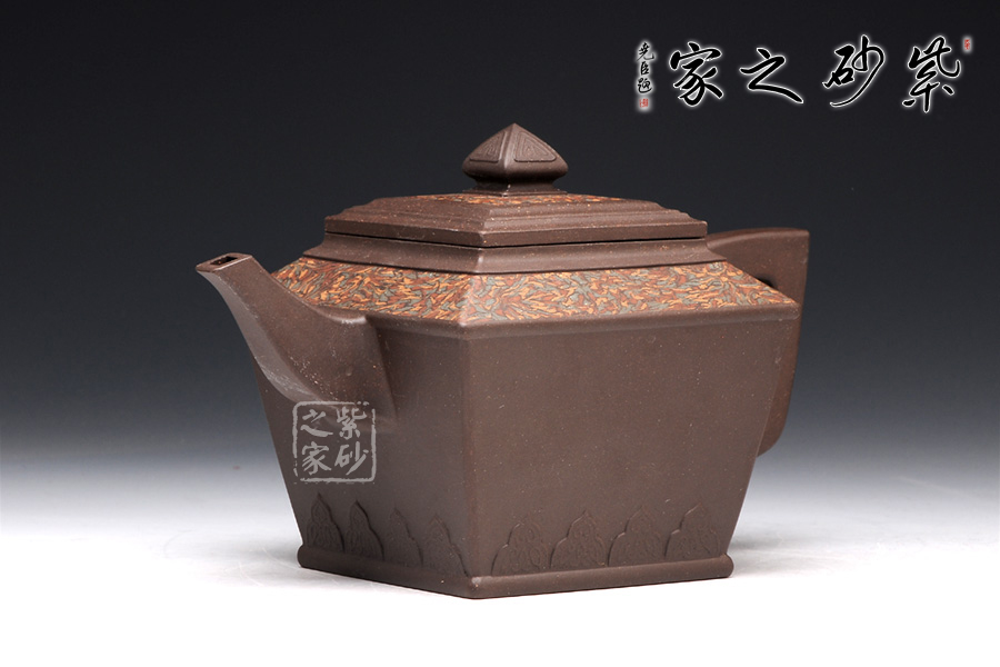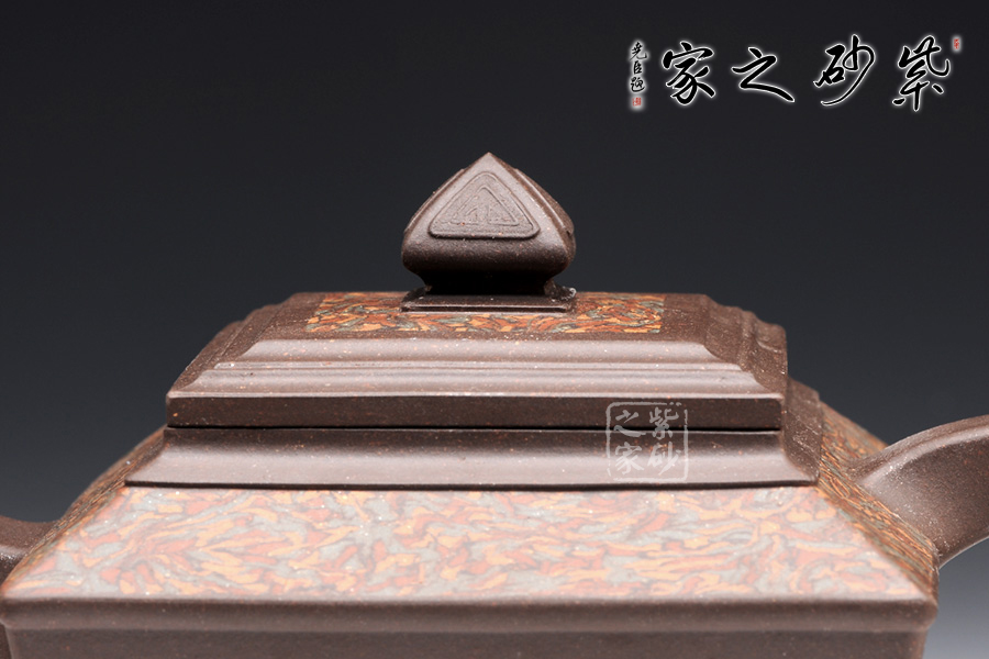 金正方壺可謂是孔小明的代表作品。擅長絞泥方器的他,在這款壺上,則展示了他高超的制壺工藝和獨特的審美能力。此壺,方形線條清晰明朗,做工細膩,對稱工整。壺身呈倒梯形,壺身底部刻繪的圖案,和壺鈕的造型一致,宛若精美的仙桃,又若古時的堡壘,甚是好看。壺肩和壺蓋上的紋理皆由絞泥制壺工藝完成,美觀典雅,大氣恢弘。