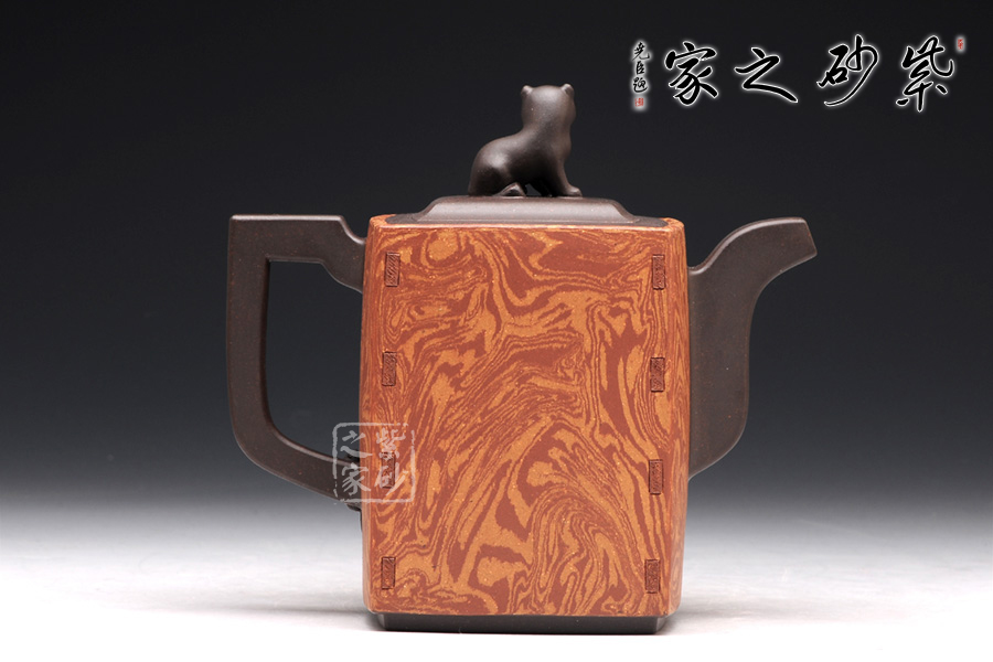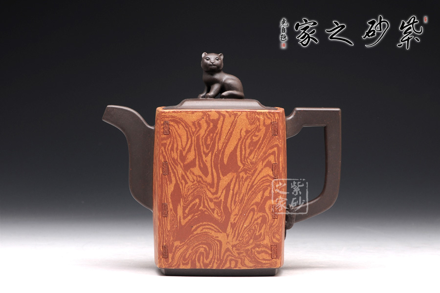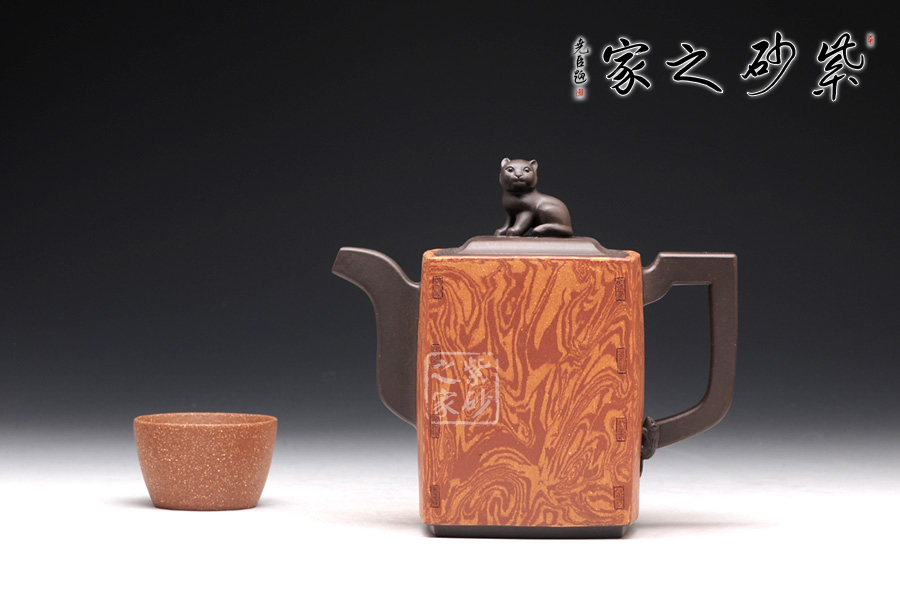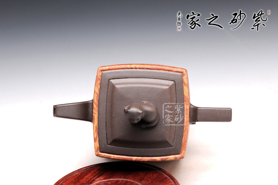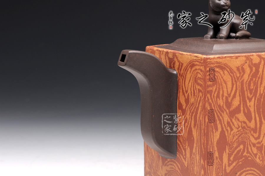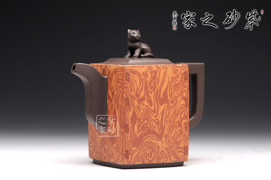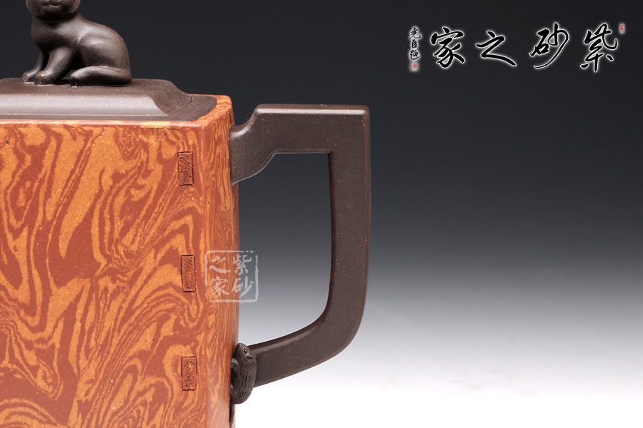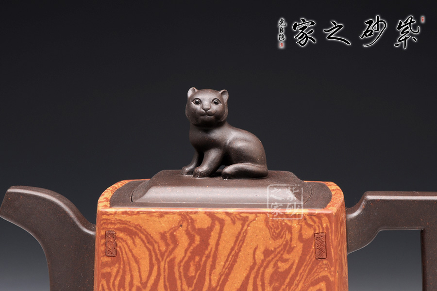 孔小明的五谷豐登壺,造型簡(jiǎn)單,構(gòu)思新穎。壺身高挺,方形線條規(guī)整有力,老師突破絞泥制壺工藝的艱難,完美地展現(xiàn)了豐富飽滿的紋理和優(yōu)雅色澤,美觀精致,大方典雅。壺身端正,象征著滿滿的糧倉,壺把處一黑色老鼠,圓睜著兩眼,精靈傳神,正在興奮地爬向糧倉,這一細(xì)微的細(xì)節(jié)生動(dòng)地展示了五谷豐登熱鬧場(chǎng)面和人們幸福美好的生活。壺蓋上以一只貓做壺鈕,精細(xì)美觀,形象逼真,糧倉之上,貓的守候不僅與壺把下方的老鼠相呼,同時(shí)更說明了糧倉之滿,豐收之多。該壺,生活味道濃厚,藝術(shù)感極強(qiáng),值得珍藏。
