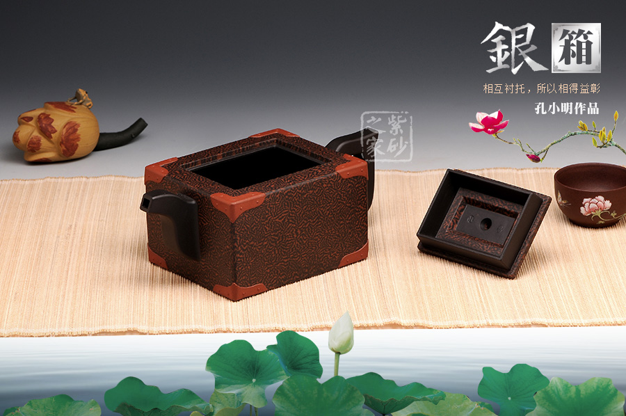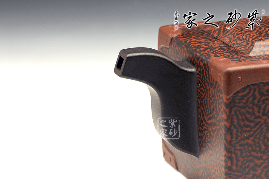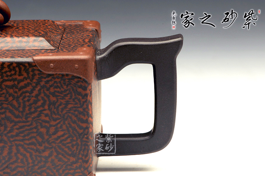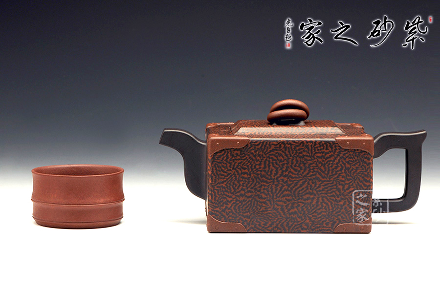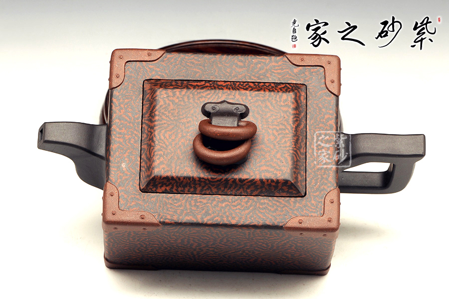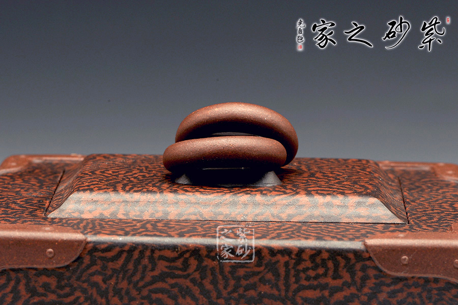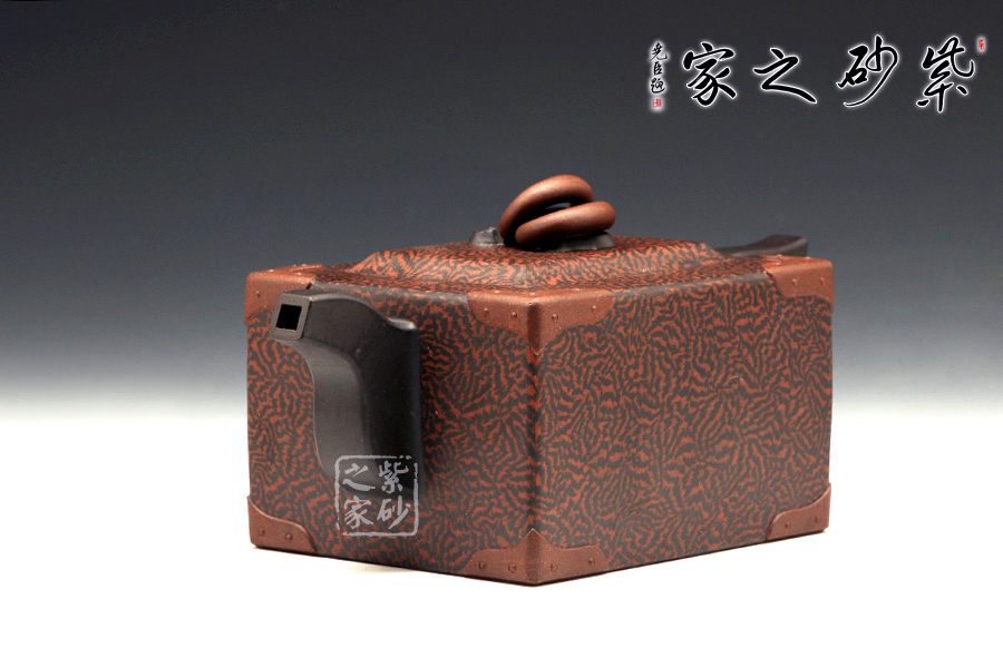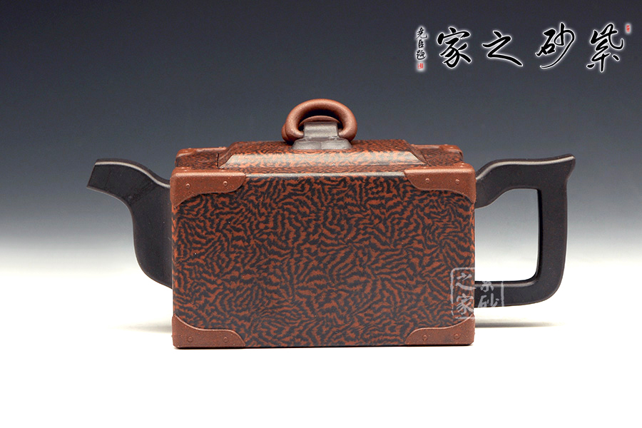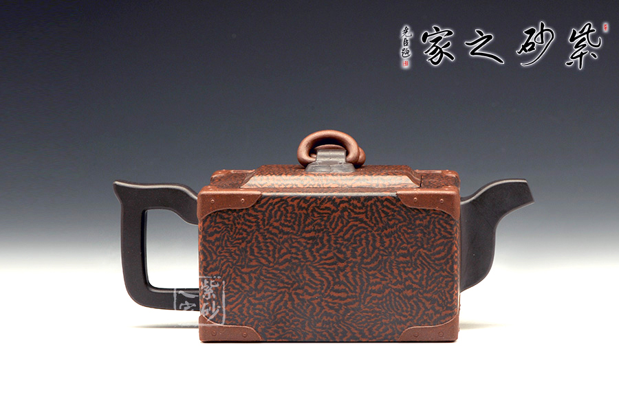 創(chuàng)作理念自述:此壺以古代達(dá)官貴族家庭藏寶箱,精細(xì)箱件包角,仿古代油漆紋樣裝飾,靈活輕巧箱把作壺鈕,造型靈美。