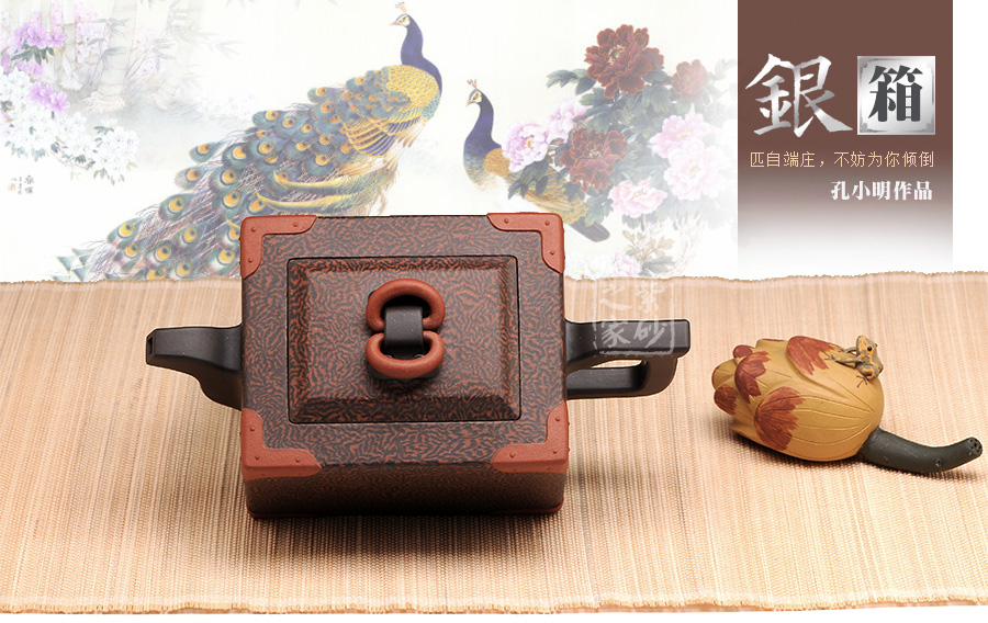 孔小明的此壺名為銀箱,同樣是以難度極高的絞泥制壺手法來完成的。雙色泥料的精美對比和良好的藝術(shù)效果,同樣在此壺中得以完美體現(xiàn)。該壺的構(gòu)思源于歷史和生活,壺形仿造銀箱制作而成,箱子的邊邊角角以及箱鎖皆形象逼真,生活氣息濃厚,同時(shí)代表了對幸福美好生活的祝福和向往,吉祥喜慶,值得收藏。