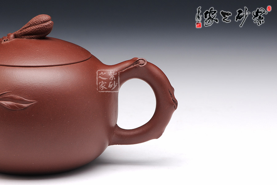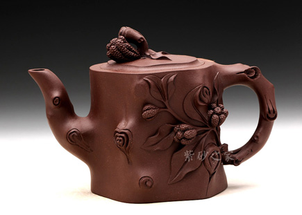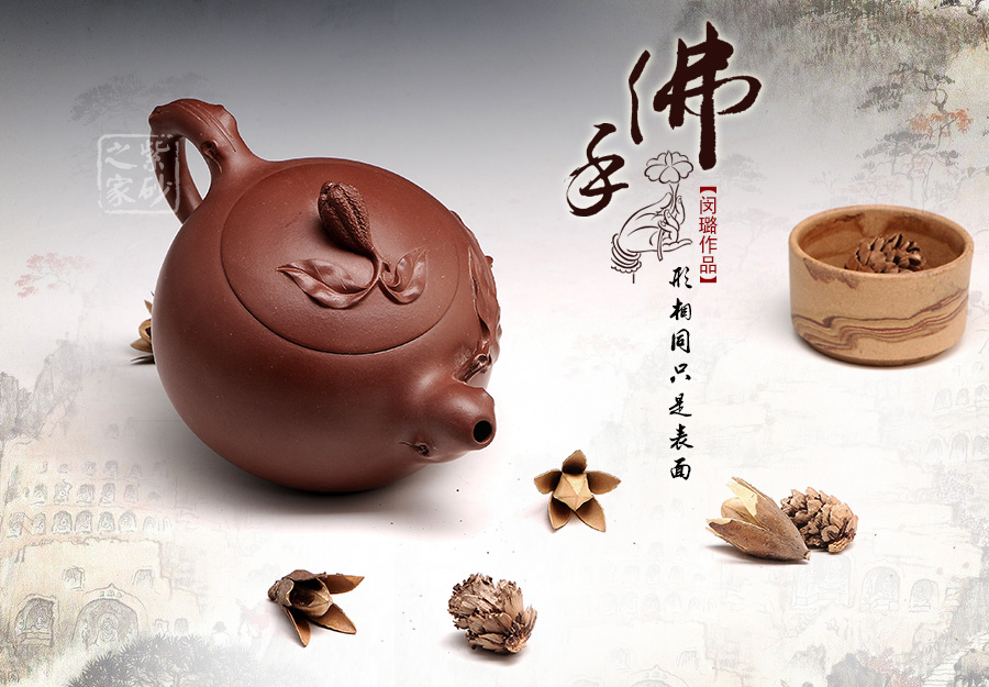 閔璐的此壺以佛手為原型,創(chuàng)意新穎,造型別致。佛手不僅是一種植物,同時(shí)也因其名和其形,被賦予了一種神圣尊貴、祥如意的意義。因此該壺可謂是形美意深。細(xì)觀此壺,壺身圓潤飽滿,線條流暢自如,嵌蓋設(shè)計(jì),與壺身渾然一體,行云流水般的神韻縈繞其間。壺鈕為佛手的果實(shí),形象逼真,壺嘴和壺把皆似佛手的莖,蒼勁有力。此外,該壺還采用貼花制壺工藝,于壺嘴處胥出一枝佛手,葉茂實(shí)美,耀眼奪目。