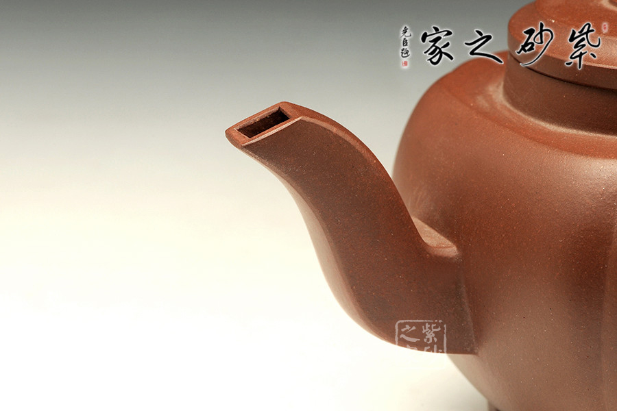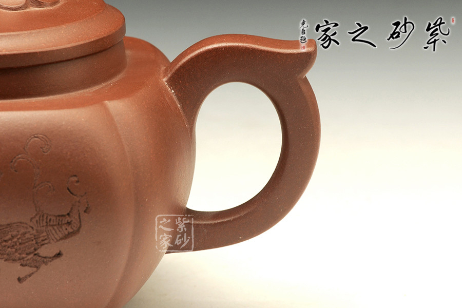 如意明朝添錦繡,稱心今日添光輝。這件作品以如意為壺紐,壺身通體光潤(rùn),色澤悅目,壺嘴與壺把以四方為形,與壺紐上的如意并成一線,更顯壺風(fēng)流暢周正,可稱秒品。壺身方圓有度,筋紋裝飾,可謂壺藝極佳,令人一見愛不釋手;其簡(jiǎn)練大方之形、淳樸典雅之色、安詳恬淡之態(tài),彰顯作者壺藝之精。