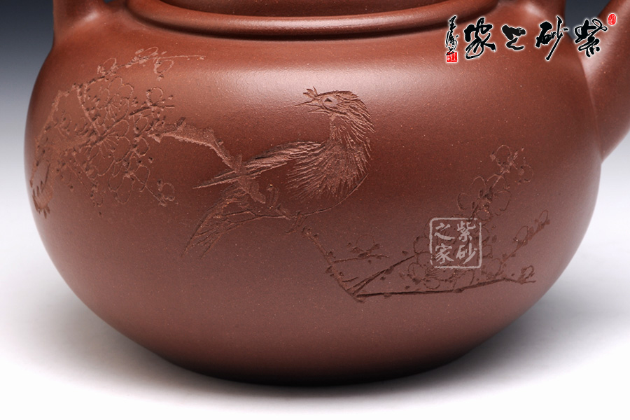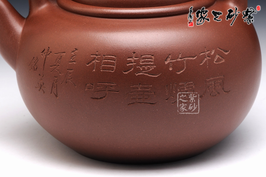 壺身裝飾由研究員級高級工藝美術(shù)師咸仲英操刀篆刻,正面“松風(fēng)竹爐,提壺相呼”;反面篆刻“花鳥圖”,花香鳥語,似為一派春意盎然的景象!