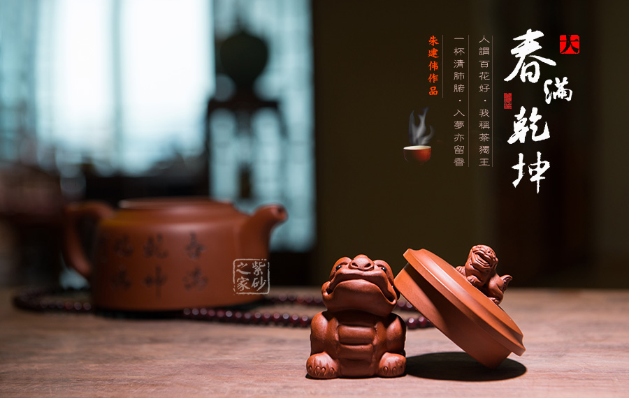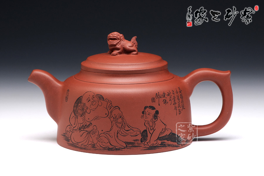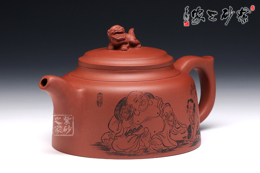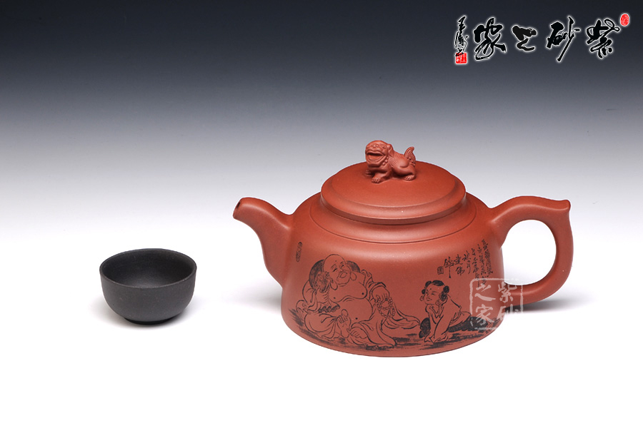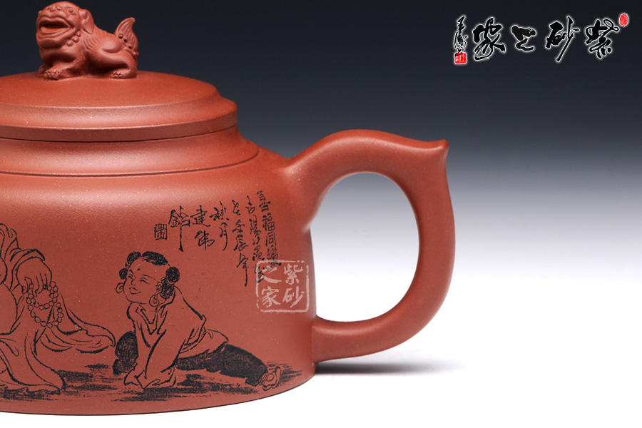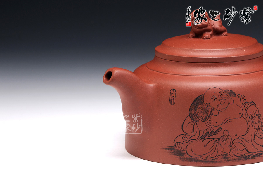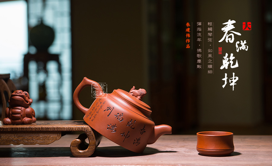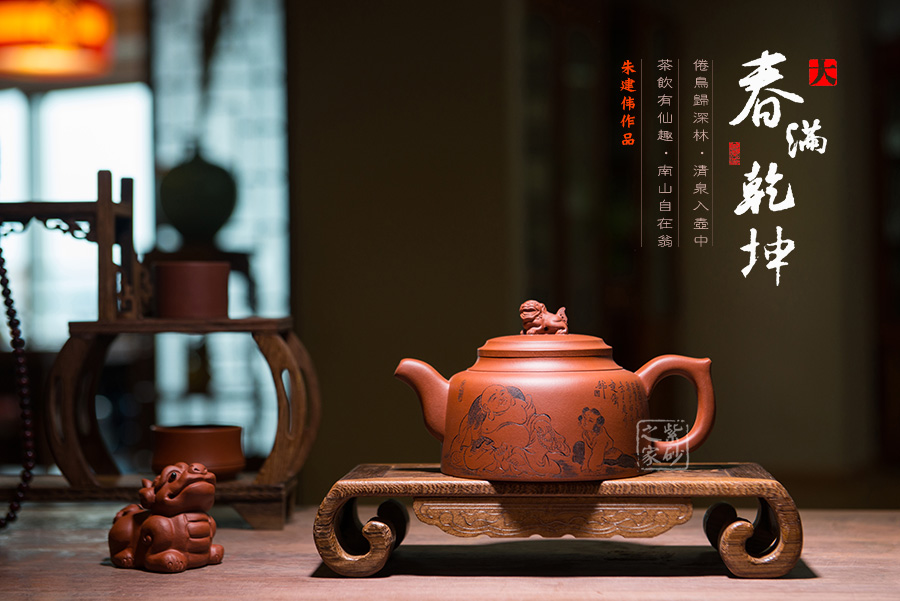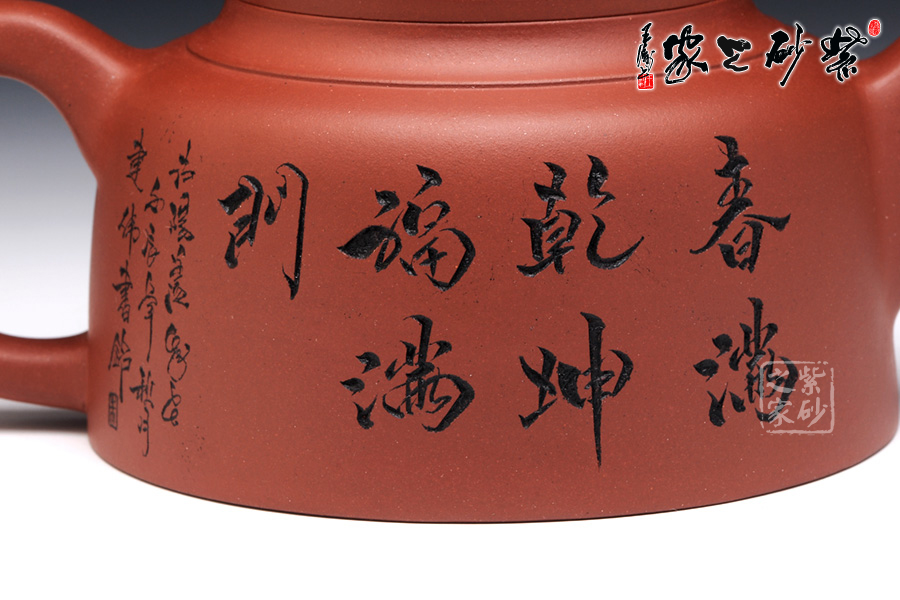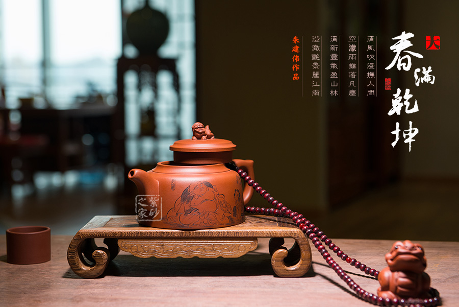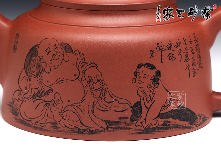 壺身裝飾乃朱建偉老師親自篆刻,正面篆刻“喜福同樂”圖,笑佛與孩童歡言笑語,快樂自在之感油然而生,作者清晰的線條作出此畫,傳遞快樂的正能量;反面篆刻“春滿乾坤福滿門”,可謂天地萬物布滿春色,家家戶戶也洋溢著幸福的喜慶!