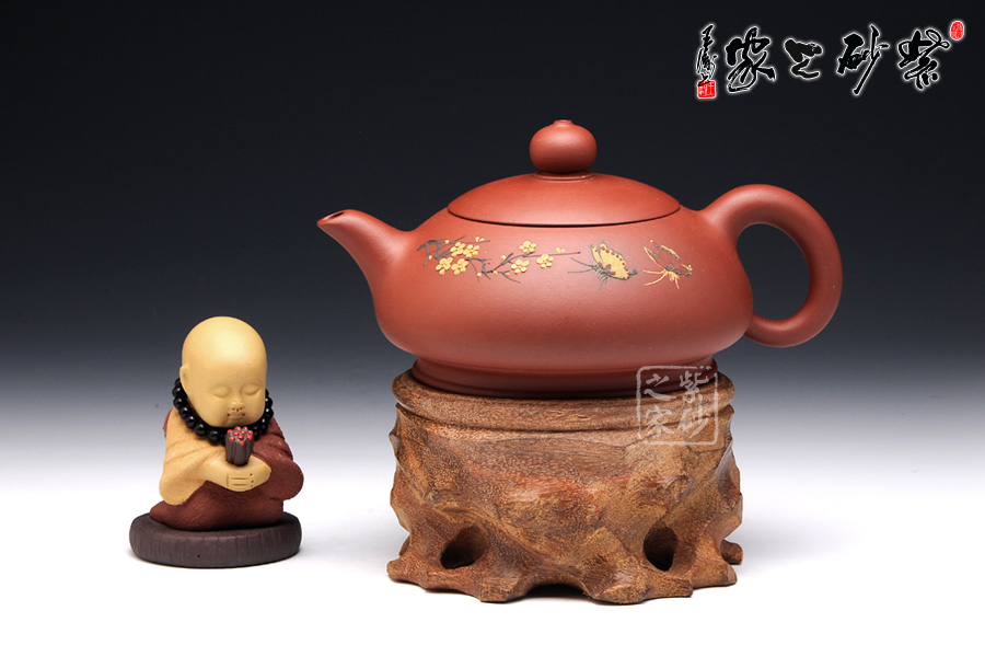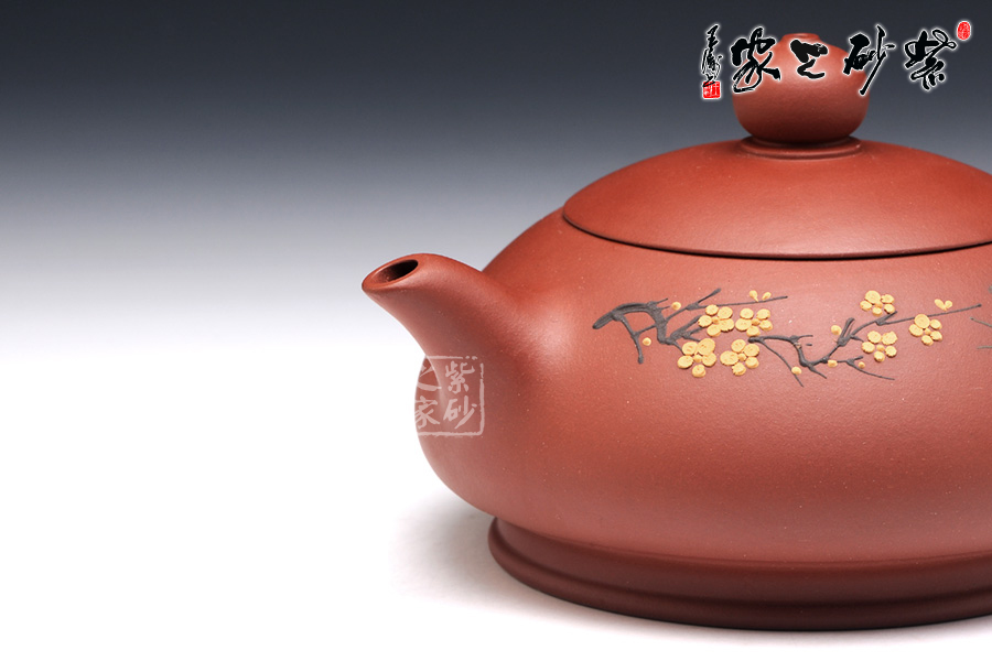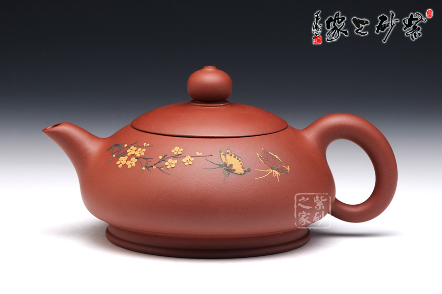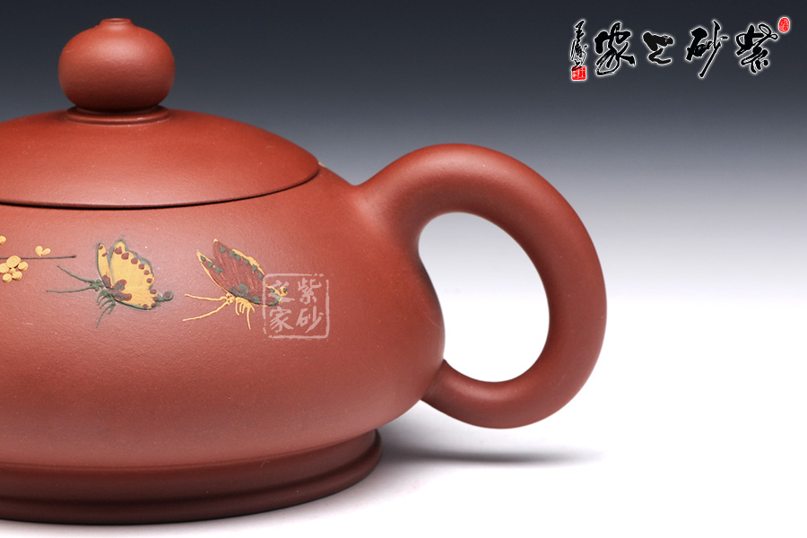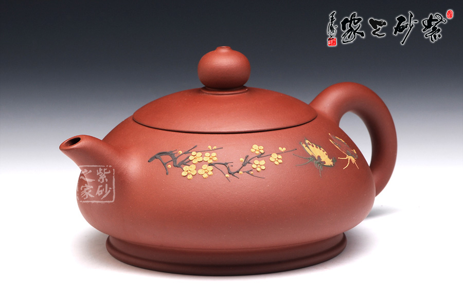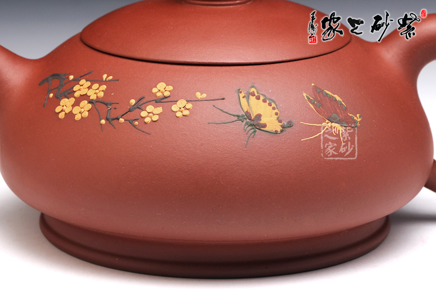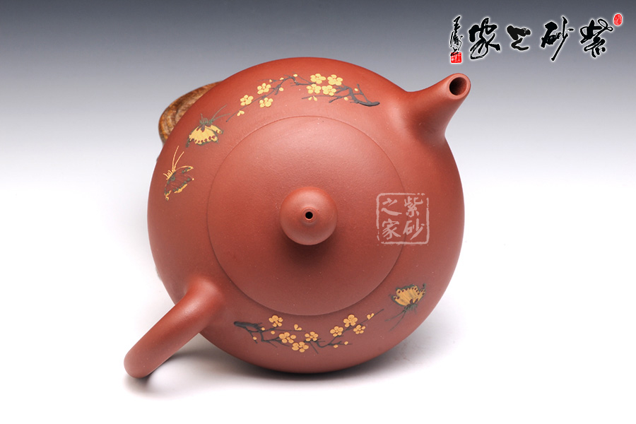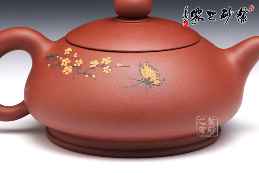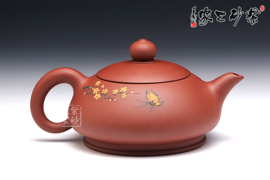 朱建偉的這款大蝶花,整體觀之,柔和清雅,神形俱佳,細膩流暢的線條和精美別致的壺身,閃爍著優(yōu)雅飄然的光芒,猶若西施壺一般,展示了女子的柔美韻味。壺身采用彩繪裝飾工藝,繪制了一幅蝴蝶撲梅圖,粉色的彩蝶翩翩起舞,歡快熱鬧。所繪制的梅花,形象逼真,清雅精美,暗香浮動,令人心曠神怡。此壺作為一件實用品兼藝術(shù)品,不足為過。