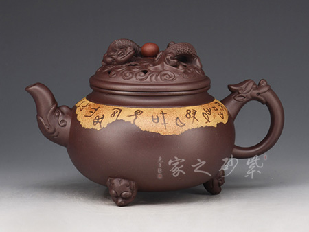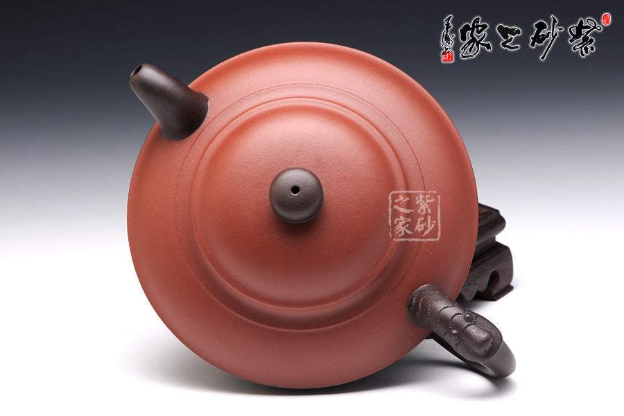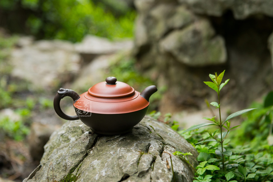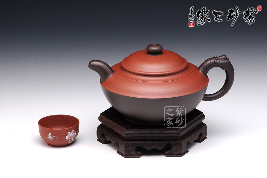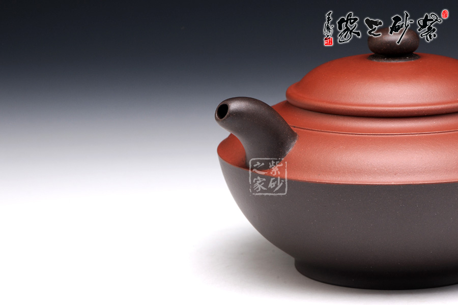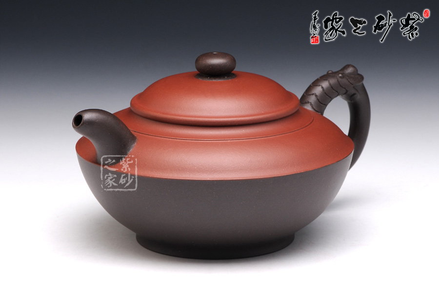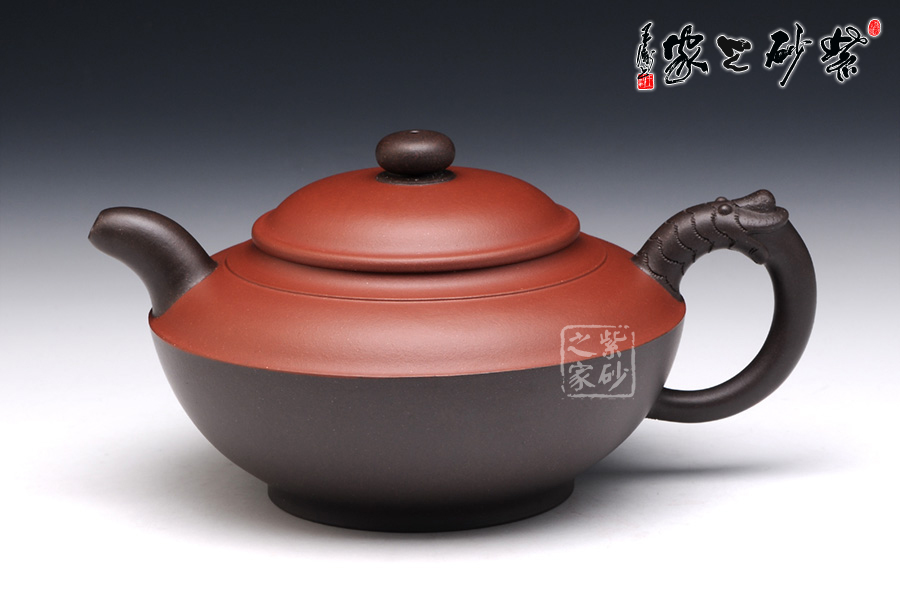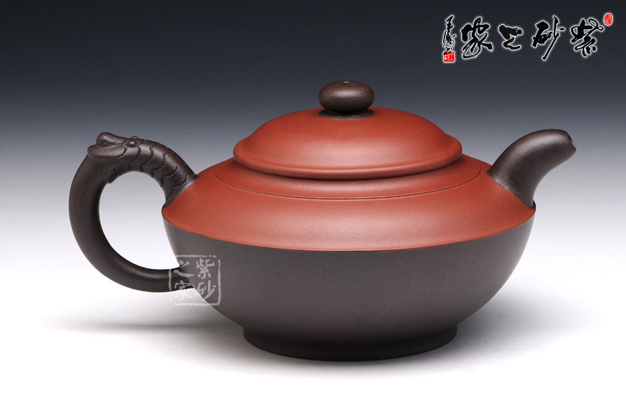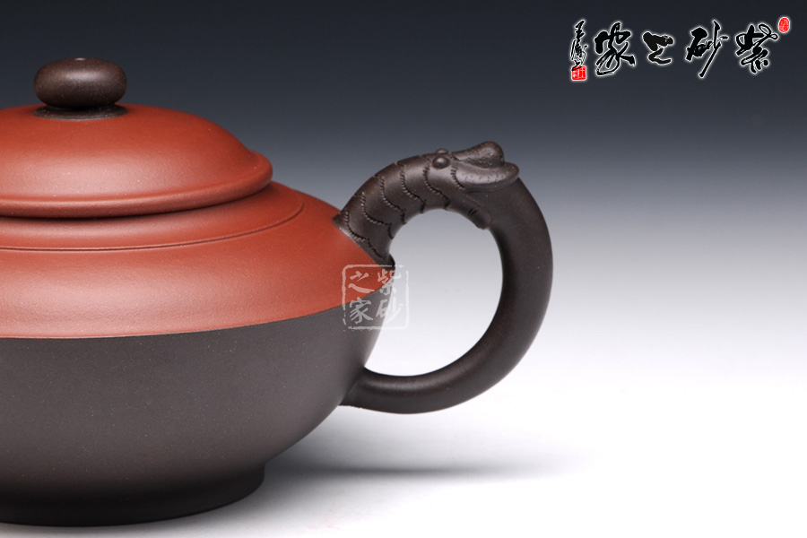 此壺看似簡單,實(shí)則非常考驗(yàn)功力。雙色泥制作,韻味非常特別。壺身似一只蓋碗,蓋子銜接處就是壺腹的線,由此分為上下兩面,上面泥色紫紅,下面泥料青黑,兩相對(duì)應(yīng)又相互襯托。壺鈕、壺嘴和壺把為黑色泥料制作,壺嘴簡短自然,壺鈕如一粒黑珍珠,壺把則以龍身制作,造型古樸生動(dòng)??傆^此壺,就如一塊溫潤玉闕,仿佛泛著流光。能做壺成玉,確實(shí)難得。