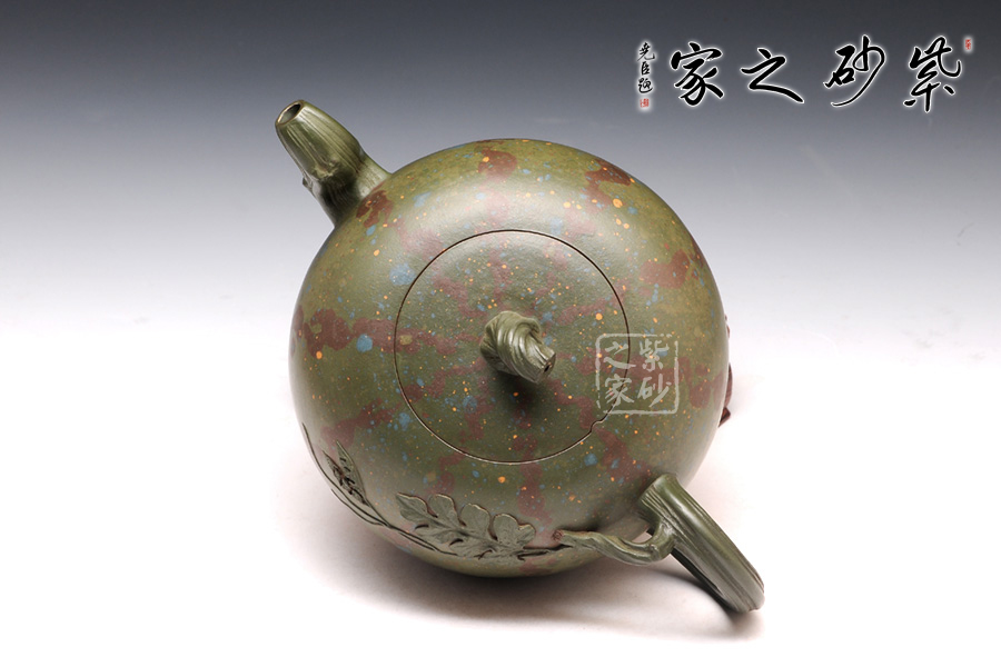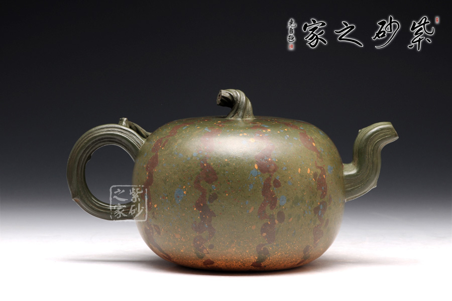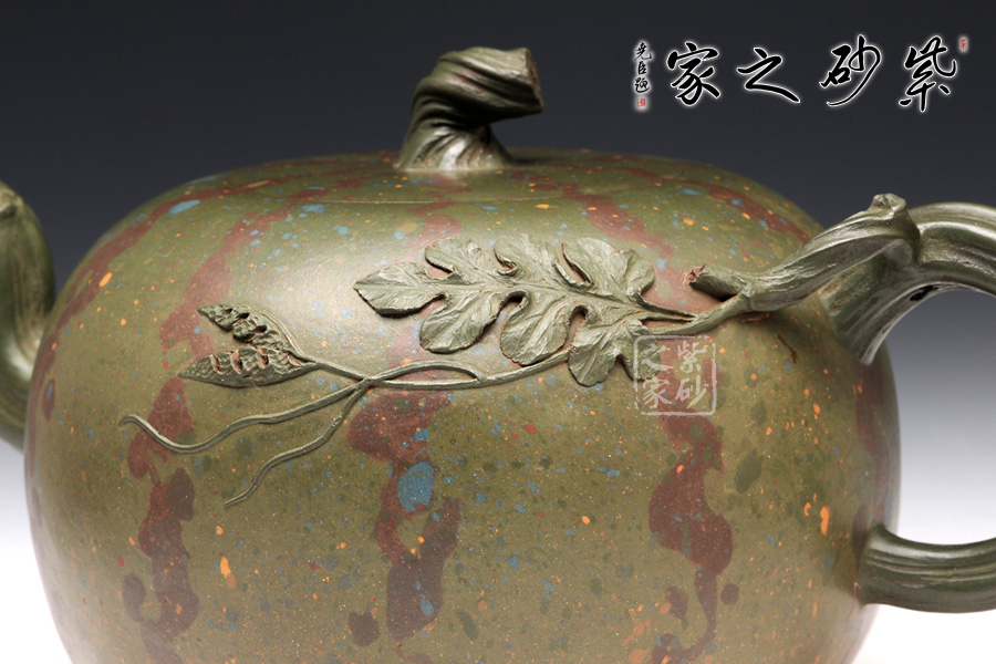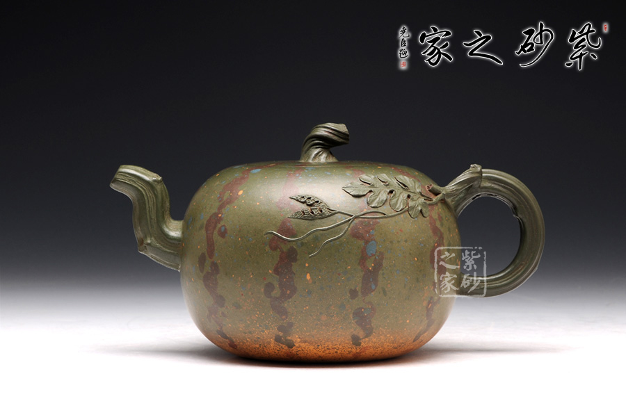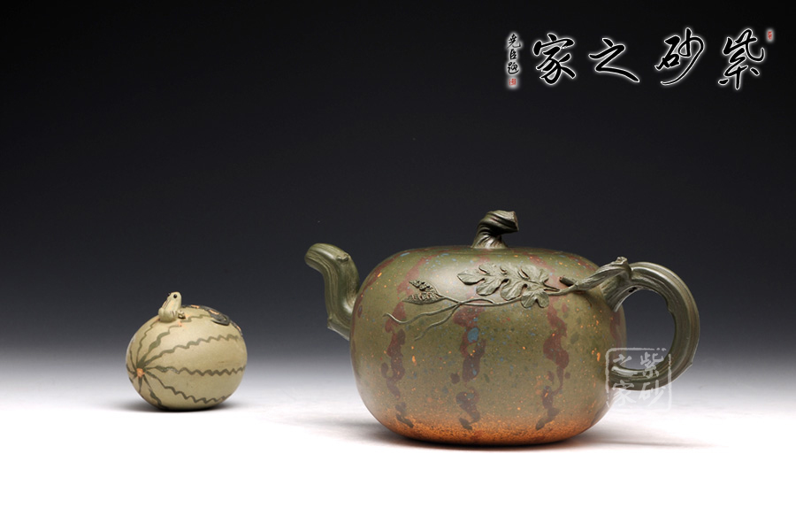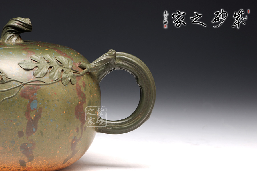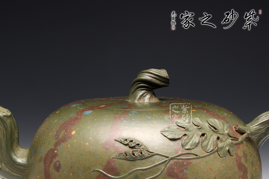此壺為張正中1998年所做,歷久彌新。從來(lái)做花貨,都是要做得生動(dòng)自然,方可算上品,此壺更是如此。壺身為一個(gè)圓形大西瓜,噴繪裝飾,瓜上虎皮斑紋清晰自然。壺把、壺嘴皆以瓜蔓為型,為顯自然,瓜蔓上還有條條筋絡(luò)。壺鈕則是瓜紐形狀,扭得非常樸實(shí)可愛(ài)。更為特別的,是壺身上的那一枝瓜秧,葉片有大有小,觸須長(zhǎng)長(zhǎng)短短,真是把西瓜的形態(tài)表達(dá)得很全面。