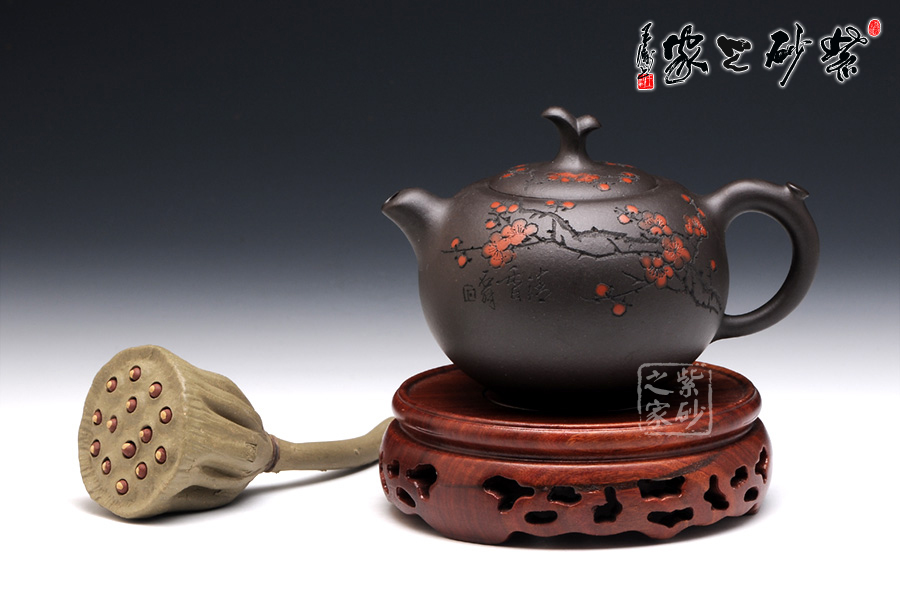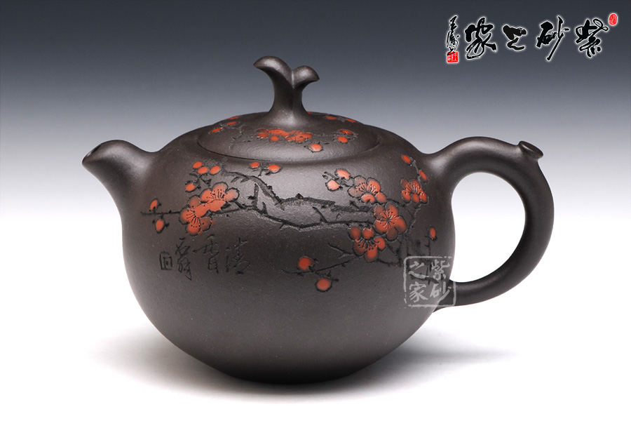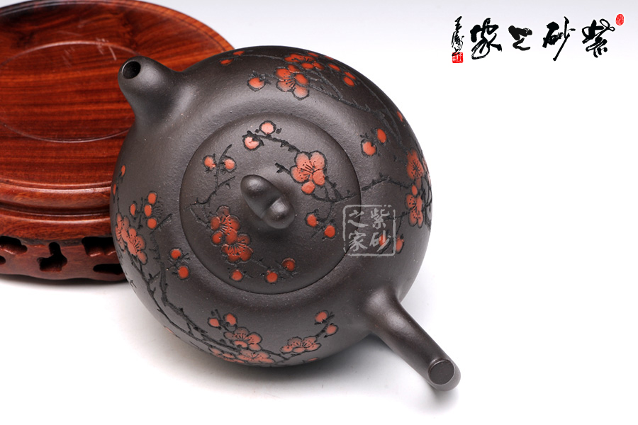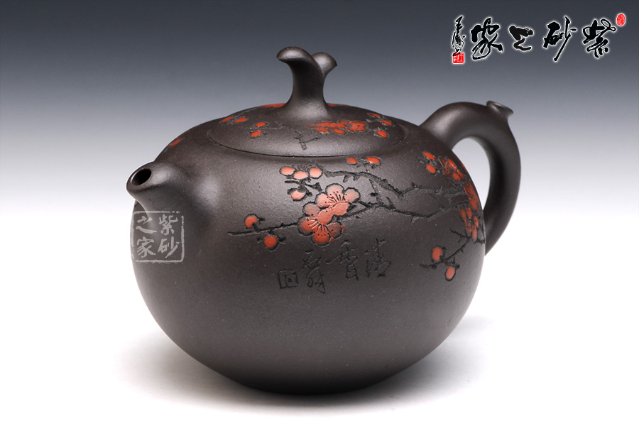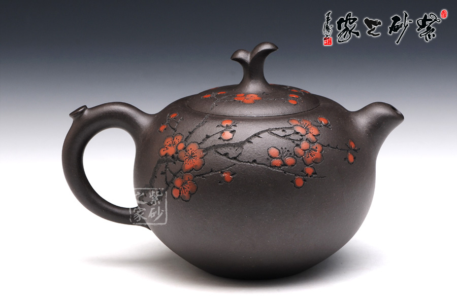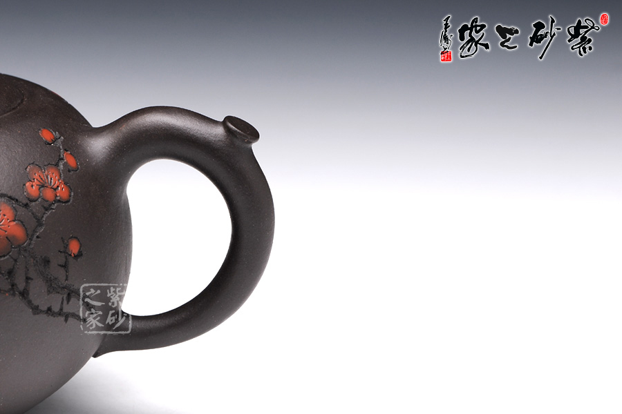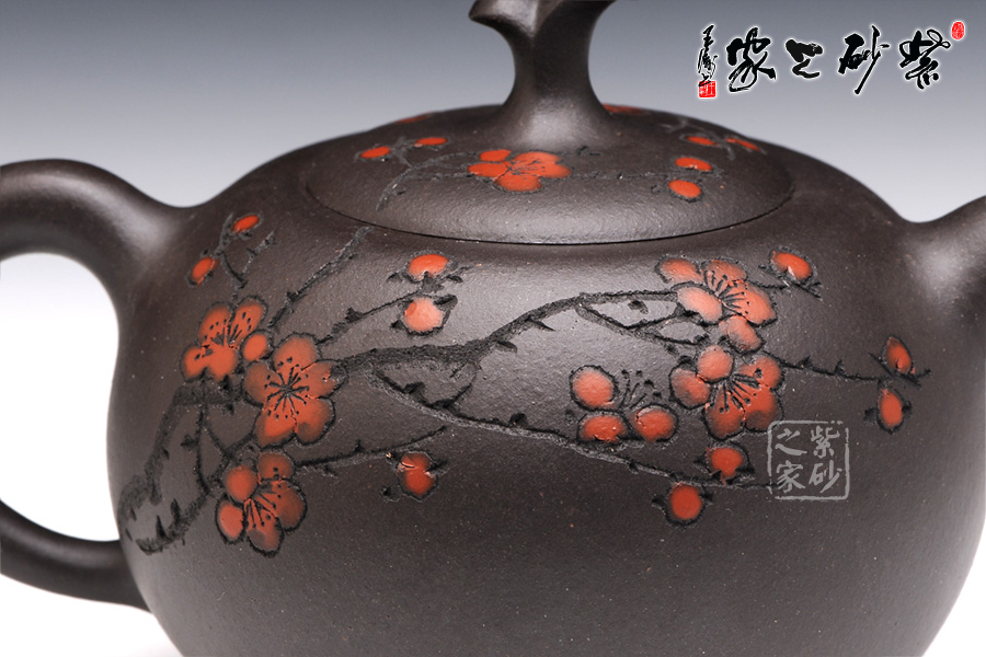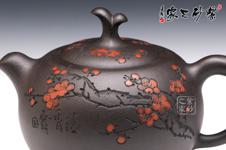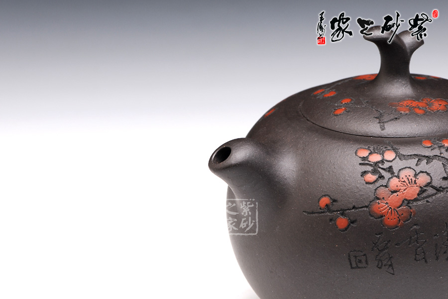 壺身的彩繪梅花非常美艷,但見(jiàn)梅枝四處蔓延,從壺把上延伸開(kāi)來(lái),朵朵梅花爭(zhēng)先盛開(kāi),把春暖大地的美麗表現(xiàn)得淋漓盡致。