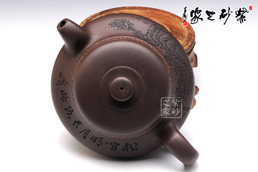 壺身兩面分別刻繪詩詞和山水,正面的是“松間明月長如此”行書,字體飄逸清俊,野趣橫生。背面的山水刻繪以青松、人家、漁船、山崗入畫,更是壺中有畫,畫入壺中。