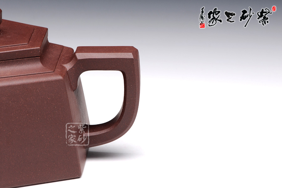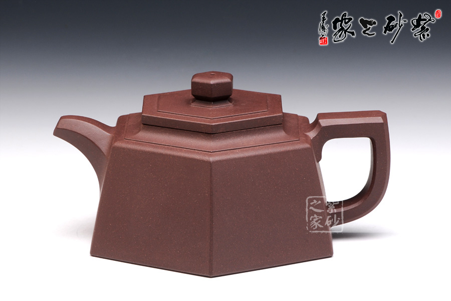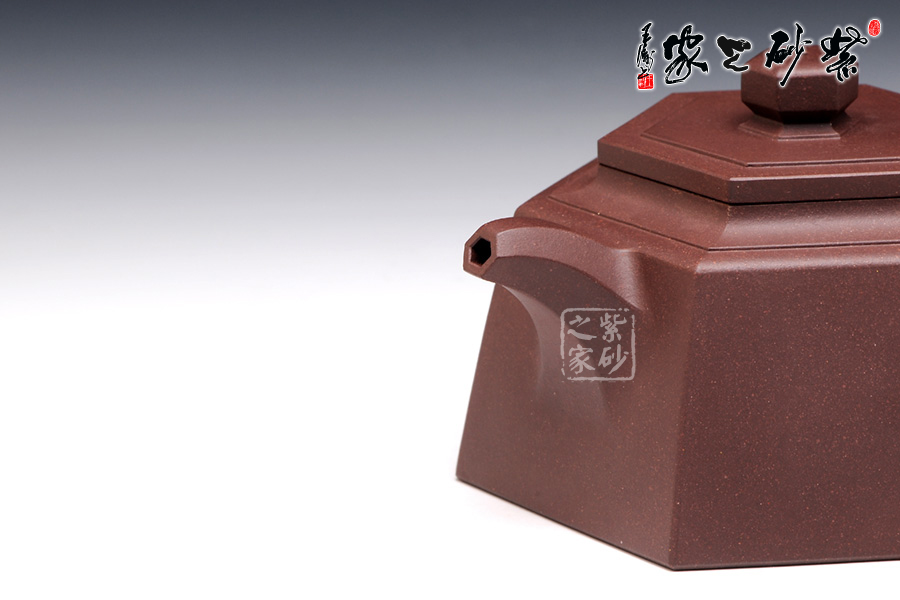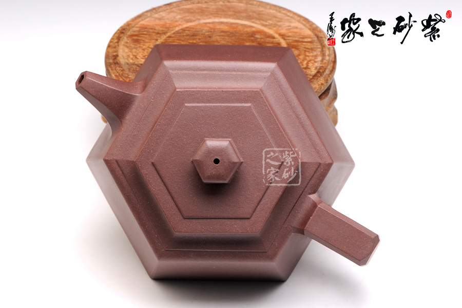 壺身上小下大,六方造型一絲不茍,工整精細,足見制作難度和用心程度。壺肩至壺蓋部分過度平滑,六邊形線條同心環(huán)繞,層次感十足。六方壺鈕制作精巧,非??蓯邸匕押蛪刈煊昧街谱?,但方中有圓,工整且不失圓滑美妙。通身來觀之,此壺大方得體,氣度不凡,是玩壺的佳作。
