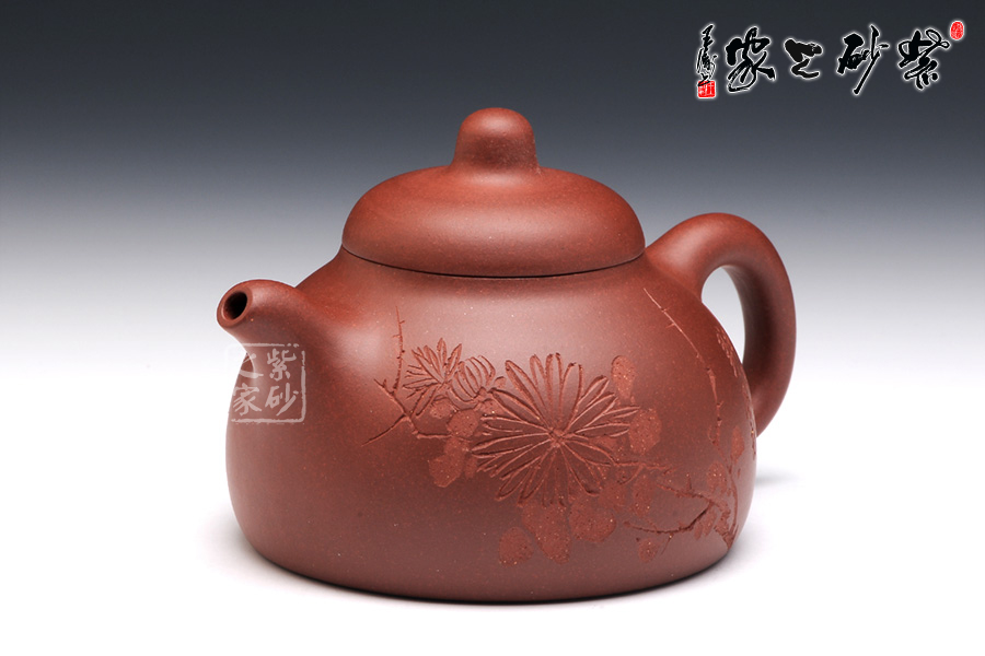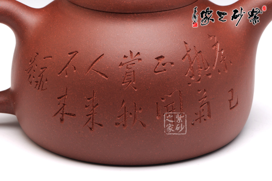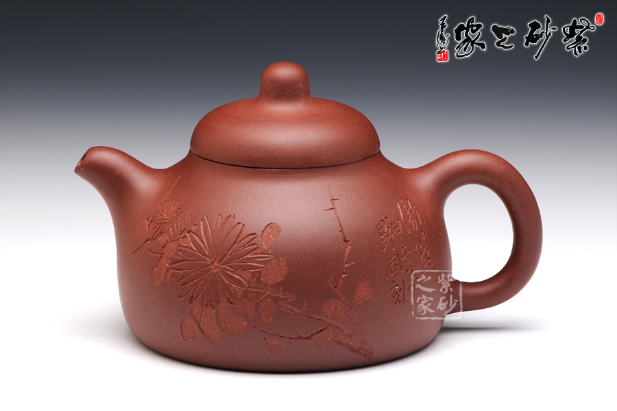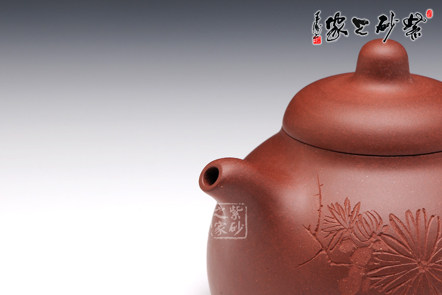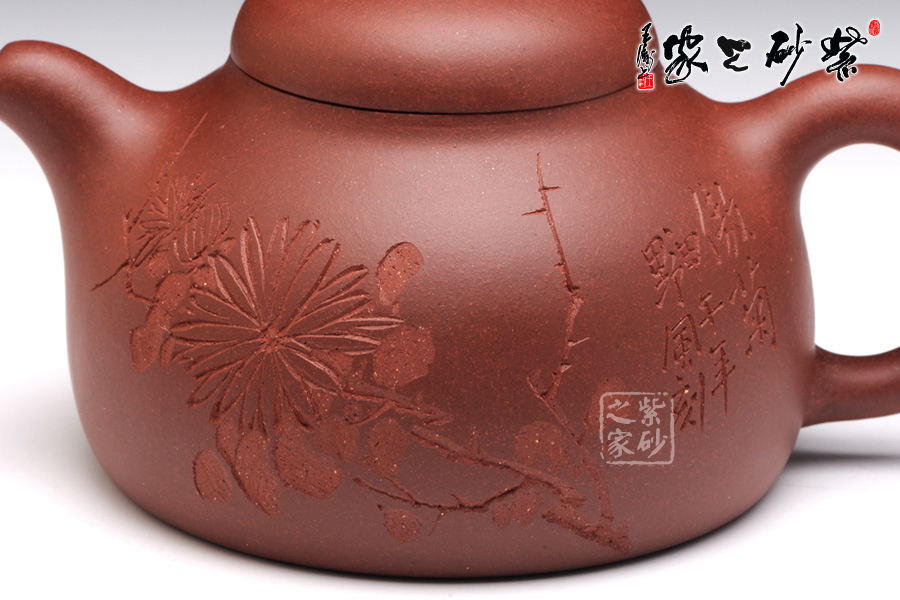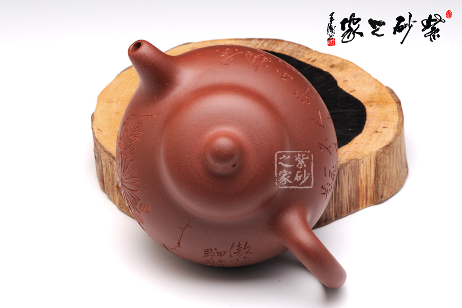 這把壺整個壺型乃是模仿半個匏瓜制作而成,的子就是匏瓜的柄,截蓋恰好在瓢瓜的頸部與壺口對接,嚴(yán)絲合縫,泡茶很實用。一變嘴短促有力,嘴頭齊整如刀裁而成,嘴口細(xì)致,不見鋒芒,所以整個壺嘴與壺體的圓潤所融合。倒把下沉,略呈扁圓形,拿捏在手很適合,應(yīng)該是老師刻意而為。壺身鼓脹飽滿,整把壺盈潤豐腴,很是迷人。壺身刻繪皆出自劉一飛之手,正面刻繪的是菊花一朵,傲菊正開,香氣滿懷。壺反面刻繪的是“茶已熟,菊正開,賞秋人,來不來”。