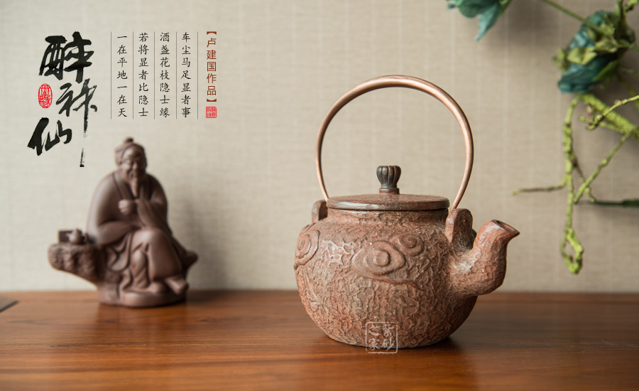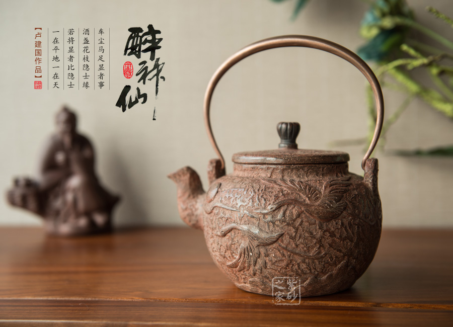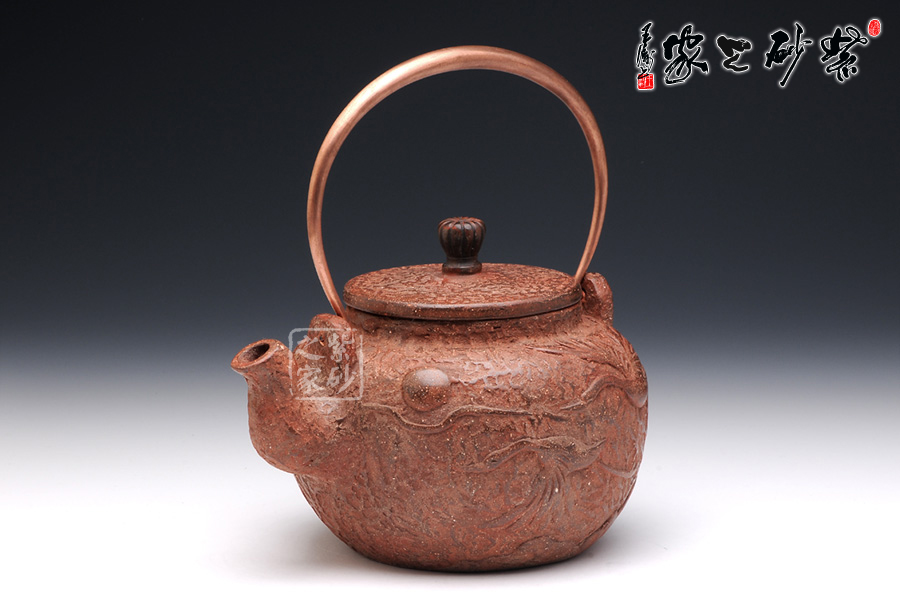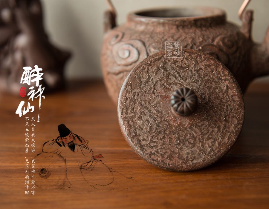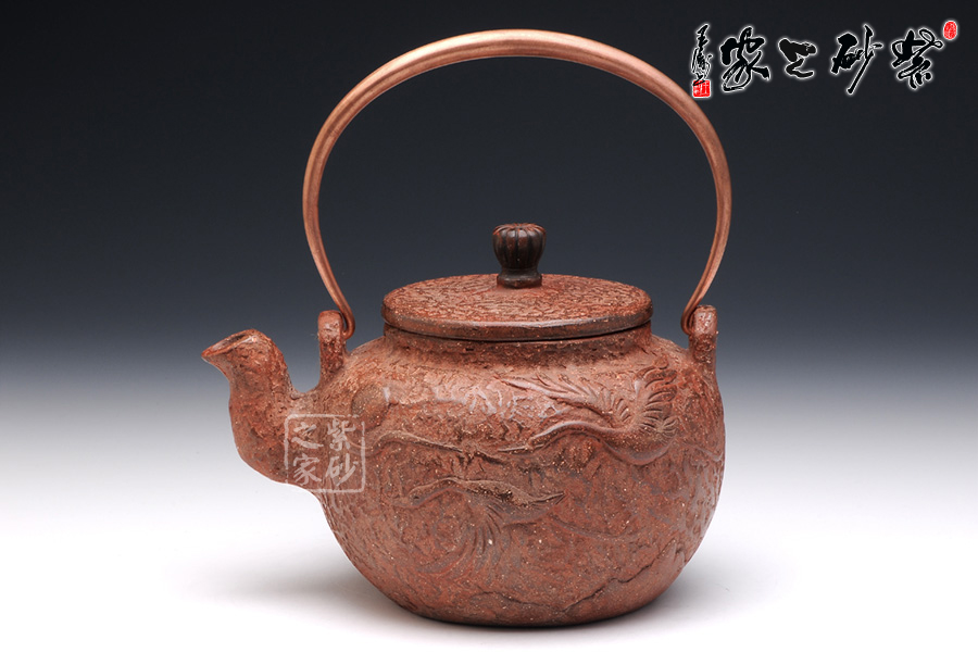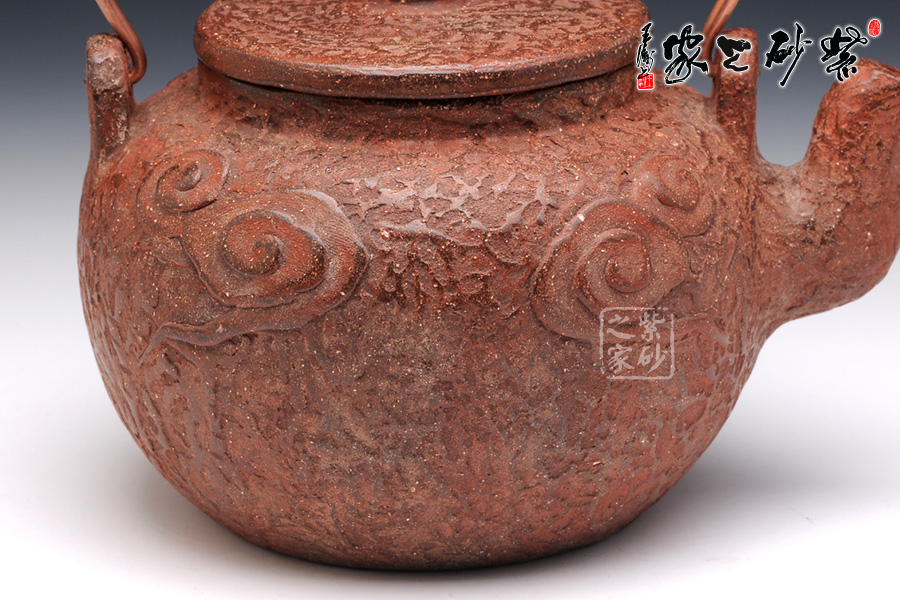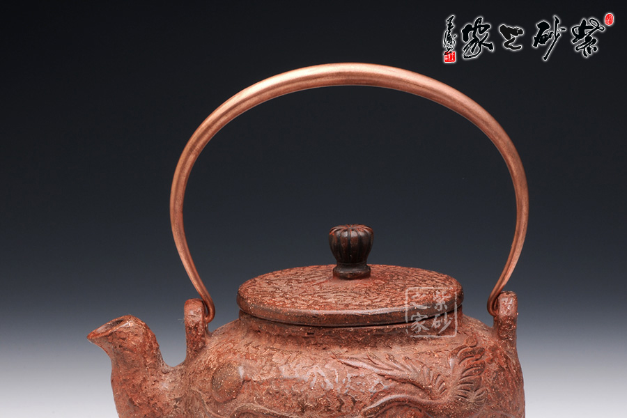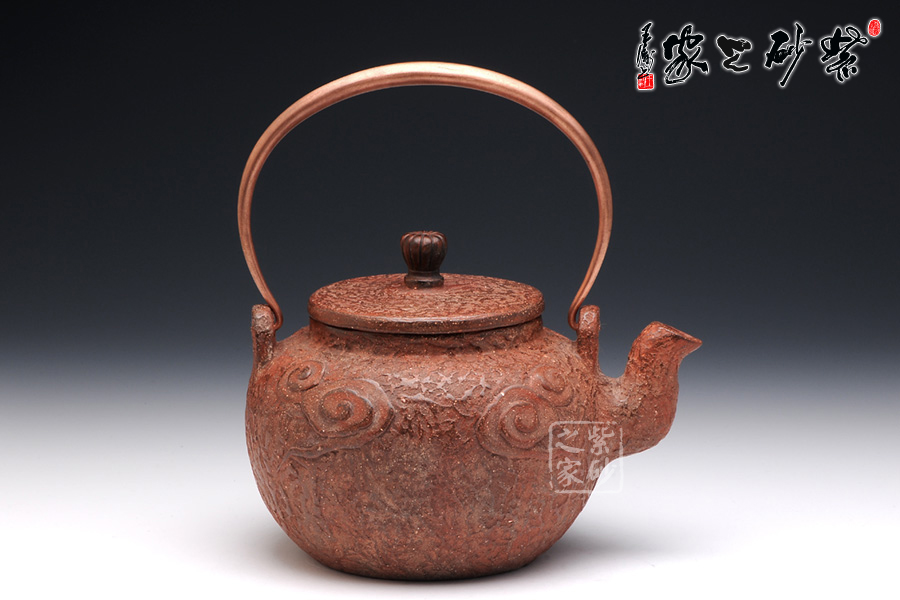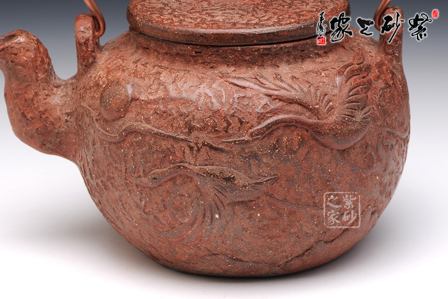 壺型圓中有方,線條大方。平底體設(shè)計沉穩(wěn)實在,壓蓋平滑工整,三彎流壺嘴自然有趣。壺身上的祥云裝飾美麗古樸,仙鶴紅日更寓意美好。金屬提梁把飛離壺身,氣勢不凡。