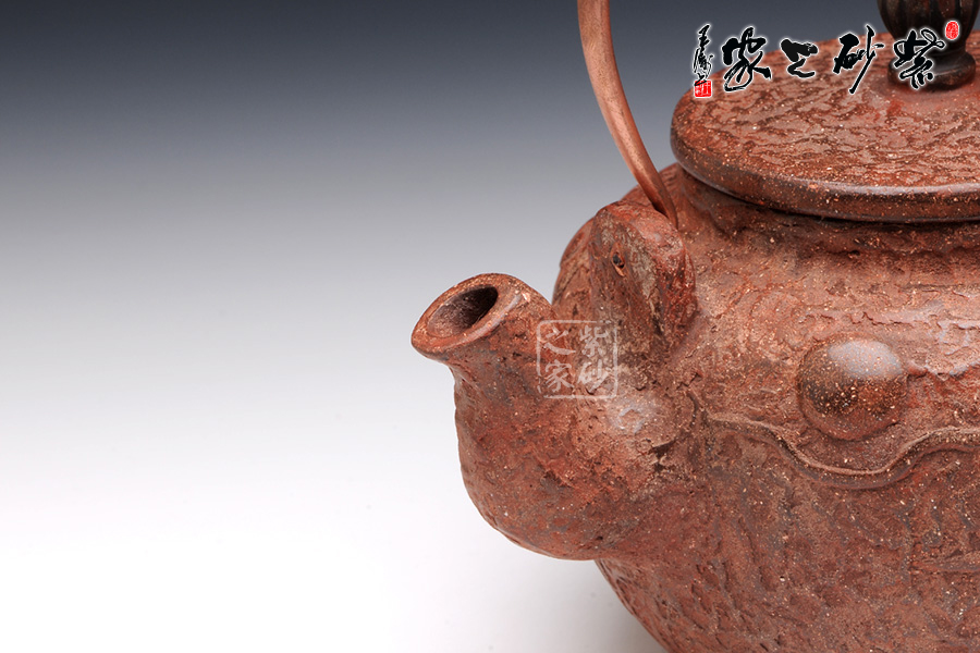 此壺為紫砂仿鐵壺,近幾年刮起了一股日本鐵壺風(fēng),日本鐵壺以其獨有的古樸造型闖入我們的視野,盧建國老師的這幾款紫砂仿鐵壺就是在日本鐵壺的造型而制成 的。壺身也特別仿制了日本鐵壺獨有的不規(guī)則花紋,淺棕色含細玄色顆粒,光彩溫潤討喜。