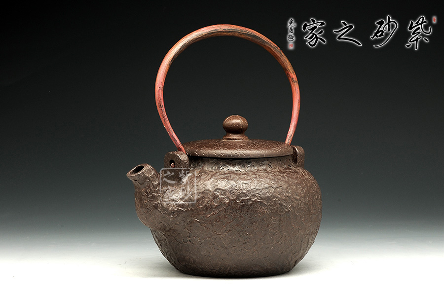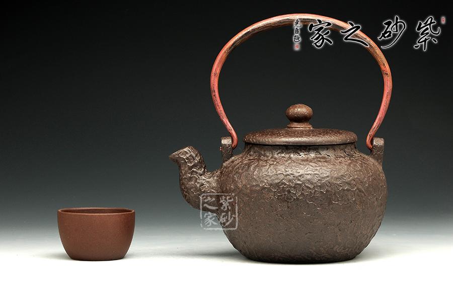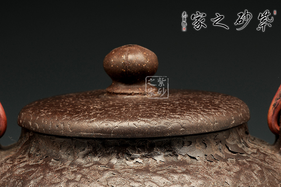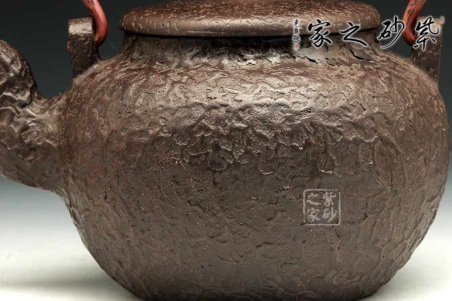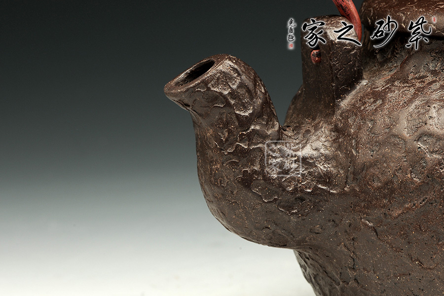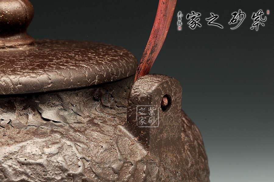 此壺為紫砂仿鐵壺,近幾年刮起了一股日本鐵壺風,日本鐵壺以其獨有的古樸造型闖入我們的視野,盧建國老師的這幾款紫砂仿鐵壺就是在日本鐵壺的造型而制成的。老師精選了與鐵壺顏色相似黑星砂泥料制作而成,壺身也特別仿制了日本鐵壺獨有的不規(guī)則花紋,淺棕色含細玄色顆粒,光彩溫潤討喜,乃礦中極品。