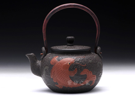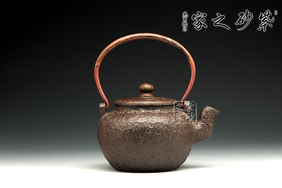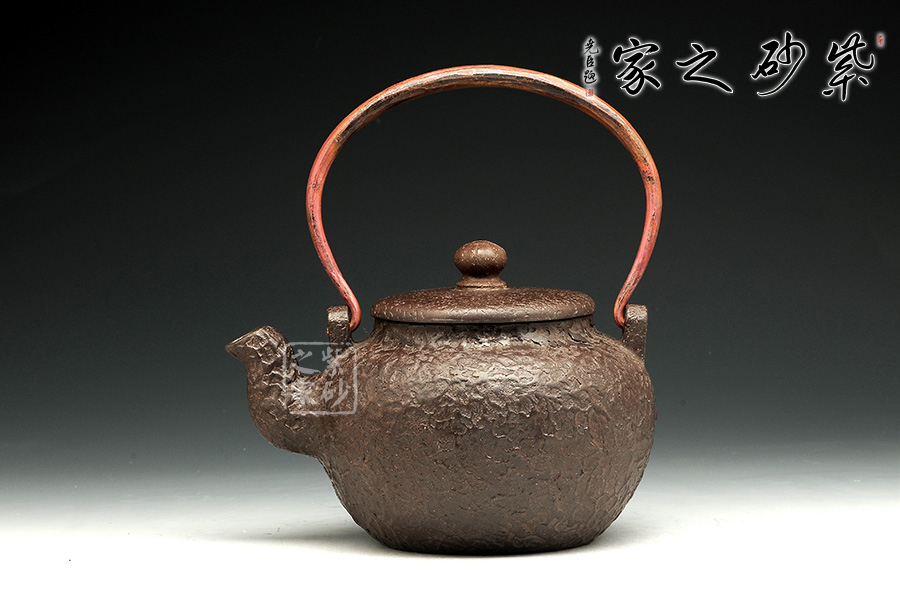 壺身呈圓形,平蓋設計,蓋面平整,完美貼合,氣密性良好,點睛之處在于壺鈕,成皇冠形筋紋狀,十分精巧;經典的三彎流,嘴型古樸蜿蜒,線條優(yōu)雅,出水利落;銅質提梁與色澤神秘沉郁的黑星砂搭配,整體感覺古雅大氣,敦厚穩(wěn)重;此壺做工精細,用料講究,實為收藏之精品。