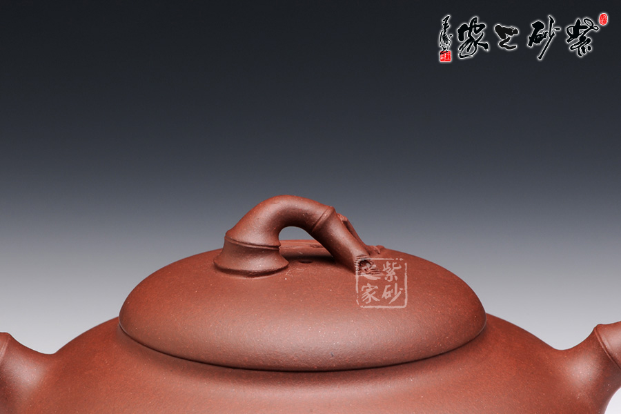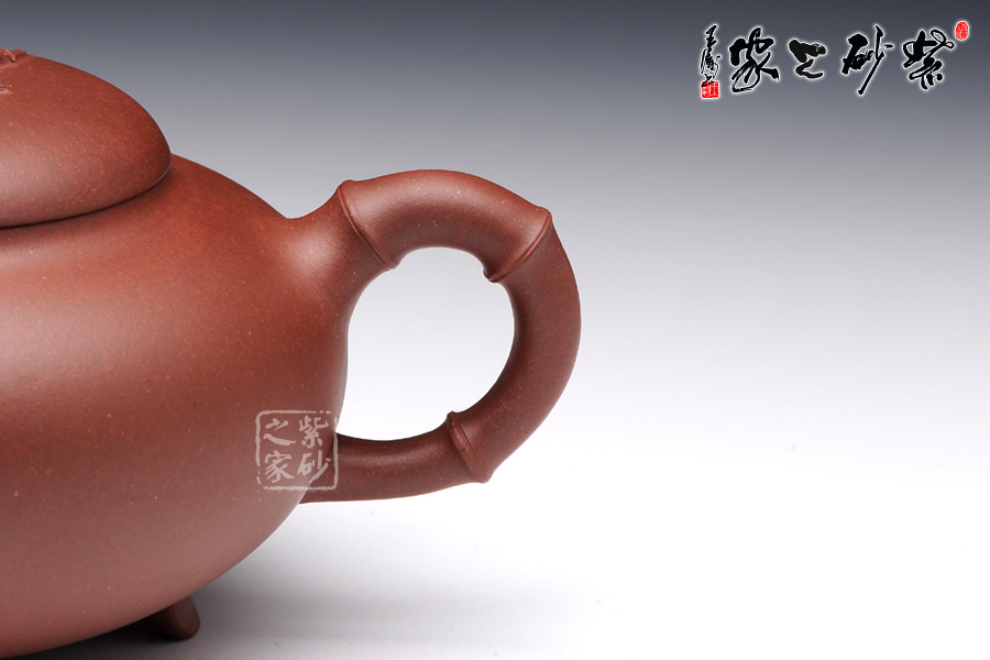 壺身扁圓工整,線條飽滿豐盈,輪廓清晰,似一塊圓滑的玉石。加三鼎足,更顯壺身氣韻不凡。圓滑壺蓋與壺身對(duì)接工整,且造型上與壺身大小相對(duì),工藝美感呼之欲出。壺把、壺嘴和壺鈕的設(shè)計(jì)加入竹子元素,使此壺的精美之外又添清新趣味。壺把、壺嘴上的竹節(jié)紋理逼真自然,壺鈕上的竹葉生動(dòng)真實(shí),著實(shí)讓人贊嘆。
