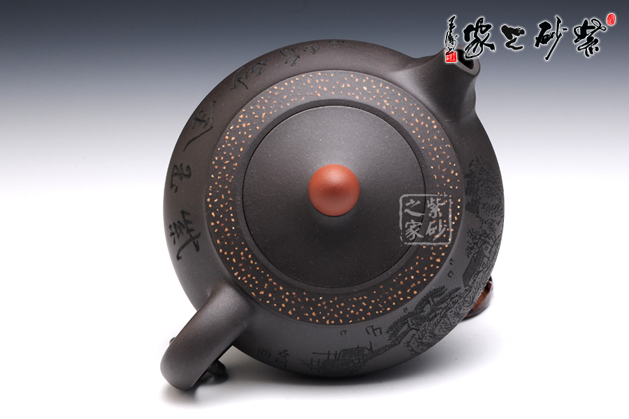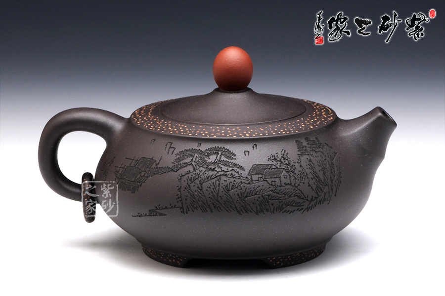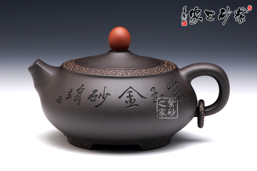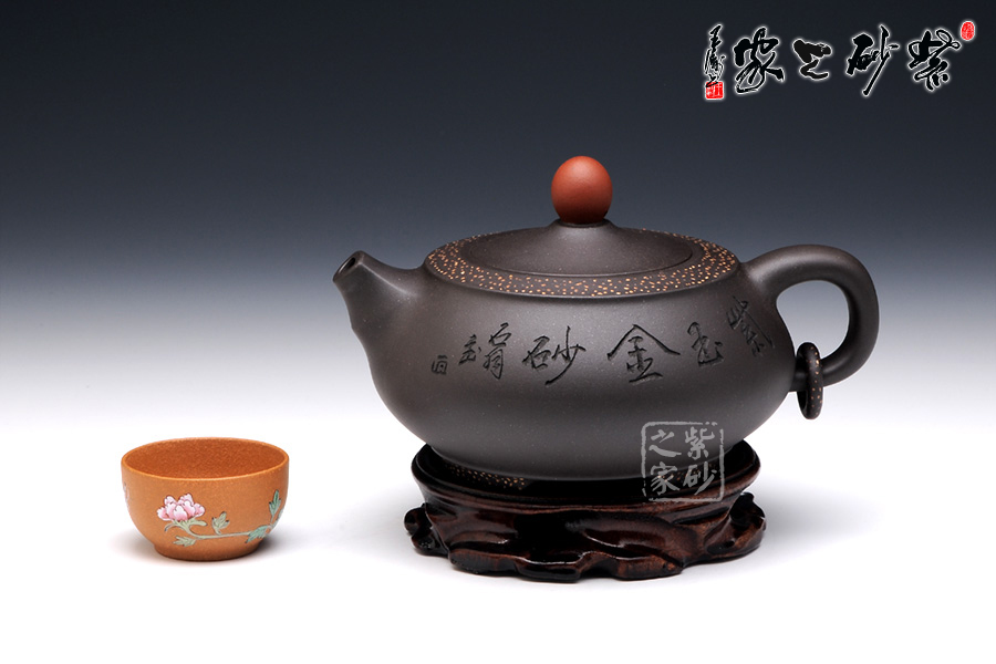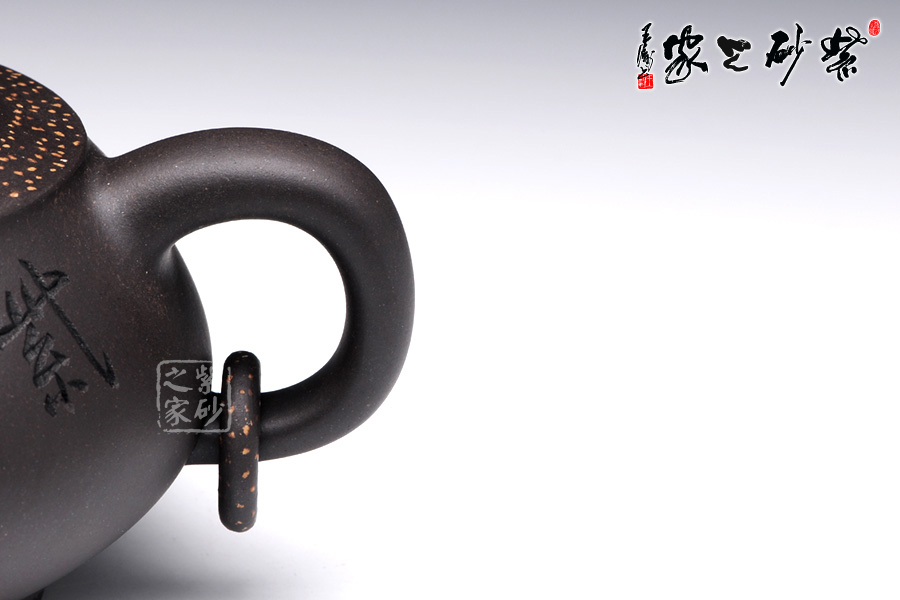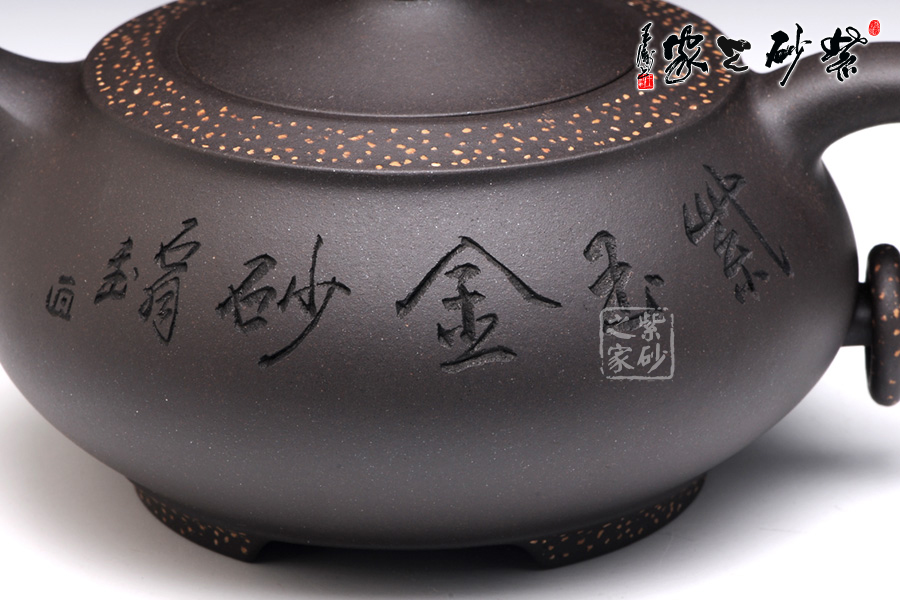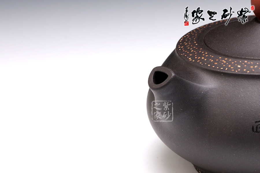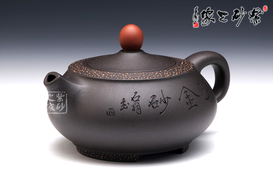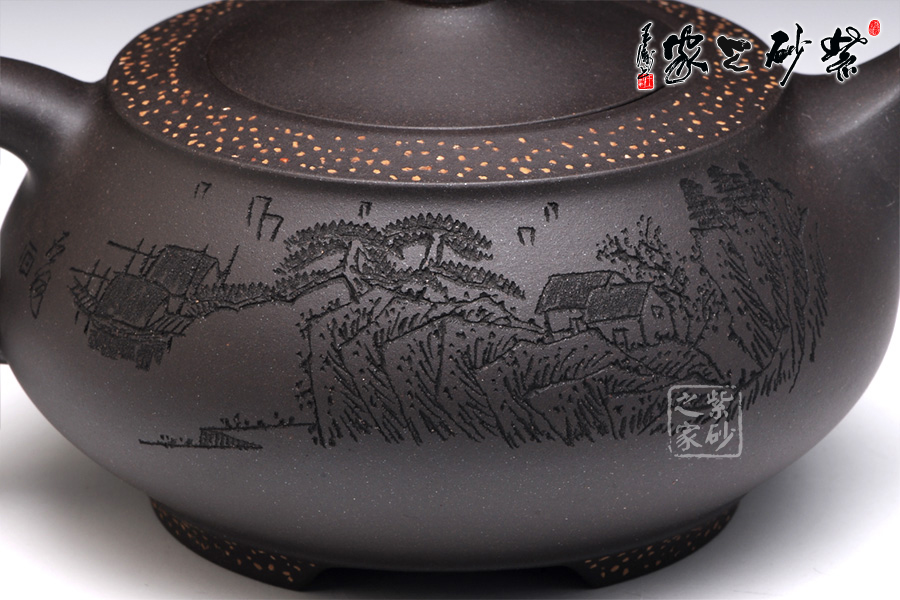 此壺精選原礦黑泥制作而成,仿若在廣袤天際里的一顆善良之星。壺鈕為紅色,喻為鴻運當頭,具有濃厚的祝福之意。壺頸處的金色鋪砂,燦爛別致,更為廣袤的黑際增添一抹亮色,雅致無窮。壺身正面刻繪了“紫玉金砂”,壺反面刻繪的是青山渺渺,近景悠悠,幽深寧靜,情趣無窮。