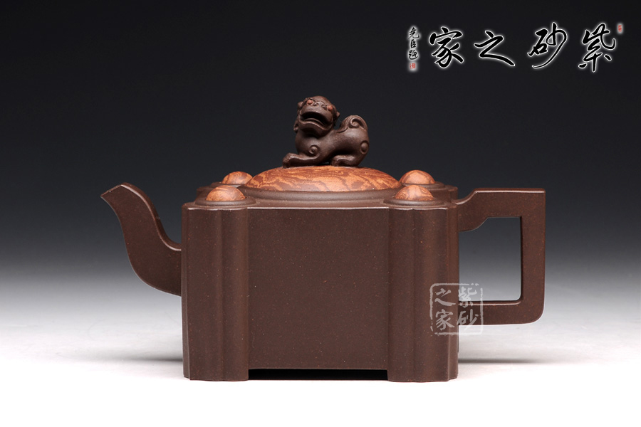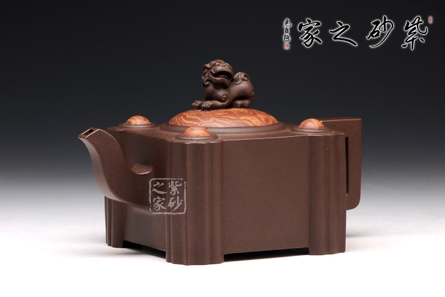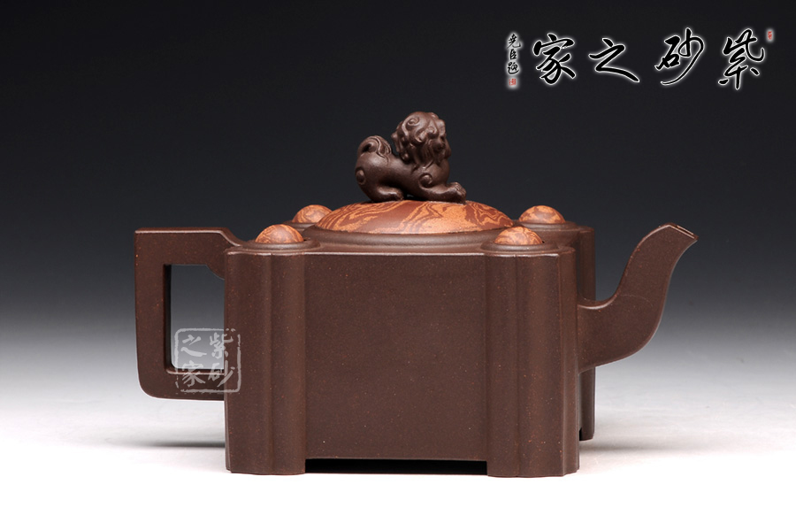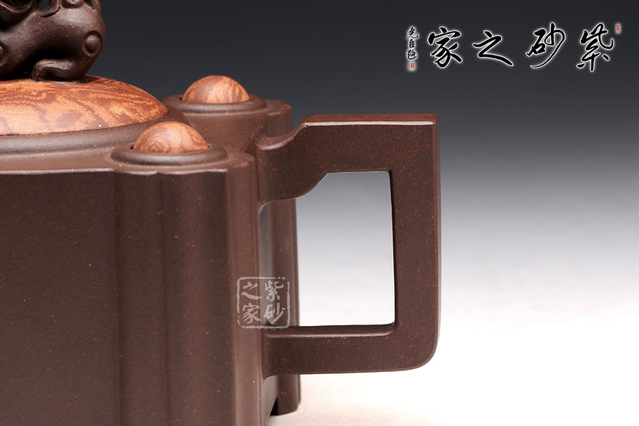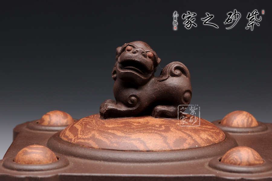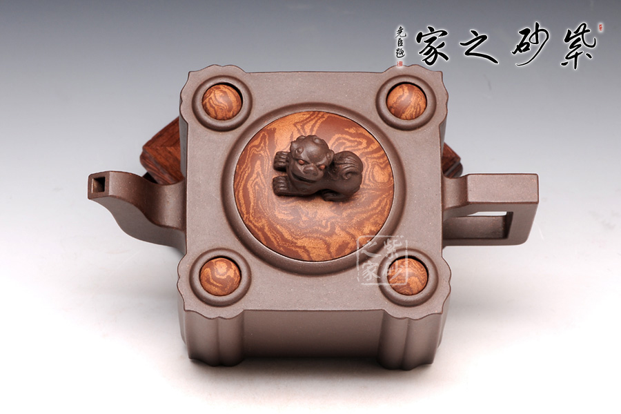 壺身為四方造型,四個角做成柱子模樣,穩(wěn)重踏實,美觀自然。壺蓋嵌入壺身,蓋上用絞泥制作一個繡球。以節(jié)日喜慶、獅子滾繡球而創(chuàng)作,喜耍獅子停立在繡球中央,四個小球分布在棱角上方,代表東南西北,華夏子孫普天同慶。四方壺把和壺嘴前后對應(yīng),工整利落又美觀大方。
