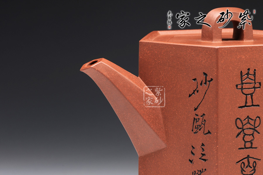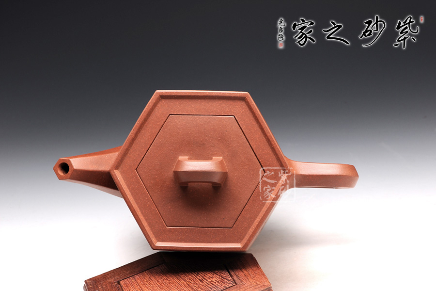長六方型壺身工整勻稱,六個(gè)面和六條邊筆挺光潔,工藝美感十足。嵌蓋工整平滑,方形壺鈕自然美觀。直嘴簡潔利落,粗細(xì)變化均勻有致。長方耳形把美觀大度,氣韻不俗。整體來看,此壺氣度不凡,是為方器的代表作。