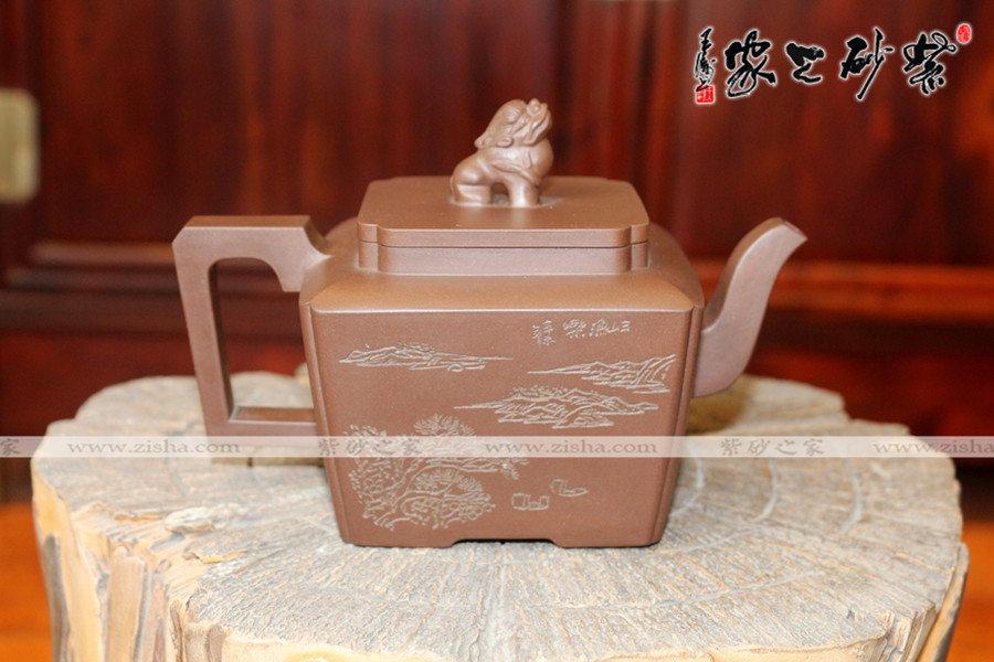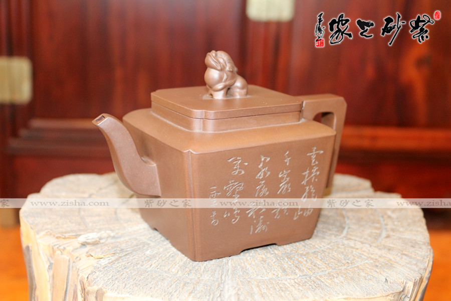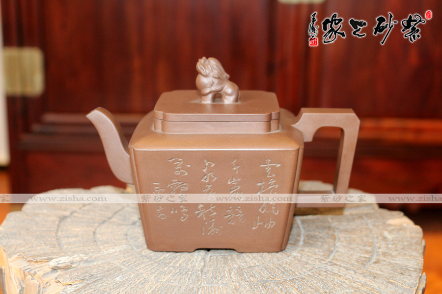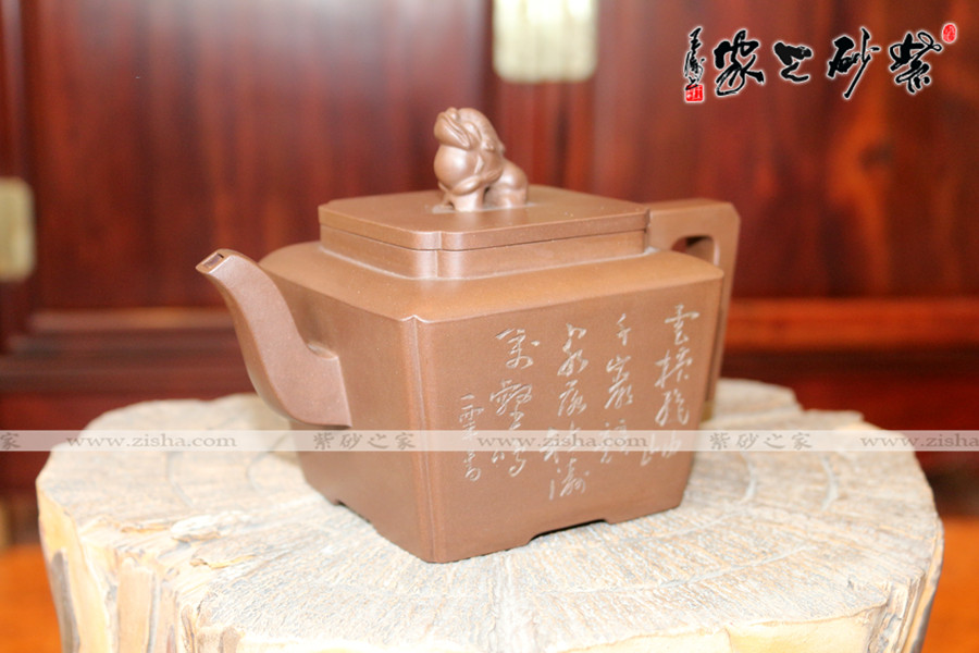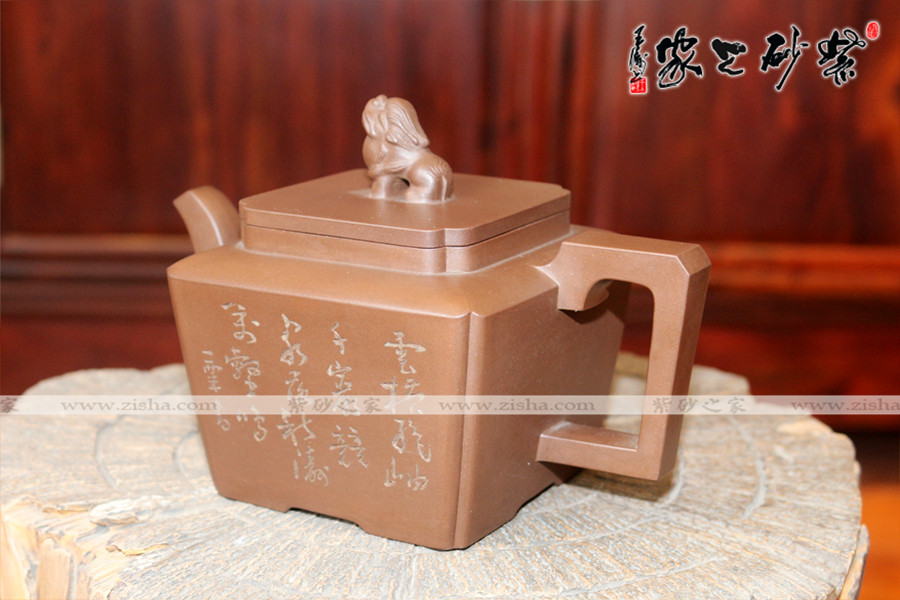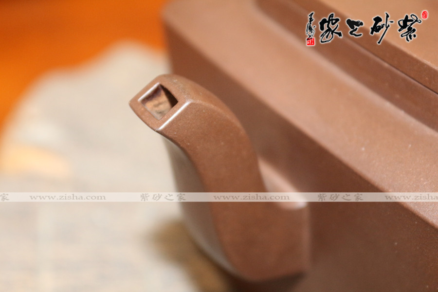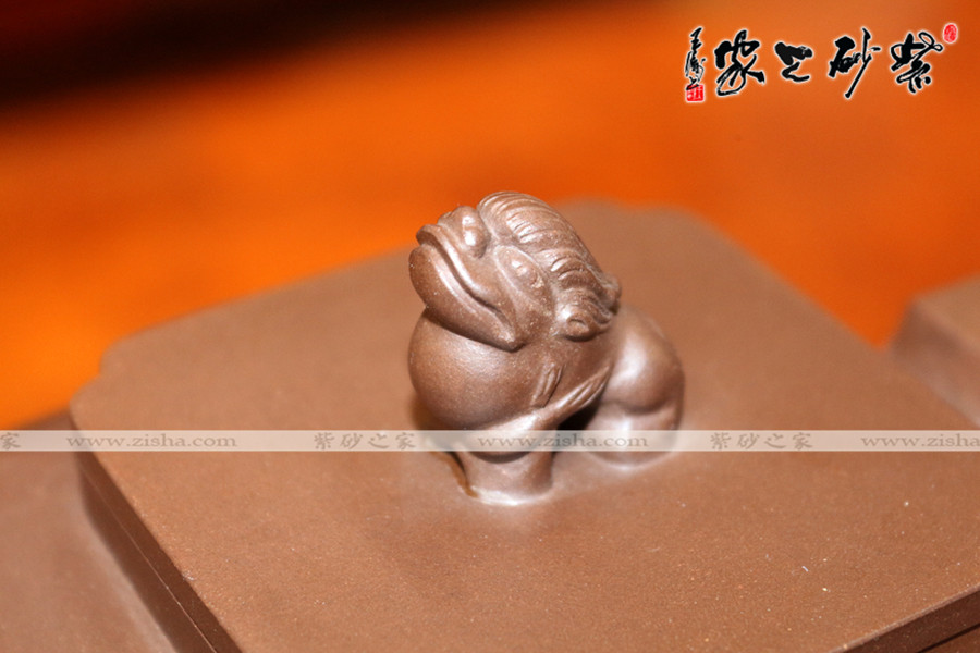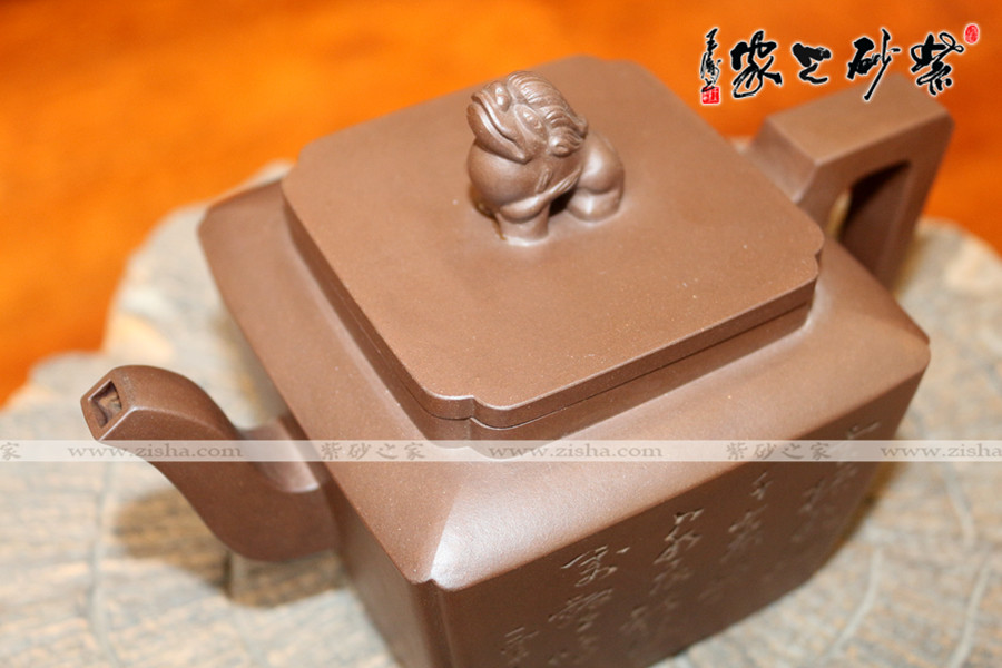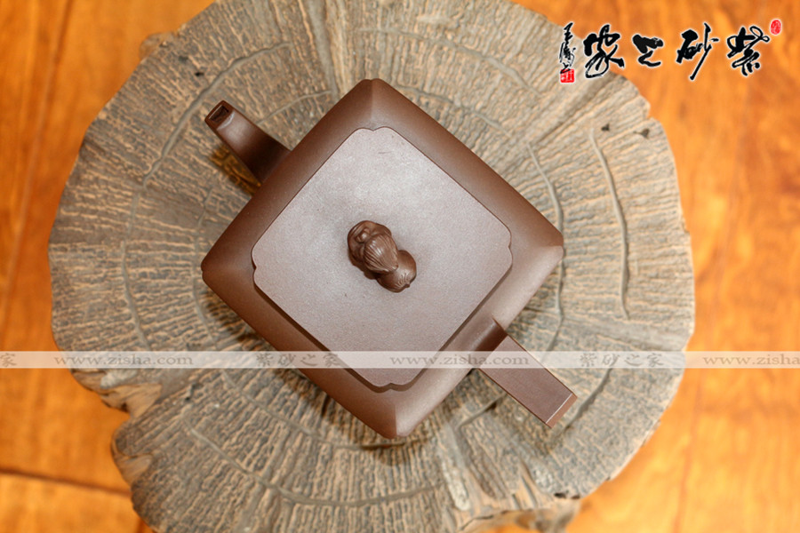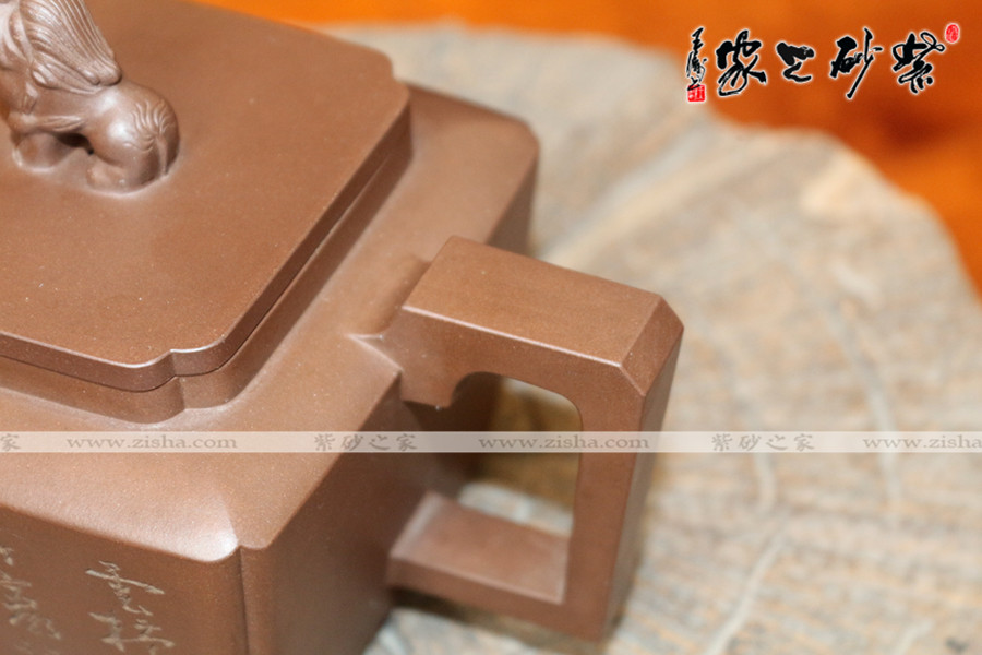 壺身呈四方造型,倒置梯形,上大下小,四面平滑如鏡,工整非常。四條棱為免棱角分明,鋒芒太盛,以兩條線裝飾,從而使端莊中有圓潤。壓蓋平滑美觀,蓋上平滑如鏡,一塵不染。獅子壺鈕美觀逼真,寓意美好。三彎流壺嘴大方美妙,方把工整利落。整體來說,此壺造型端莊大氣,非一般可比。