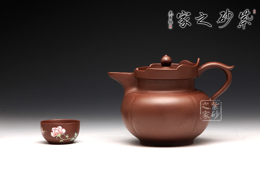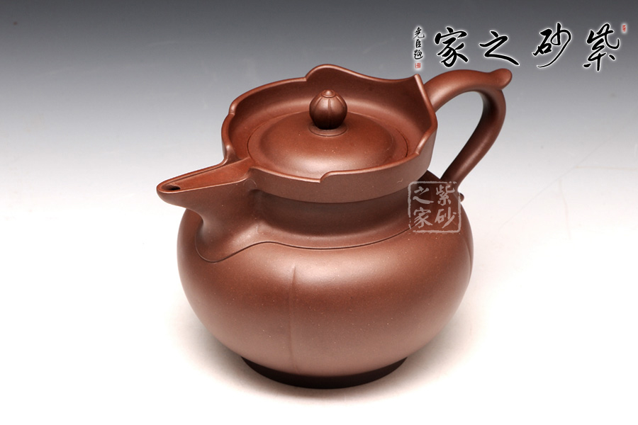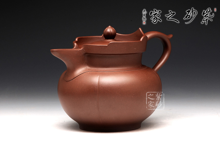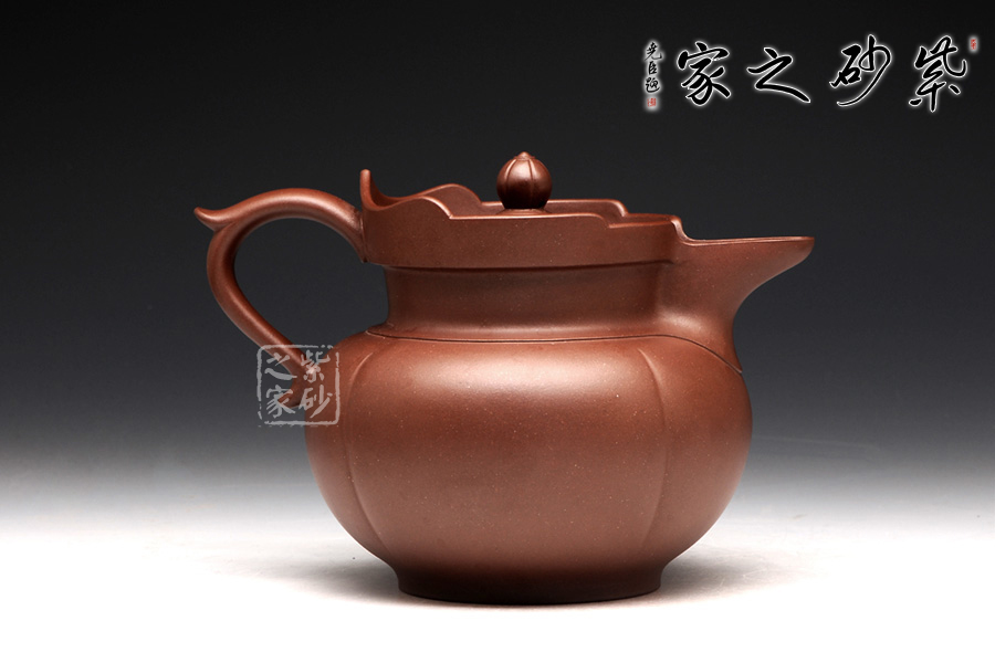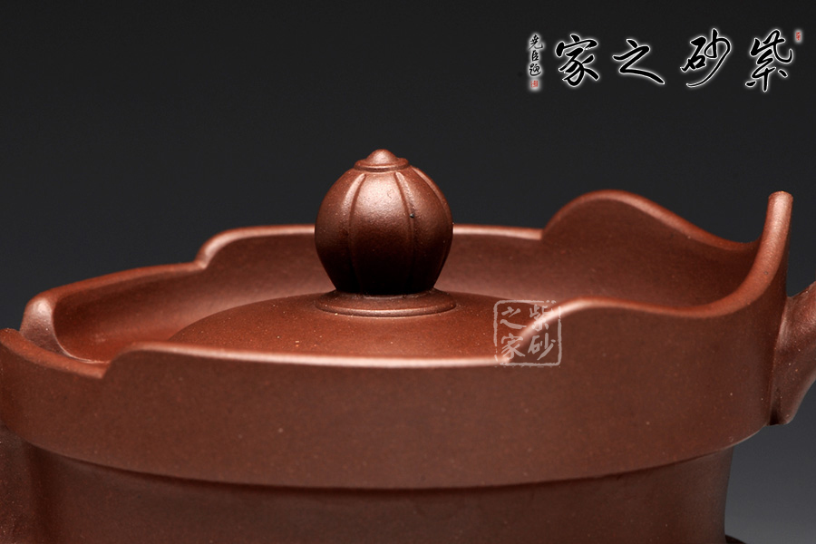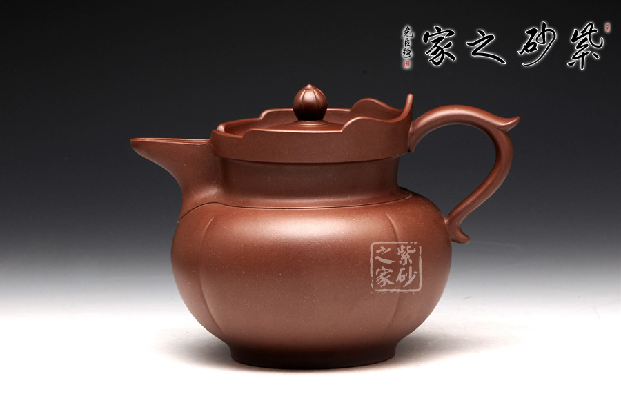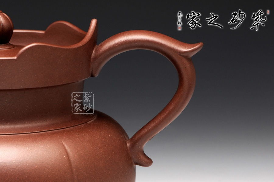 以往的僧帽壺,壺型上下都協(xié)調一致,以方為基礎。此圓僧帽卻是方圓結合,還增加了筋紋的特色。壺身是一個飽滿的圓球型,線條圓潤,輪廓豐盈。圓底圈足,氣韻典雅,筋紋裝飾,層次豐富。壺頸之上的蓮花造型高低分明,嵌蓋上的蓮花壺鈕也小巧美觀。飛把修長,線條優(yōu)雅,與渾圓厚重的壺嘴左右對應,更添趣味。