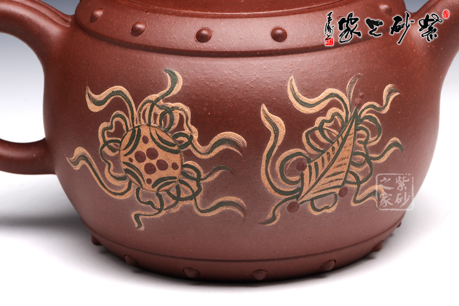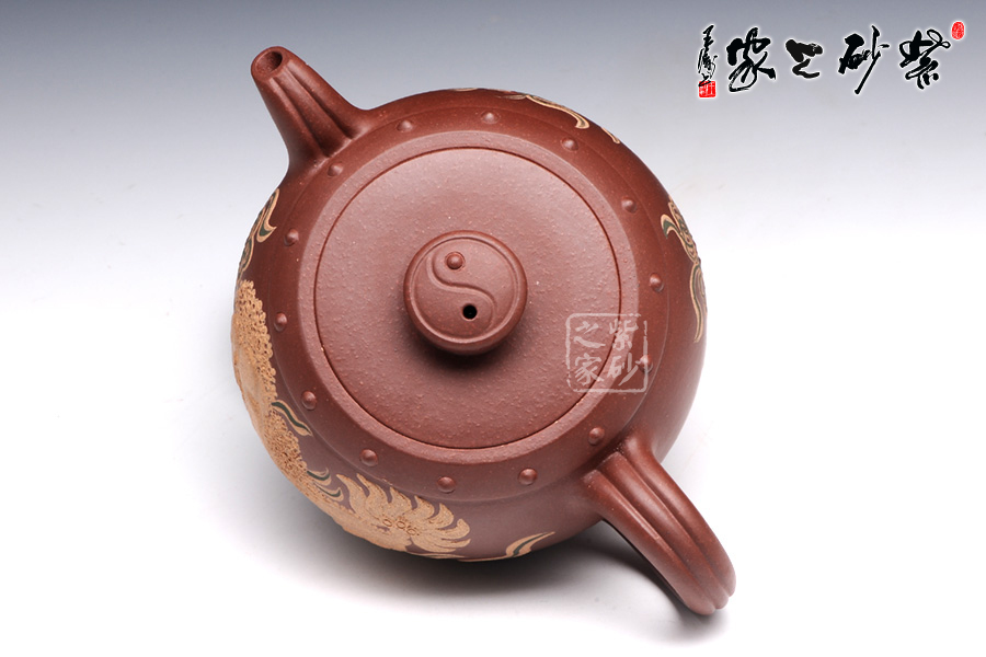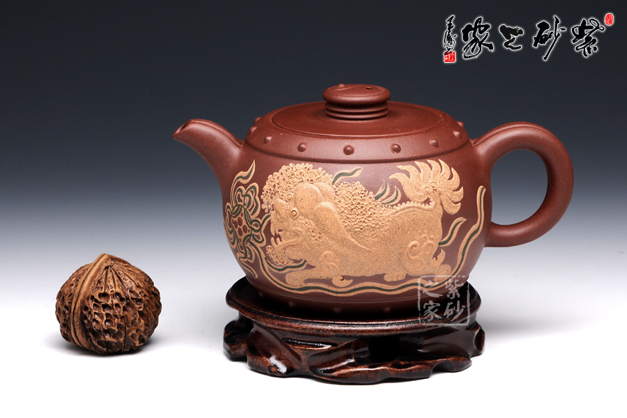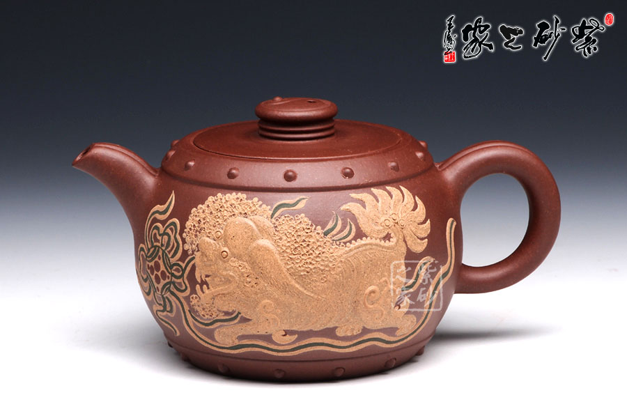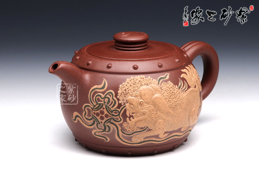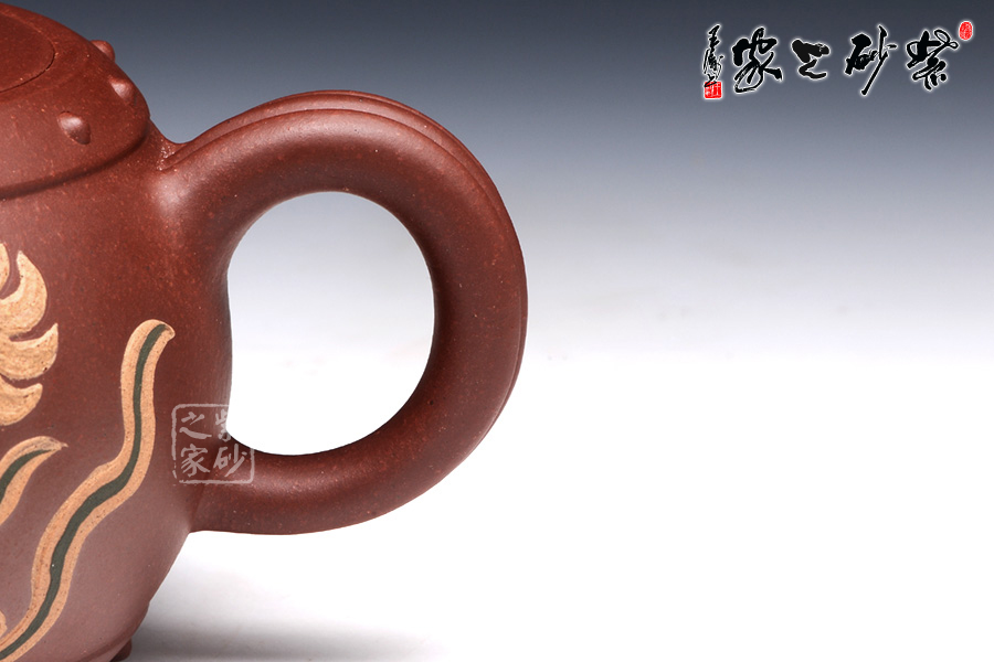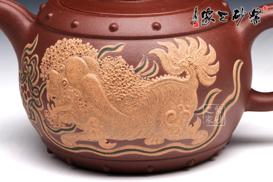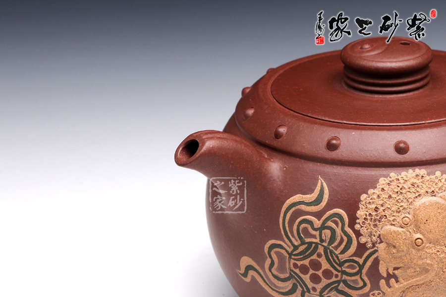 此壺壺鈕型成太極,陰陽兩相宜,烘托其中華文化的博大深邃。整體壺型又好似戰(zhàn)鼓,鼓聲雷雷,寓意繁榮倉盛,而壺身泥繪的金獅戲珠,配合著鼓聲祭祀歡慶,此情此景此聲,讓人動態(tài)十足,身臨其境。老師以壺寄托對中華繁榮盛世的美好祝愿。讓人在把玩之余,感受其內(nèi)涵的魅力??芍^,不可不妙哉!