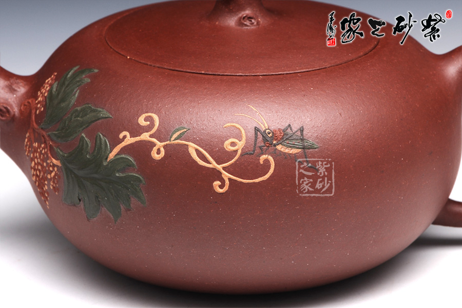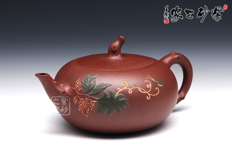 此壺為原礦紫泥制作而成,砂粒均勻,色澤清幽。整器為飽滿的圓器,嵌蓋設計與壺身渾然一體,壺鈕為虬曲的葡萄藤,壺把大方自然,也似藤蔓,上邊節(jié)痕累累,與壺嘴相映成趣。三者相互交映,宛如豐滿的碩果葡萄牽扯著藤蔓枝頭。