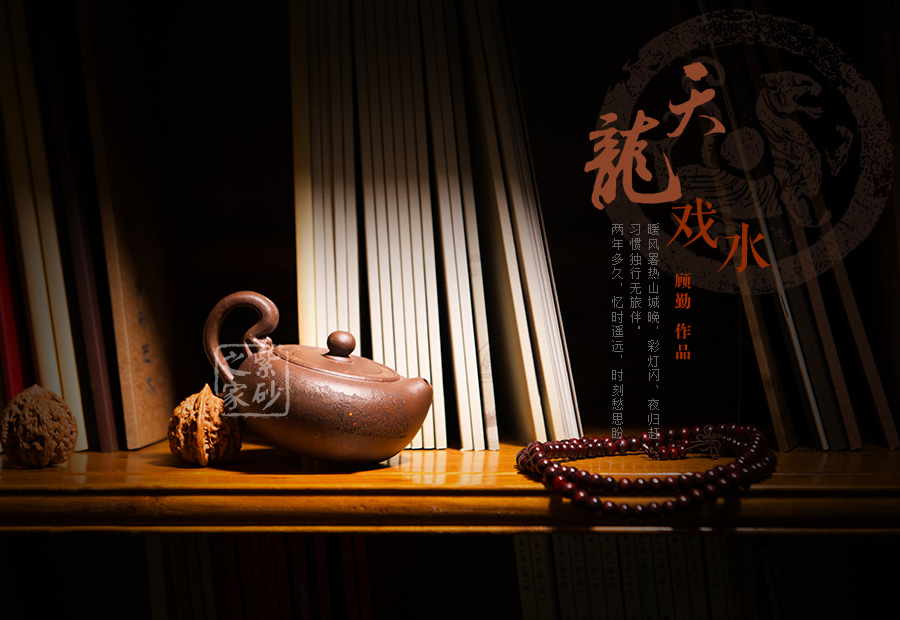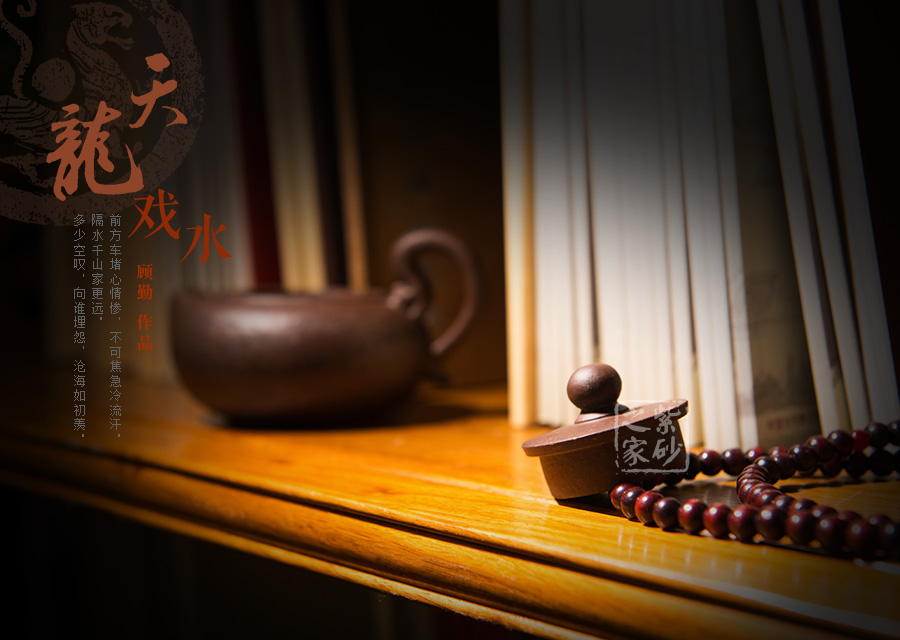 壺身為扁圓造型,圓潤豐滿中有小巧味道,讓人愛不釋手。嵌蓋融入壺身,平整似玉盤一塊。圓珠壺鈕精巧自然,正是珠落玉盤。壺嘴短促,從壺身胥出,氣勢內(nèi)斂。壺把卻飛離壺身,蜿蜒曲折,如天龍戲水,氣勢驚人。
