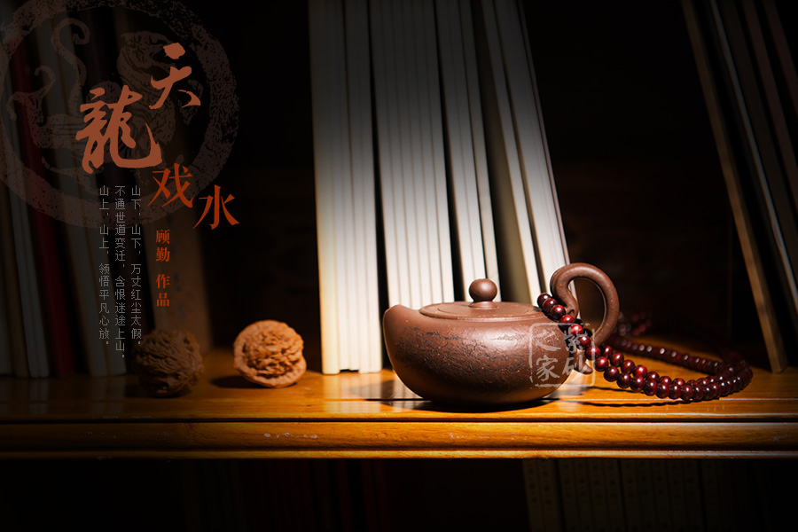 刻繪的山水畫面美觀寫意,韻味無窮;顧紹培大師題詞“清泉洗心”更有無限的清趣。